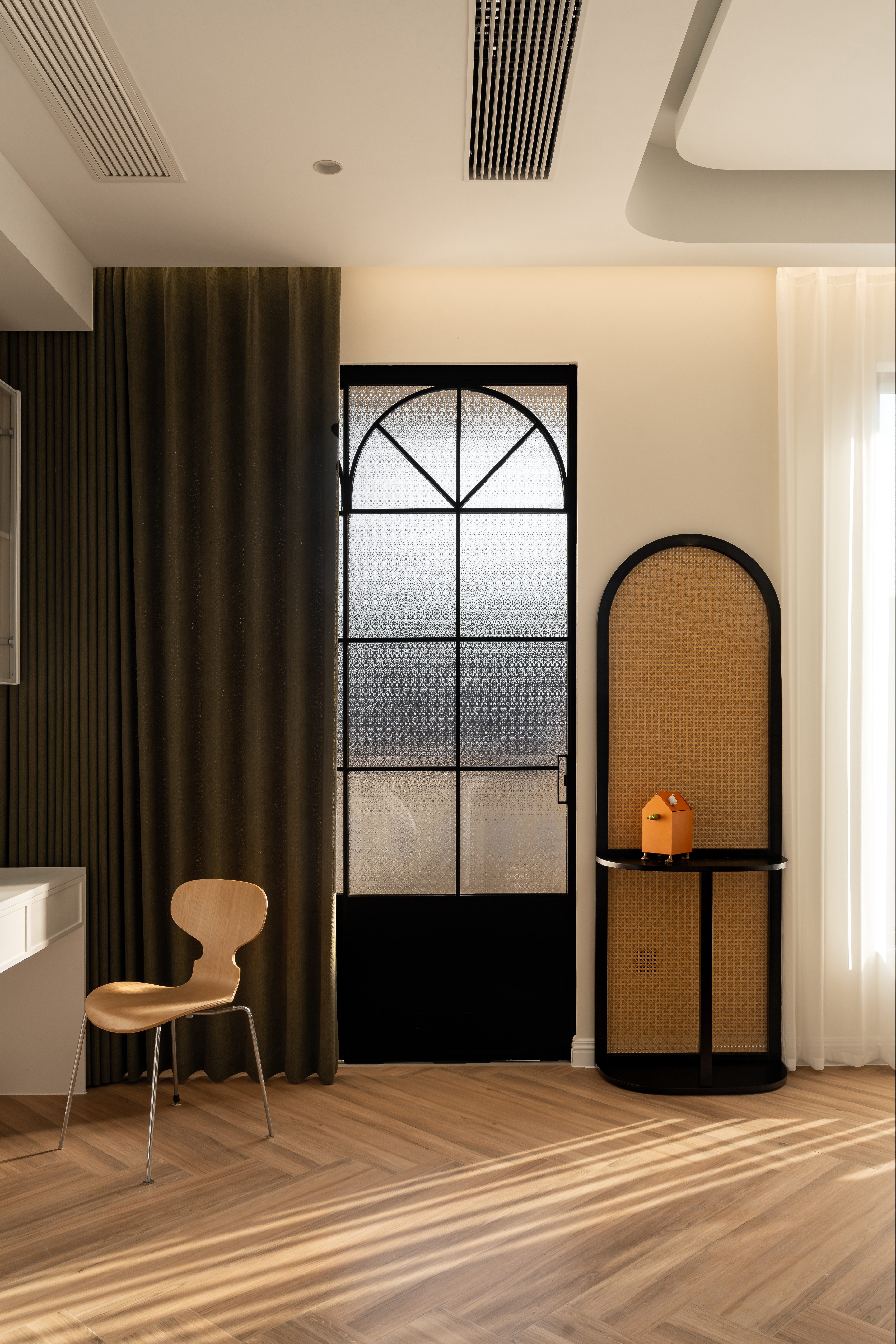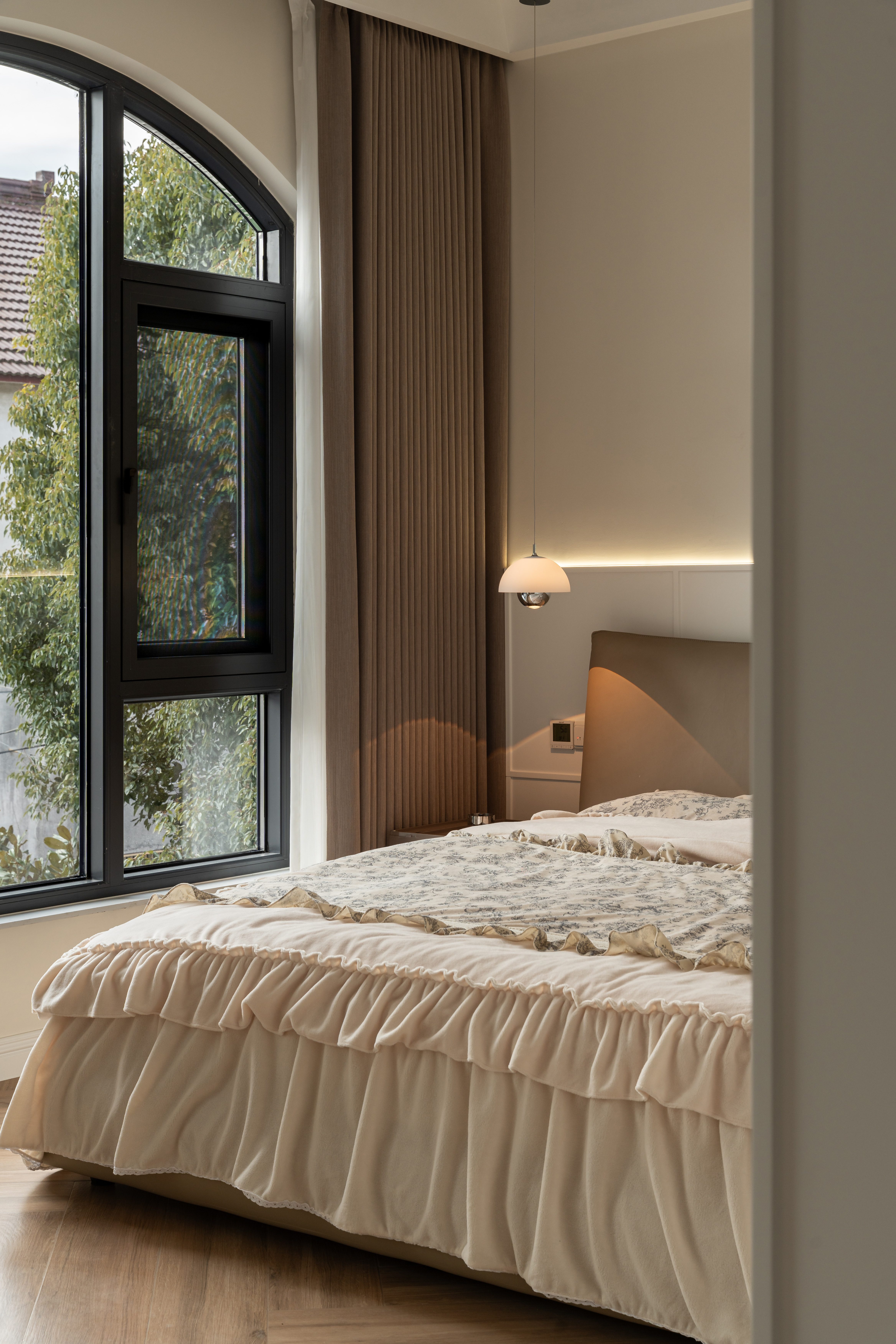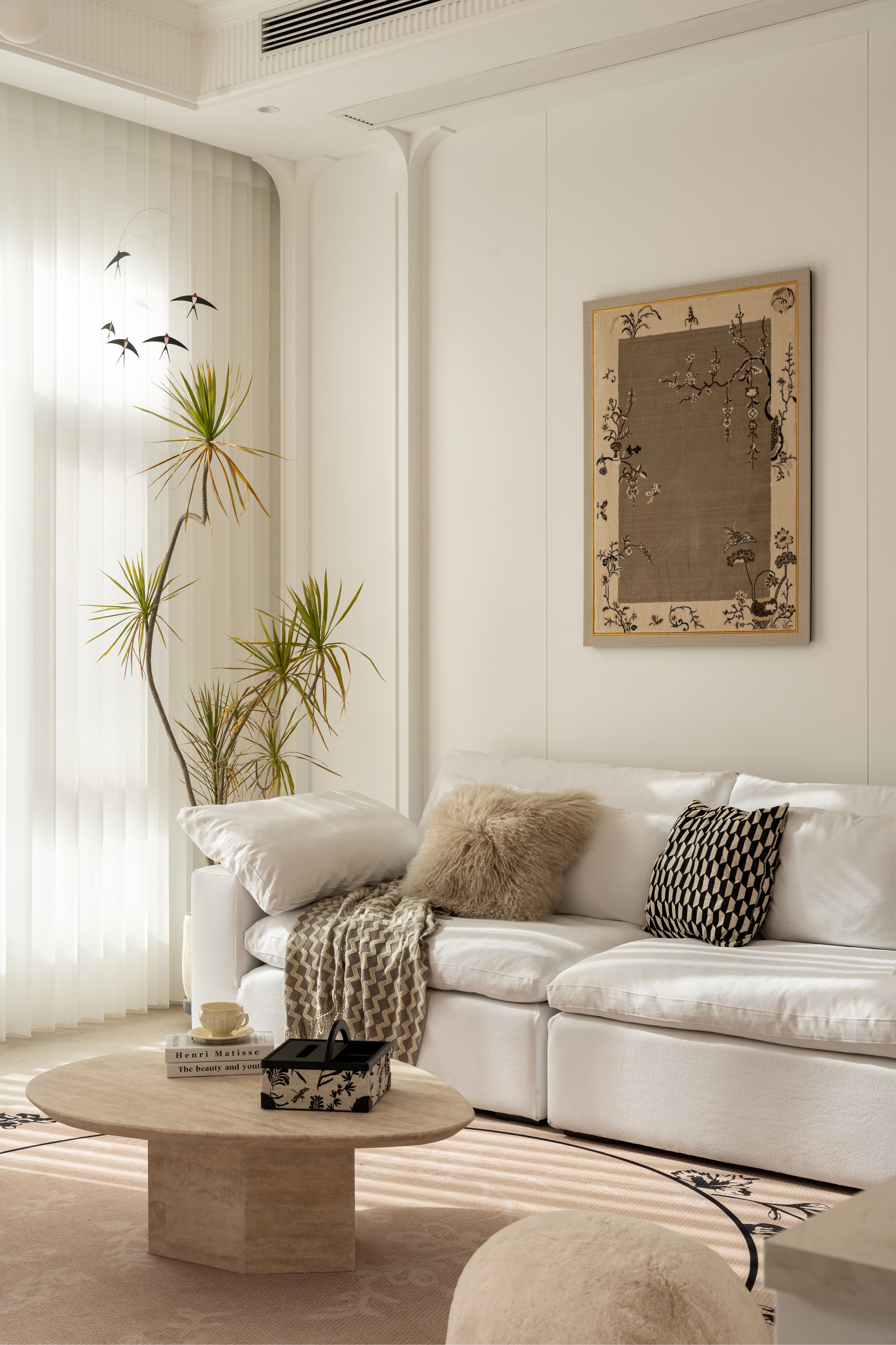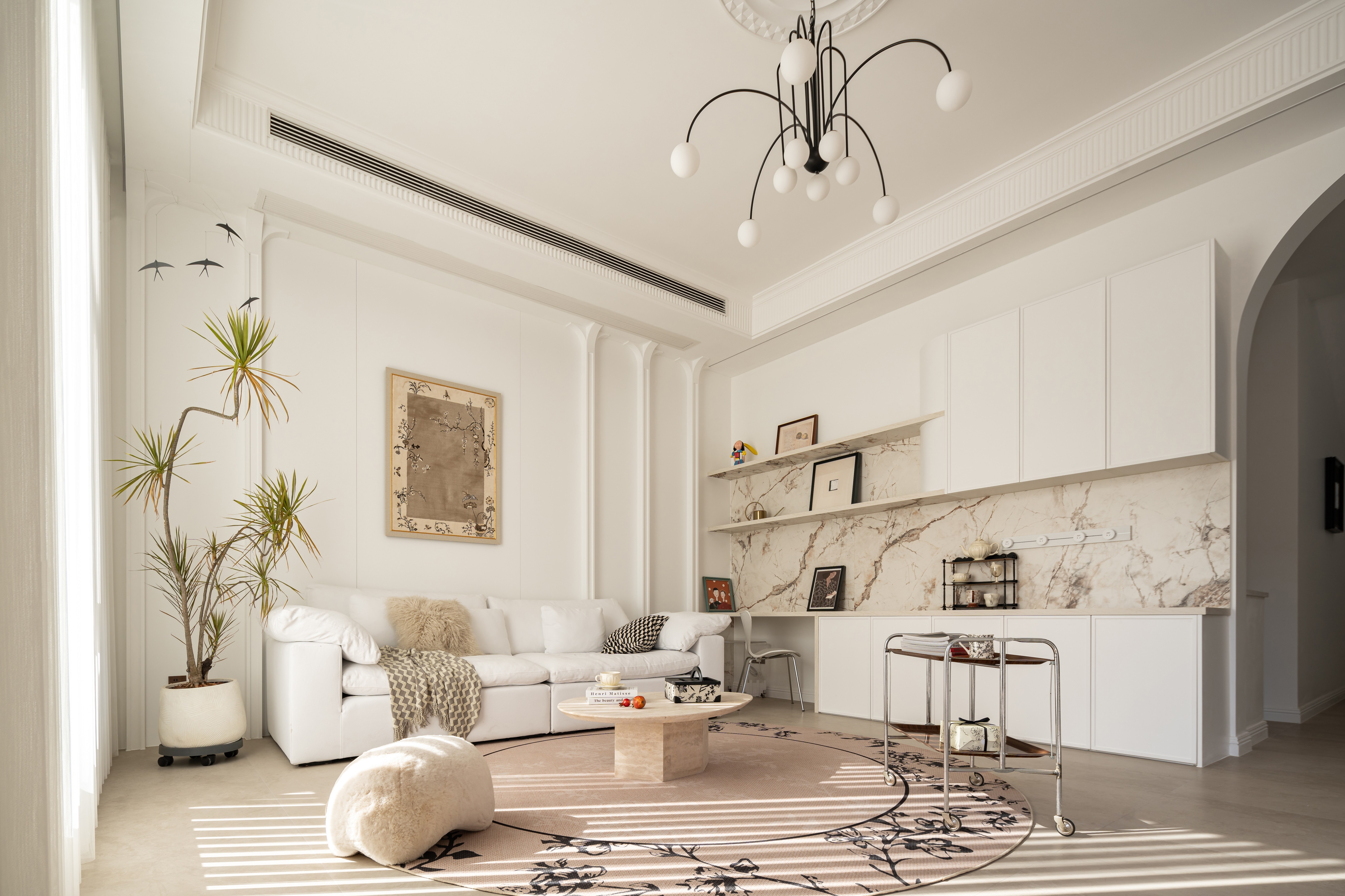 将晨雾编织进棉麻经纬, 让阳光斜切过奶杏色墙面, 把茶香熨烫成几何褶皱, 让满室雅致在隔纱倾泻的光瀑里, 延展成黄金分割的诗行, 这是场克制的抒情—— 所有慵懒都在悬空的180°弧形包围里苏醒。