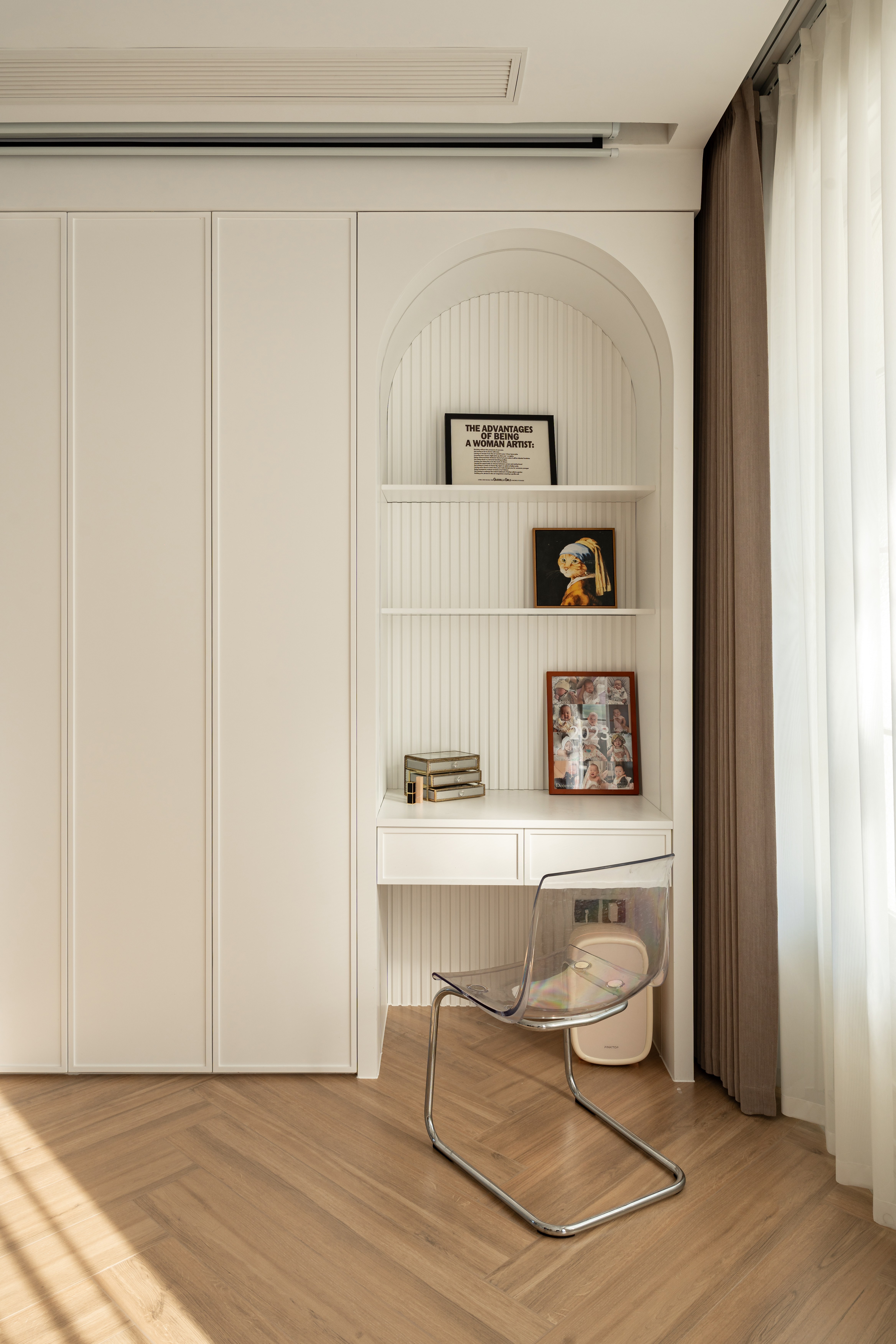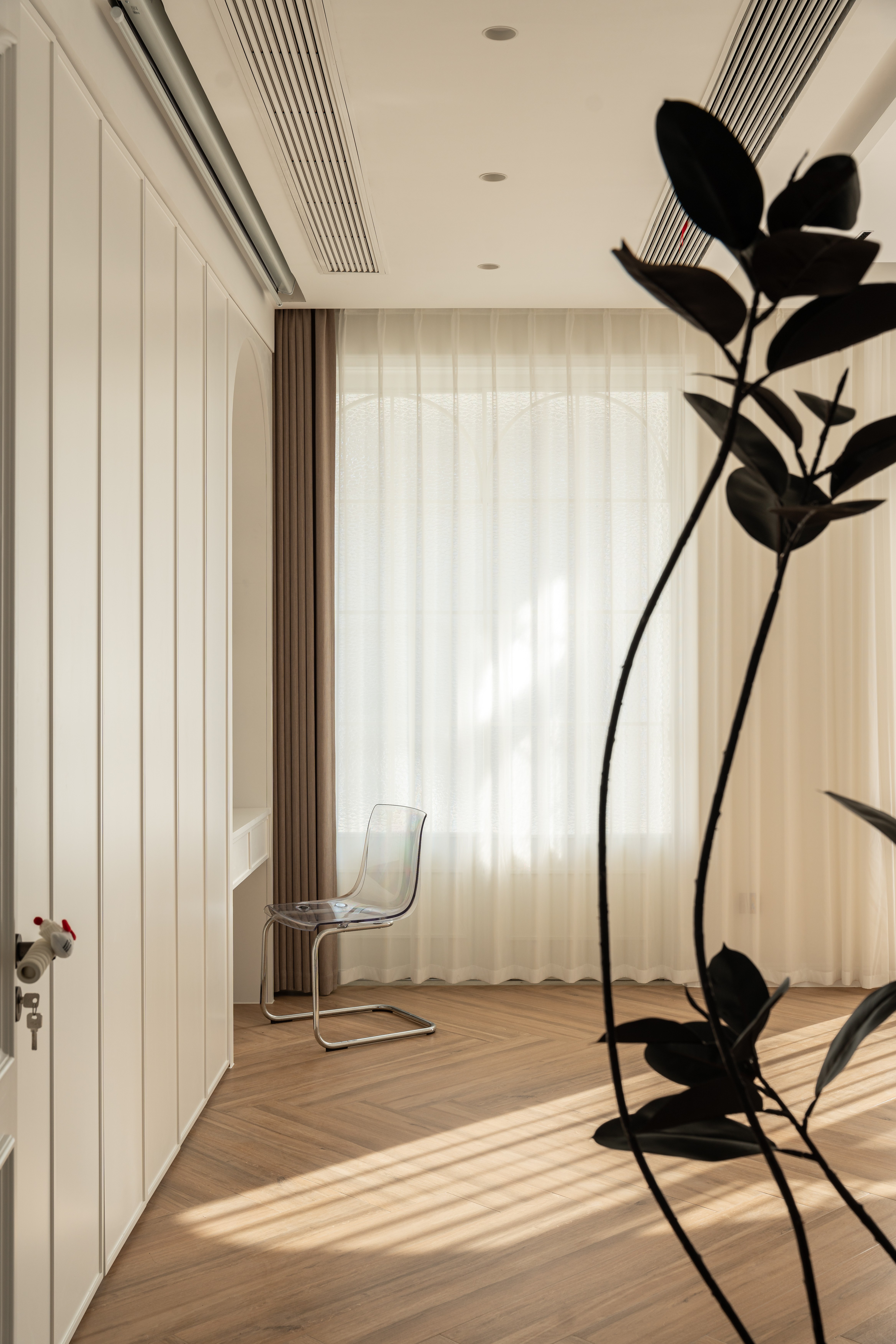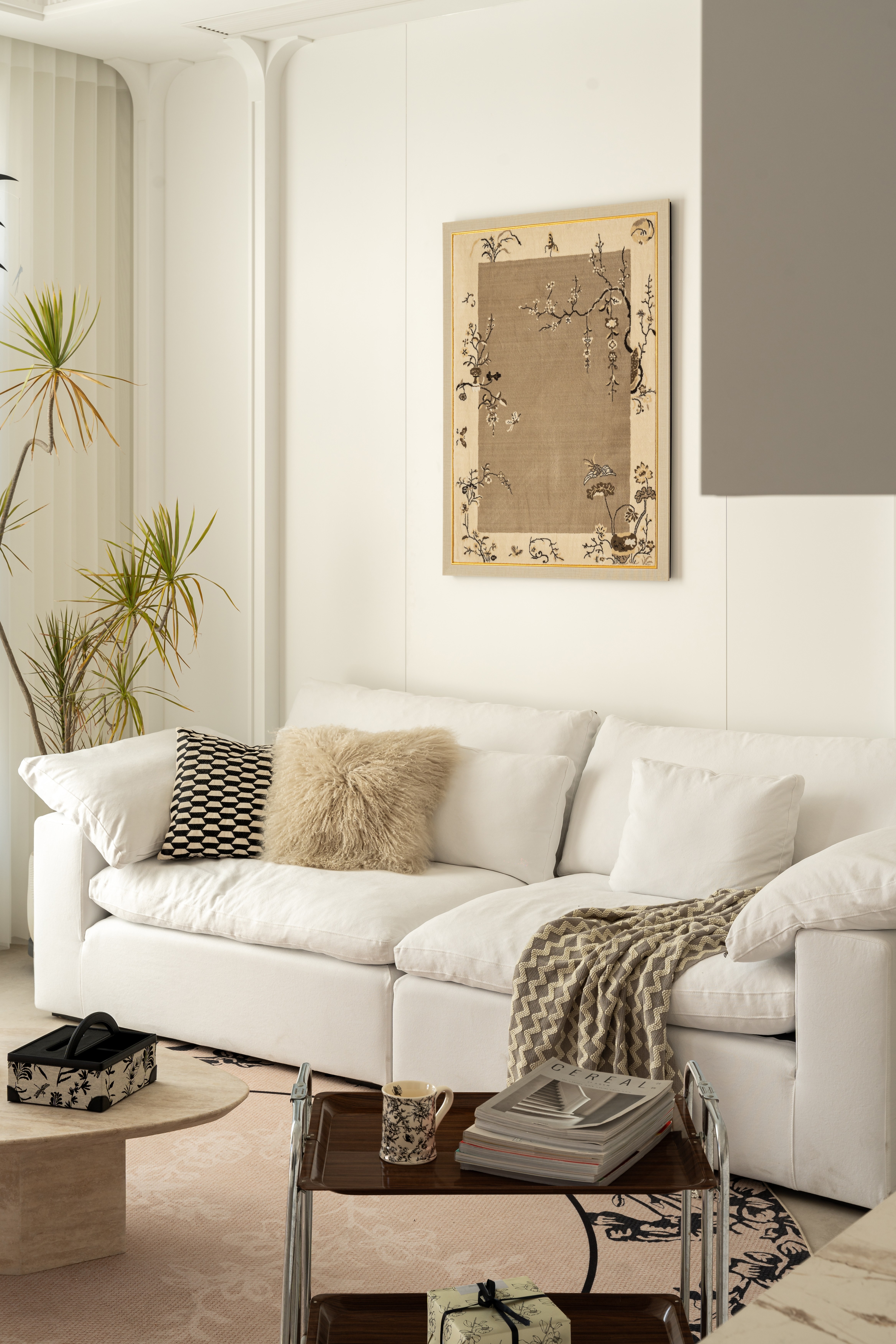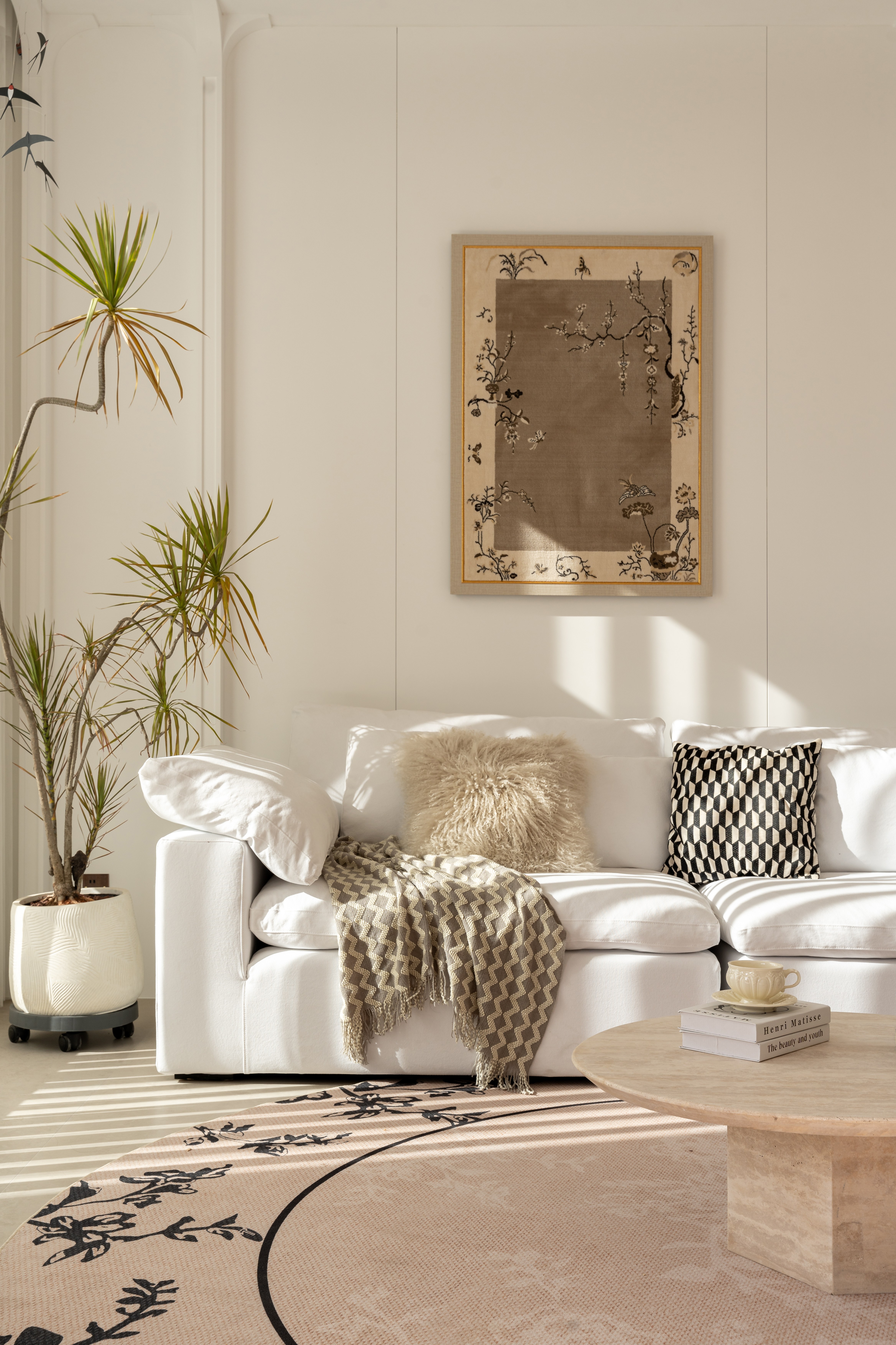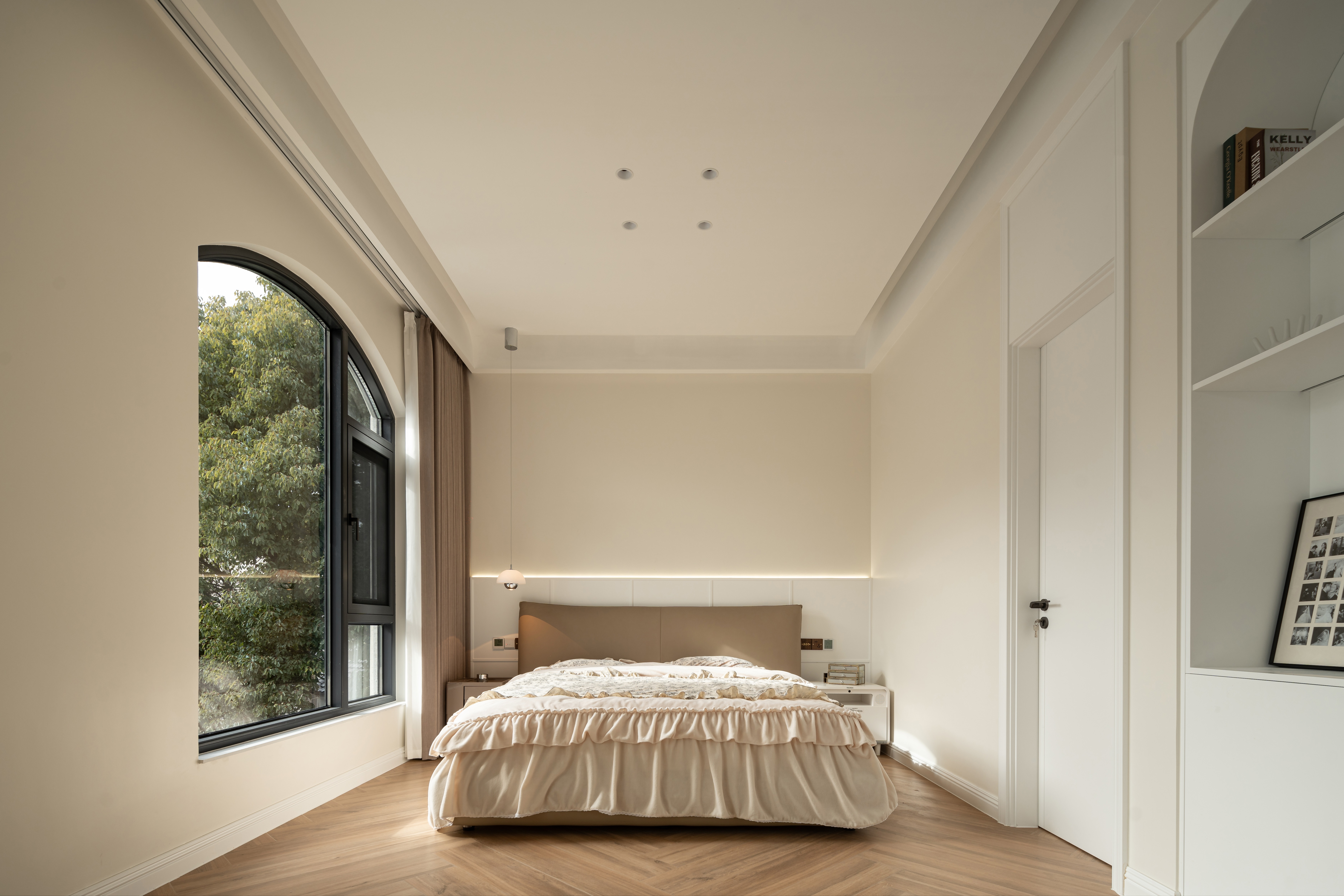 将晨雾编织进棉麻经纬, 让阳光斜切过奶杏色墙面, 把茶香熨烫成几何褶皱, 让满室雅致在隔纱倾泻的光瀑里, 延展成黄金分割的诗行, 这是场克制的抒情—— 所有慵懒都在悬空的180°弧形包围里苏醒。