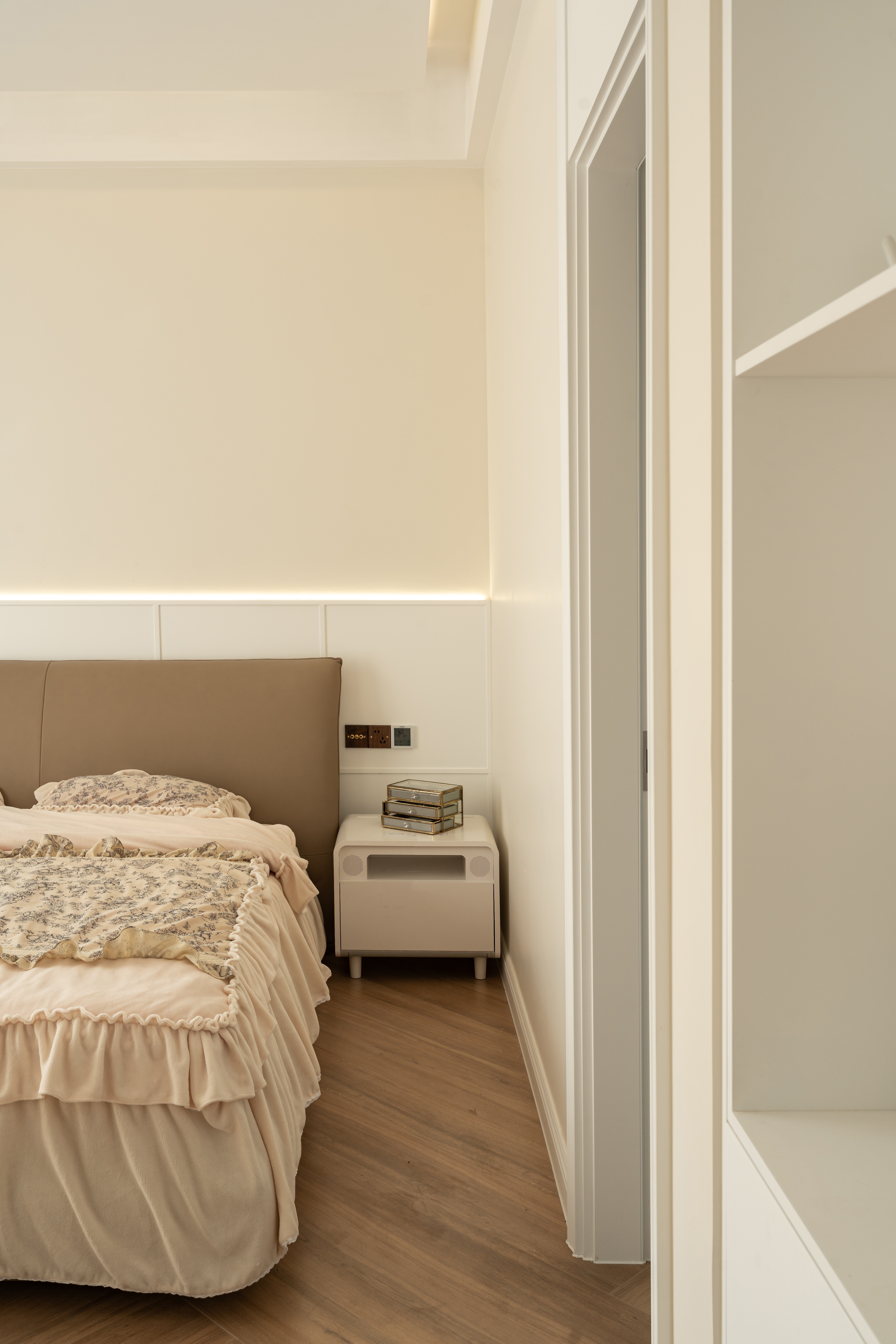 把暖棕木纹熨入暮色肌理, 让胡桃年轮在曲面柜体呢喃私语; 把晨昏光影锻造成玻璃竖琴, 让穿堂的风与阳光互诉衷肠; 把常春藤的吻痕拓在泛黄诗页, 让所有记忆在古朴的床榻沉眠—— 这是一场穿越时空间隙的温柔回归。