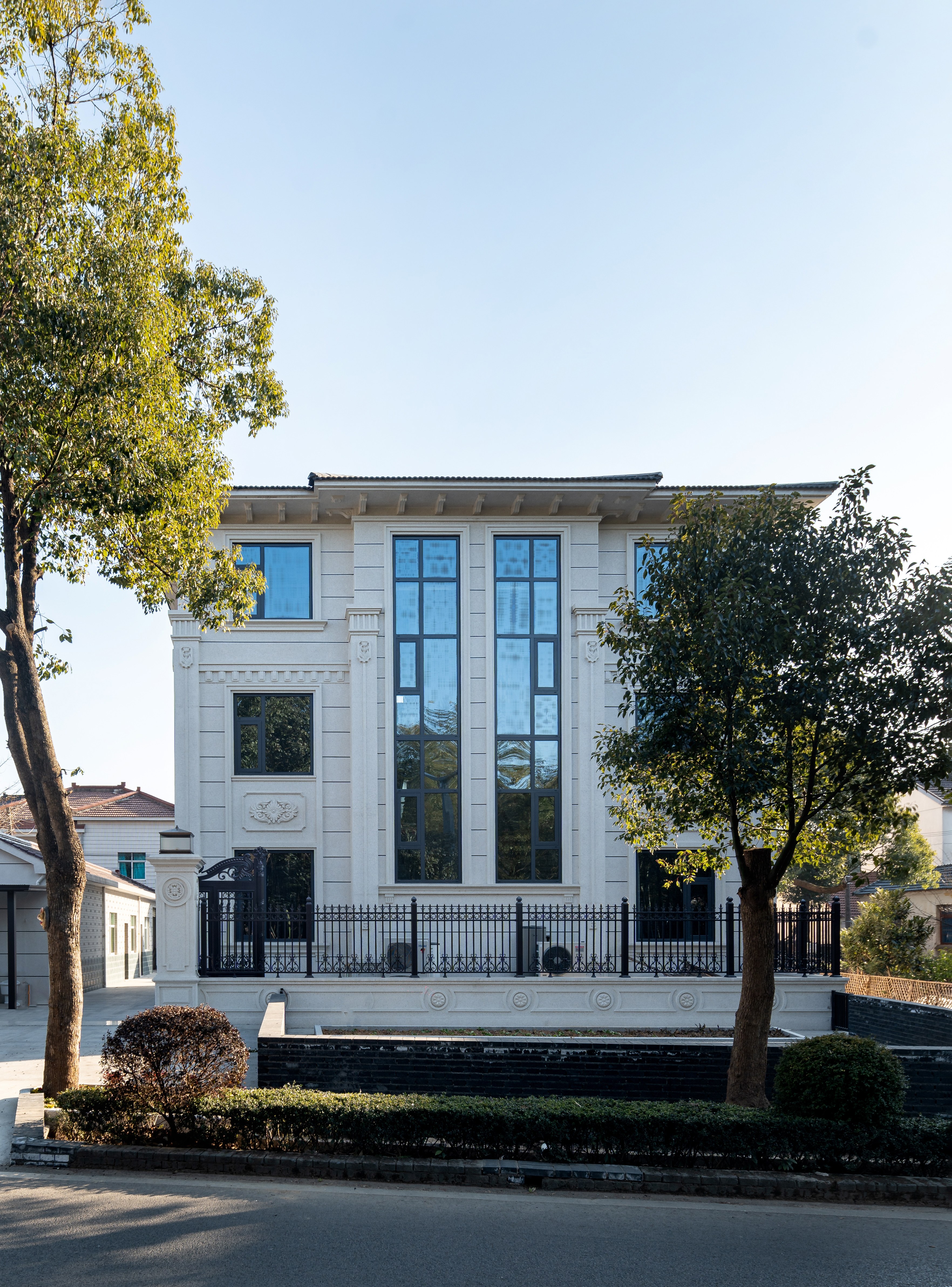 外立面以抽象化的古典柱式语言对话银杏生态,石膏线条演绎理性生长的枝状脉络。特殊骨料墙体捕捉自然微光,混凝土肌理成为储存月光的容器,模糊人工与自然的绝对边界。