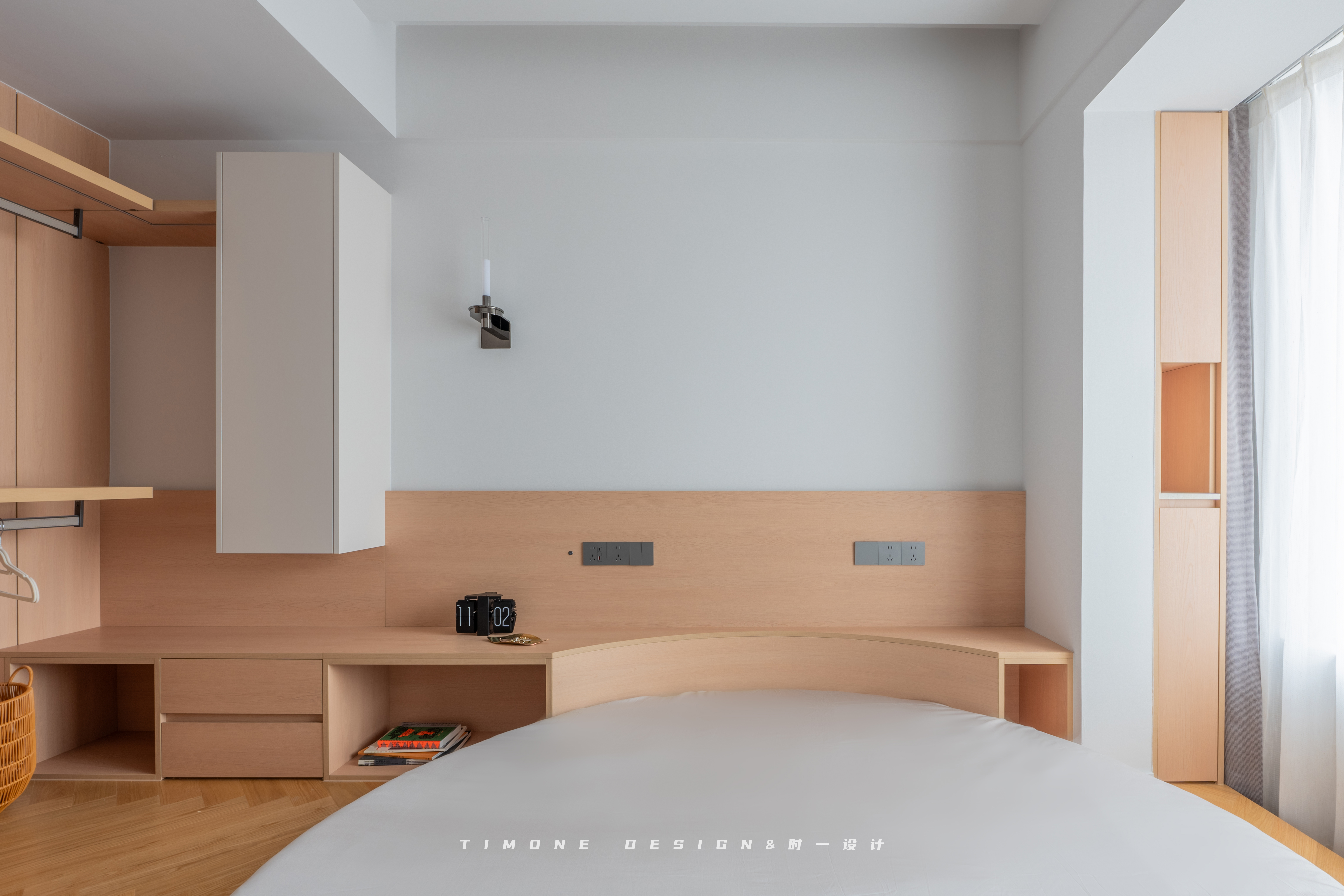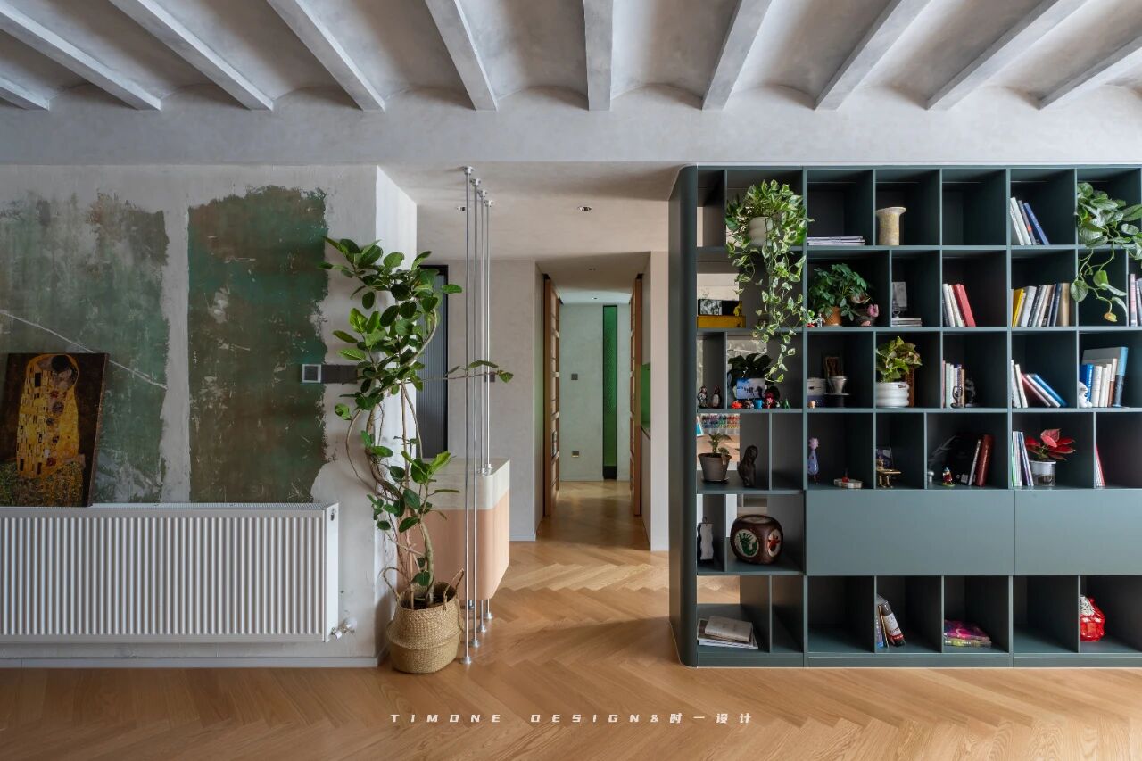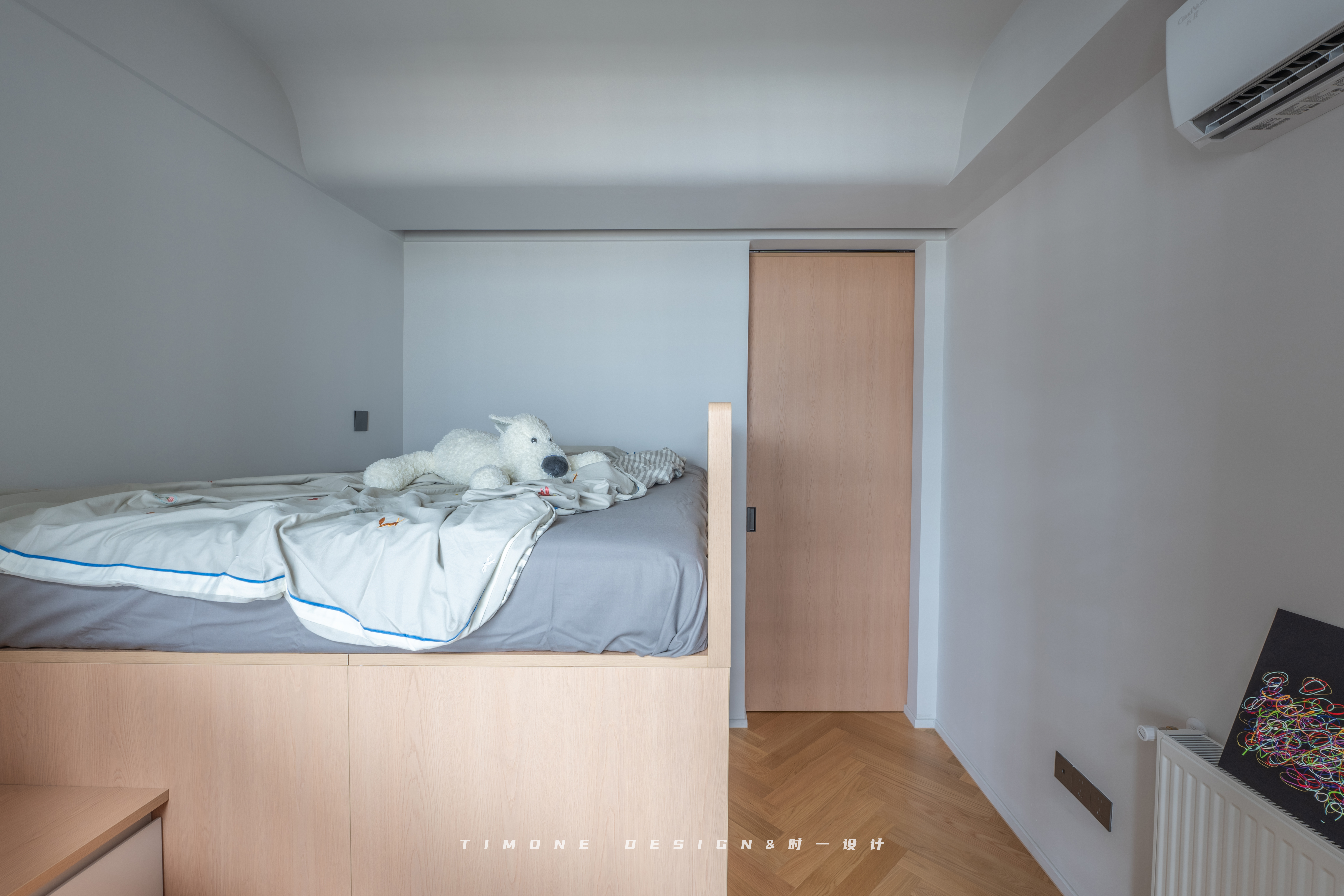 设计选材:客厅以独特的绿色开放式书柜,替代传统电视柜,浅灰色艺术涂料作为底色,增加绿棕色艺术墙、瓦楞顶面设计、隐藏投影幕布.....小户型的门就要简单一点咯,以极简的实木移门替代,主卧抬高的地面,一下子就理解了独特的圆形床、开放衣帽间都是有意为之,儿童房上床下衣柜的设计就足矣