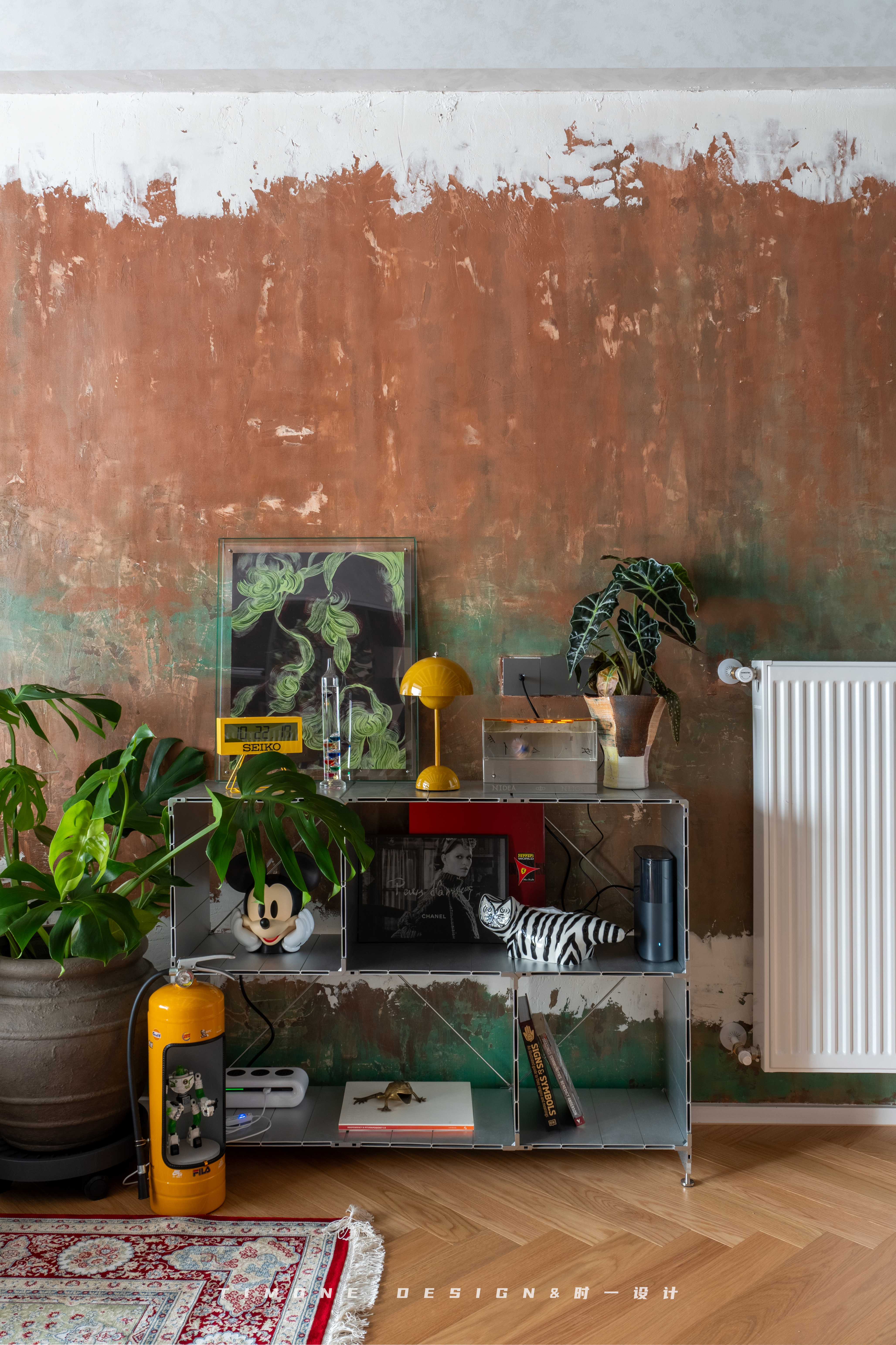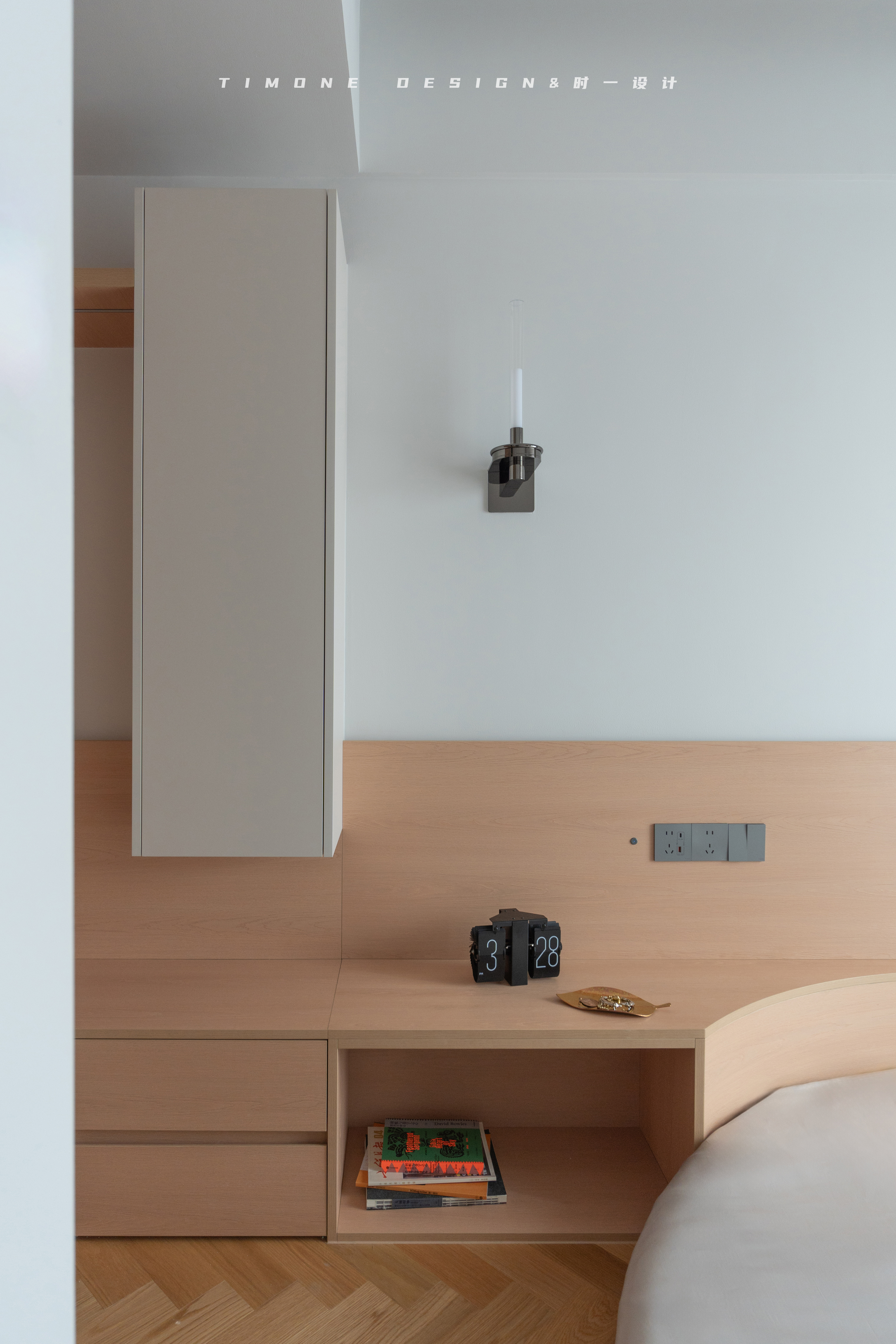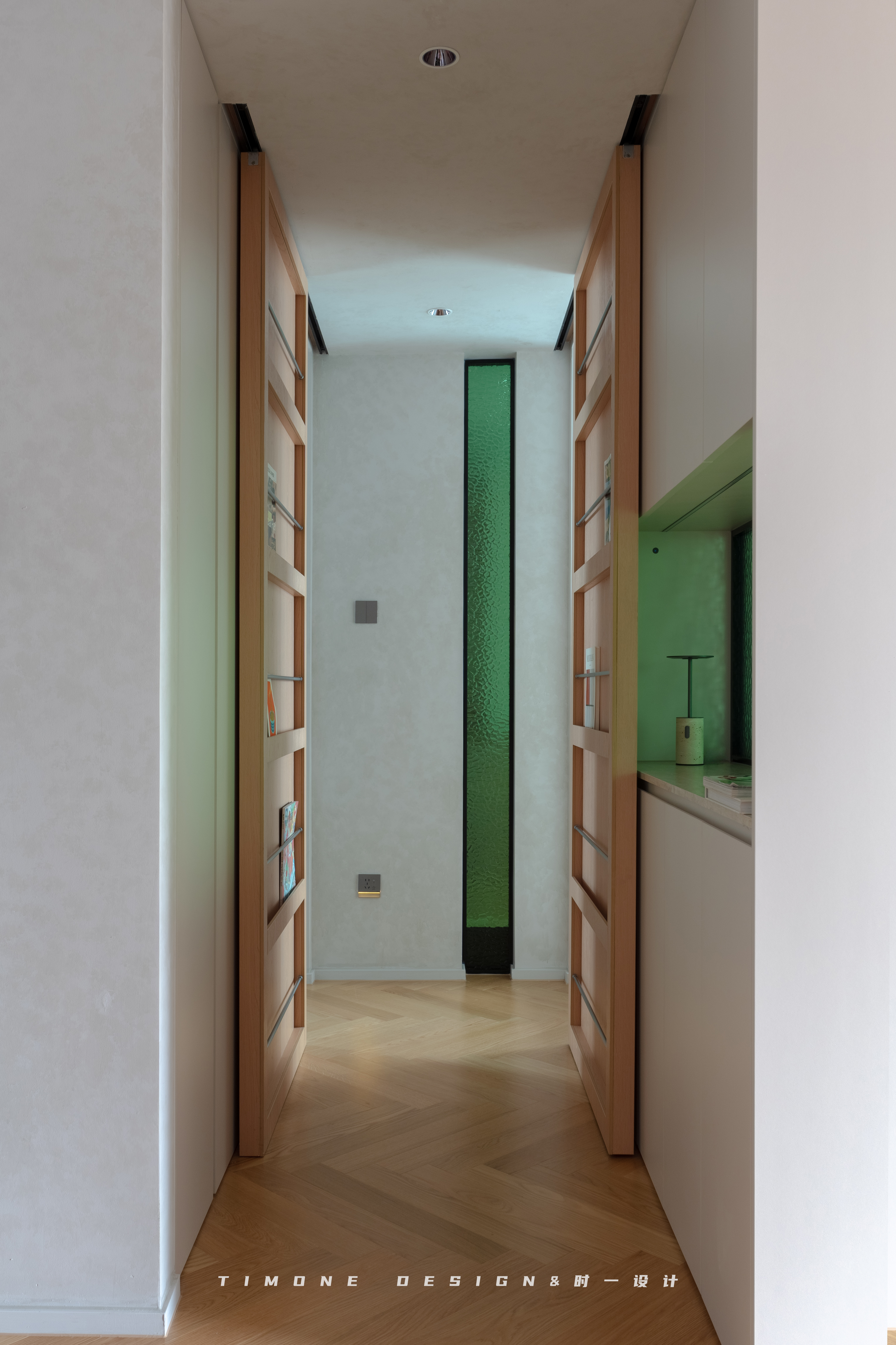 设计选材:客厅以独特的绿色开放式书柜,替代传统电视柜,浅灰色艺术涂料作为底色,增加绿棕色艺术墙、瓦楞顶面设计、隐藏投影幕布.....小户型的门就要简单一点咯,以极简的实木移门替代,主卧抬高的地面,一下子就理解了独特的圆形床、开放衣帽间都是有意为之,儿童房上床下衣柜的设计就足矣