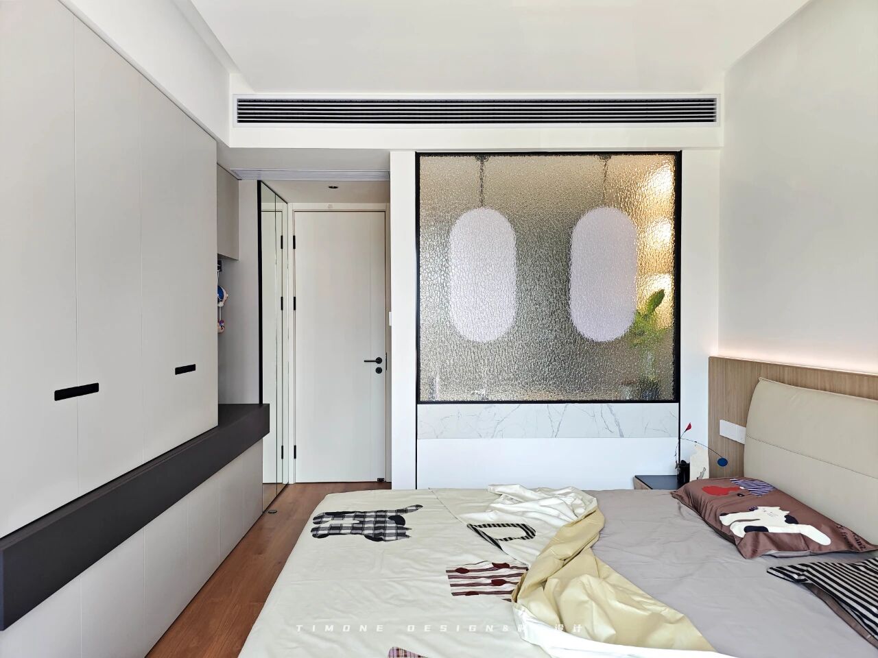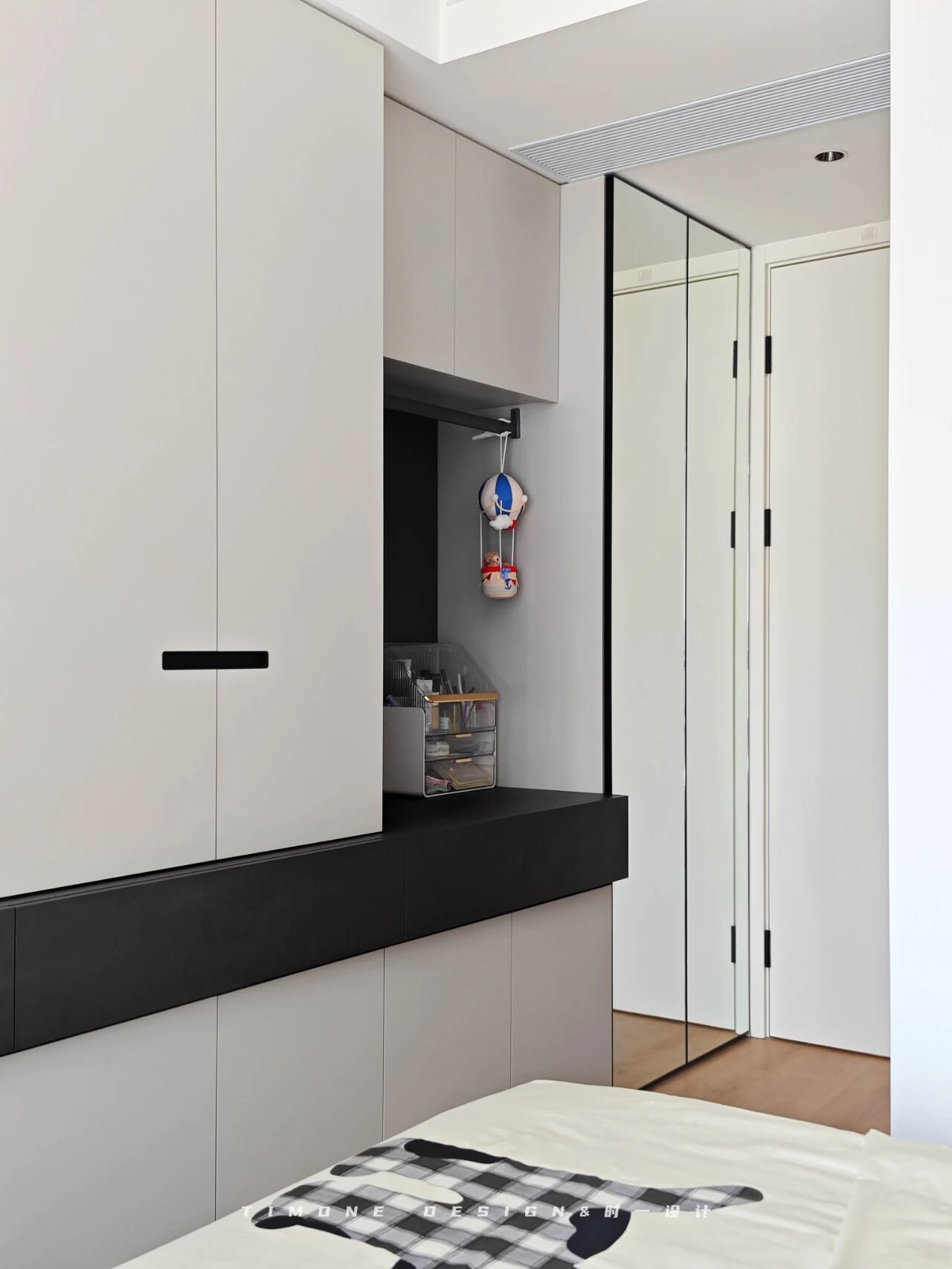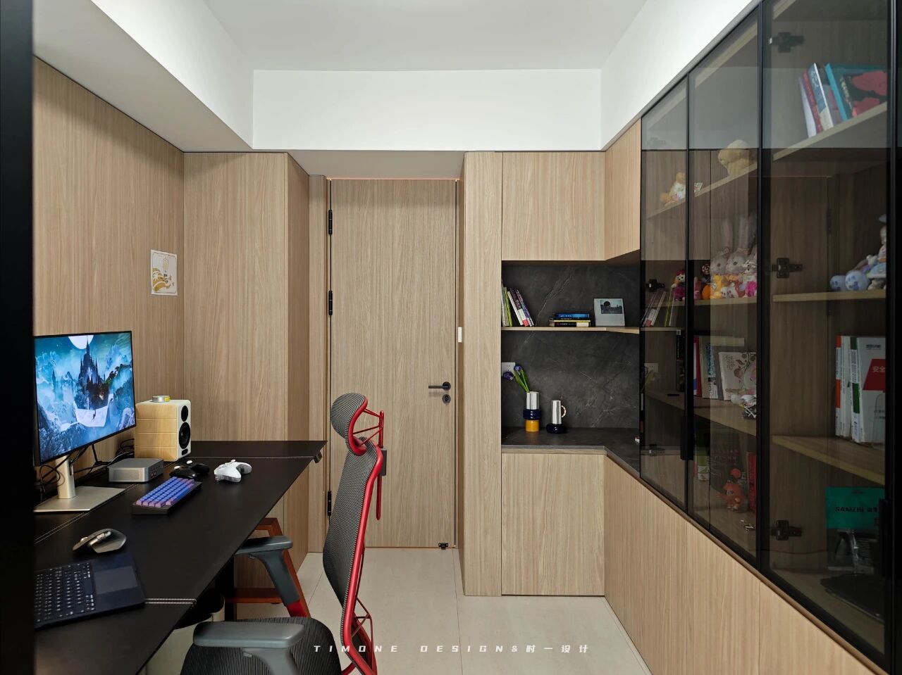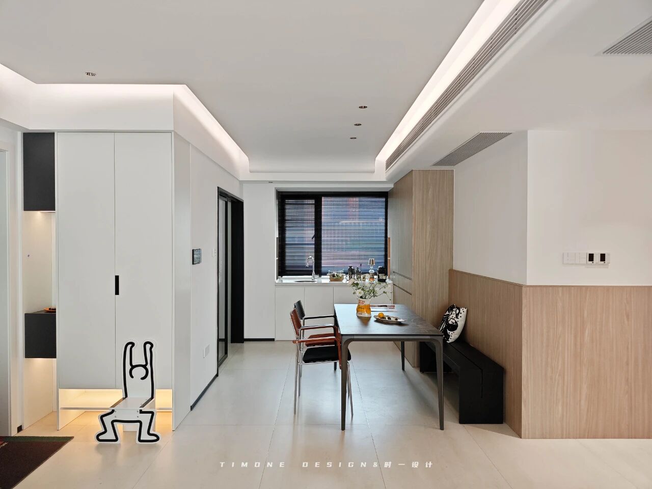 非承重墙体利用柜子、玻璃做分区隔断,设置多功能区域,打造贯通式流动性空间,实现路径的最短化和灵活性。