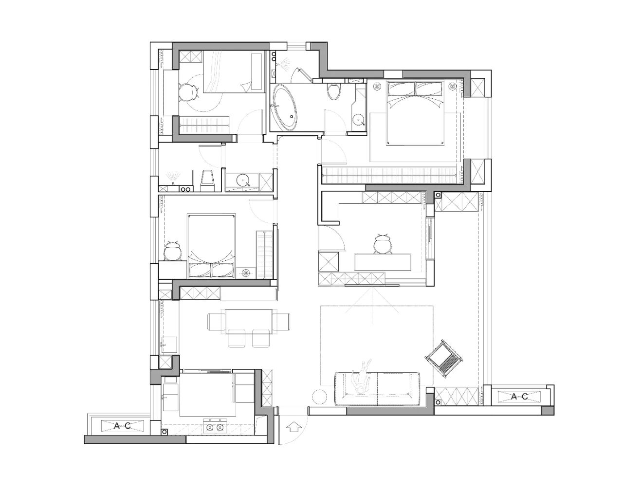 利用走廊的横平竖直和整体性,实现客餐厅、书房和卧室空间的合理化分区,最大程度的整合零碎角落。 -