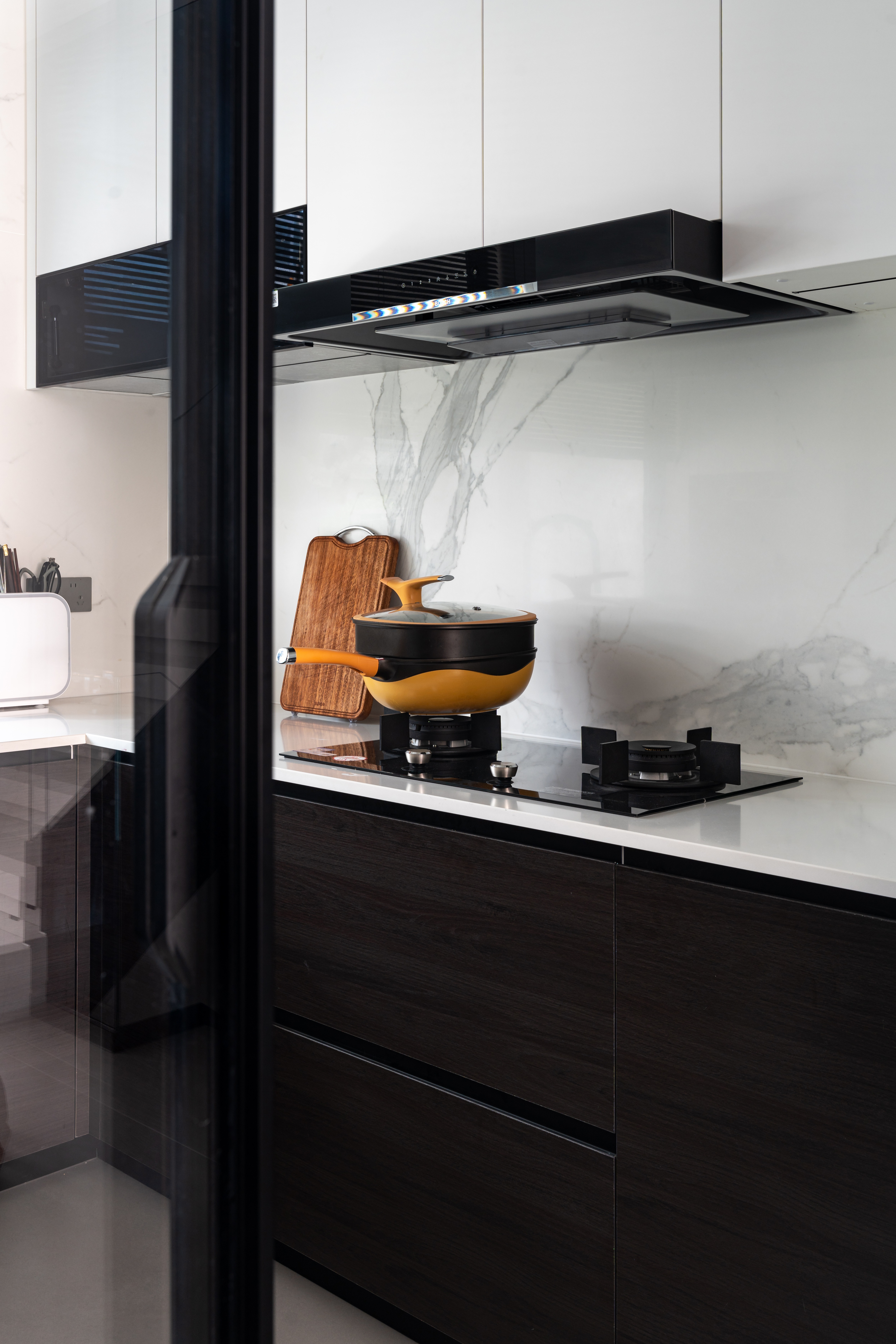 层层铺垫的色系进程, 逐渐递进的情绪传递, 大面积的黑白碰撞, 局部的巧思点缀, 岩板的潜移默化之下, 如潘多拉的魔盒打开, 牵引着艺术的前行。 当烟火熄灭, 在家人团圆, 精致的厨餐区承载着的, 是对温暖与温情的留恋。