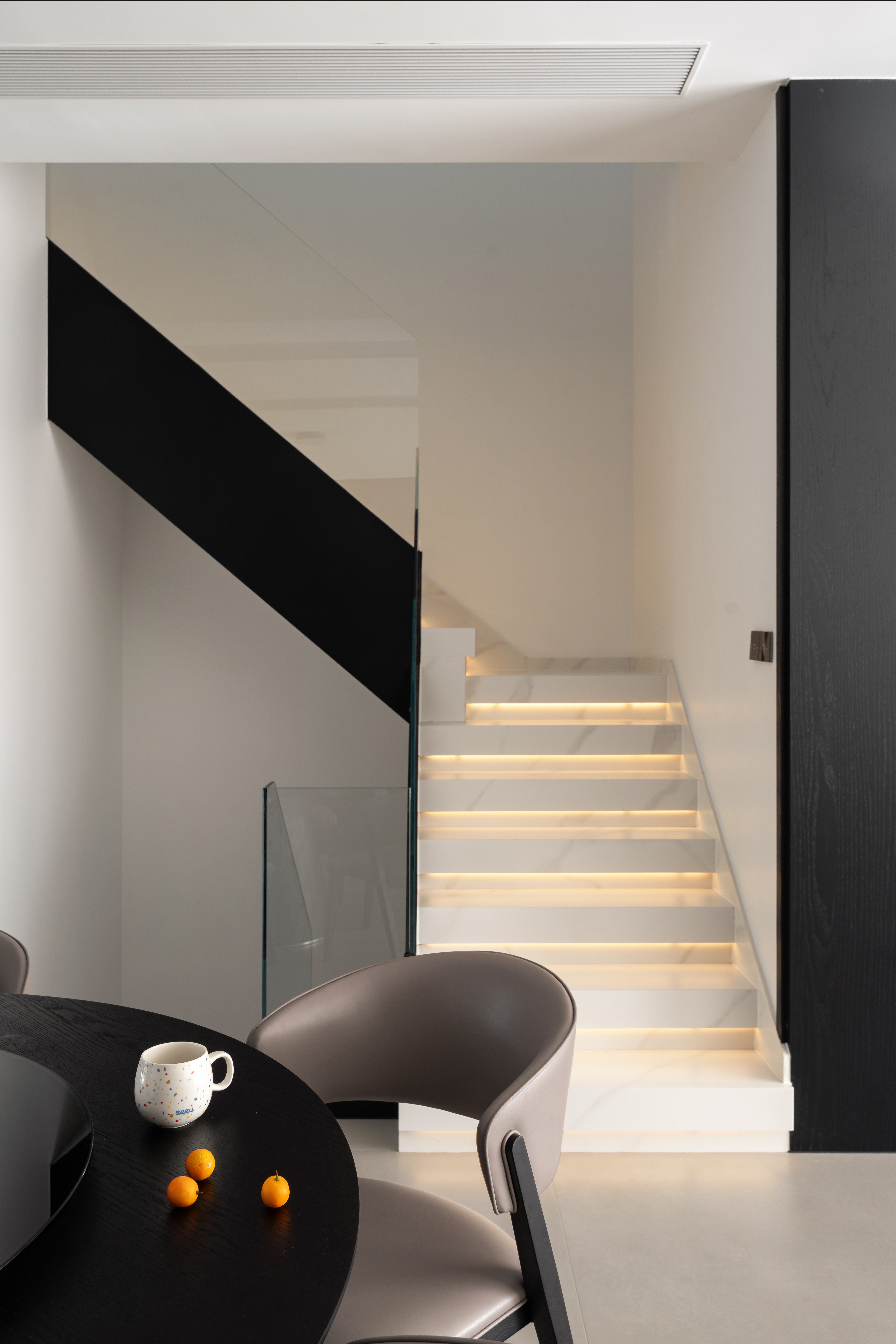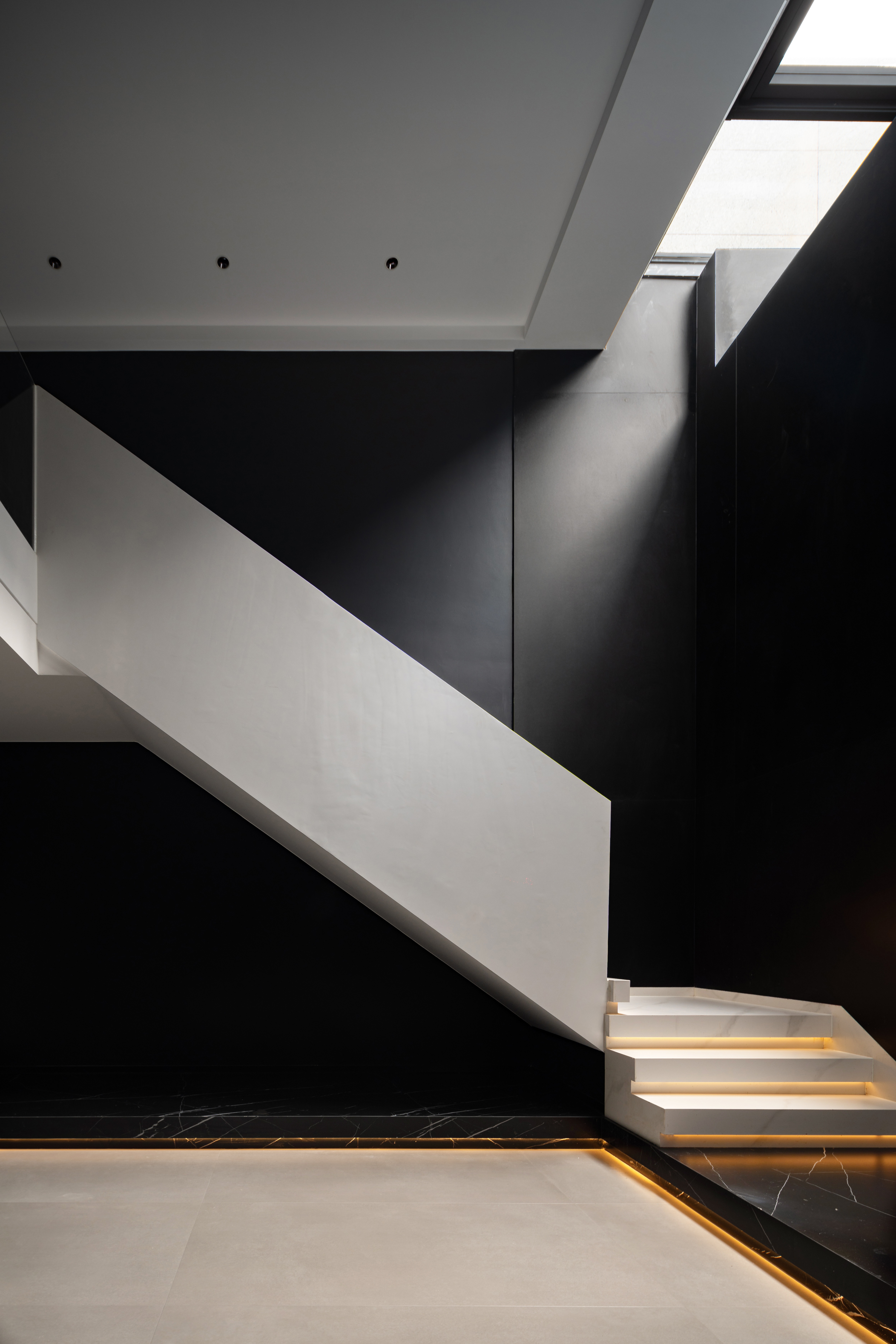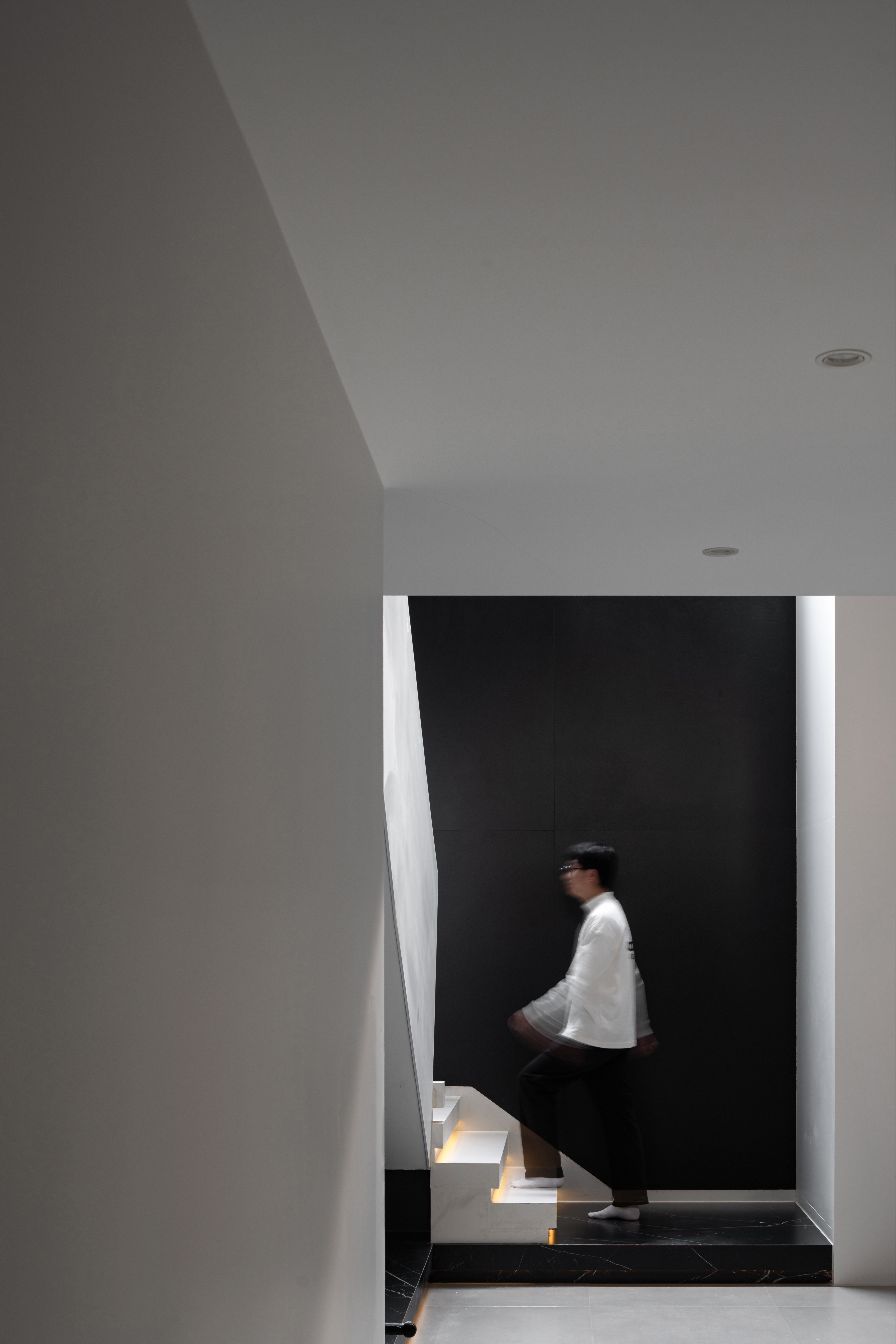 经典的黑白演绎极简, 雅静的空间恰好纳入光线, 在黑白之间是天光的乍现, 在起承之间是步步向上的台阶, 在内外之间是自我意识的完整呈现。 钢板的极致简练, 玻璃的通透蜿蜒, 色调延伸向上, 两种材质同频共振, 呼吸吐纳间尽是怡然。