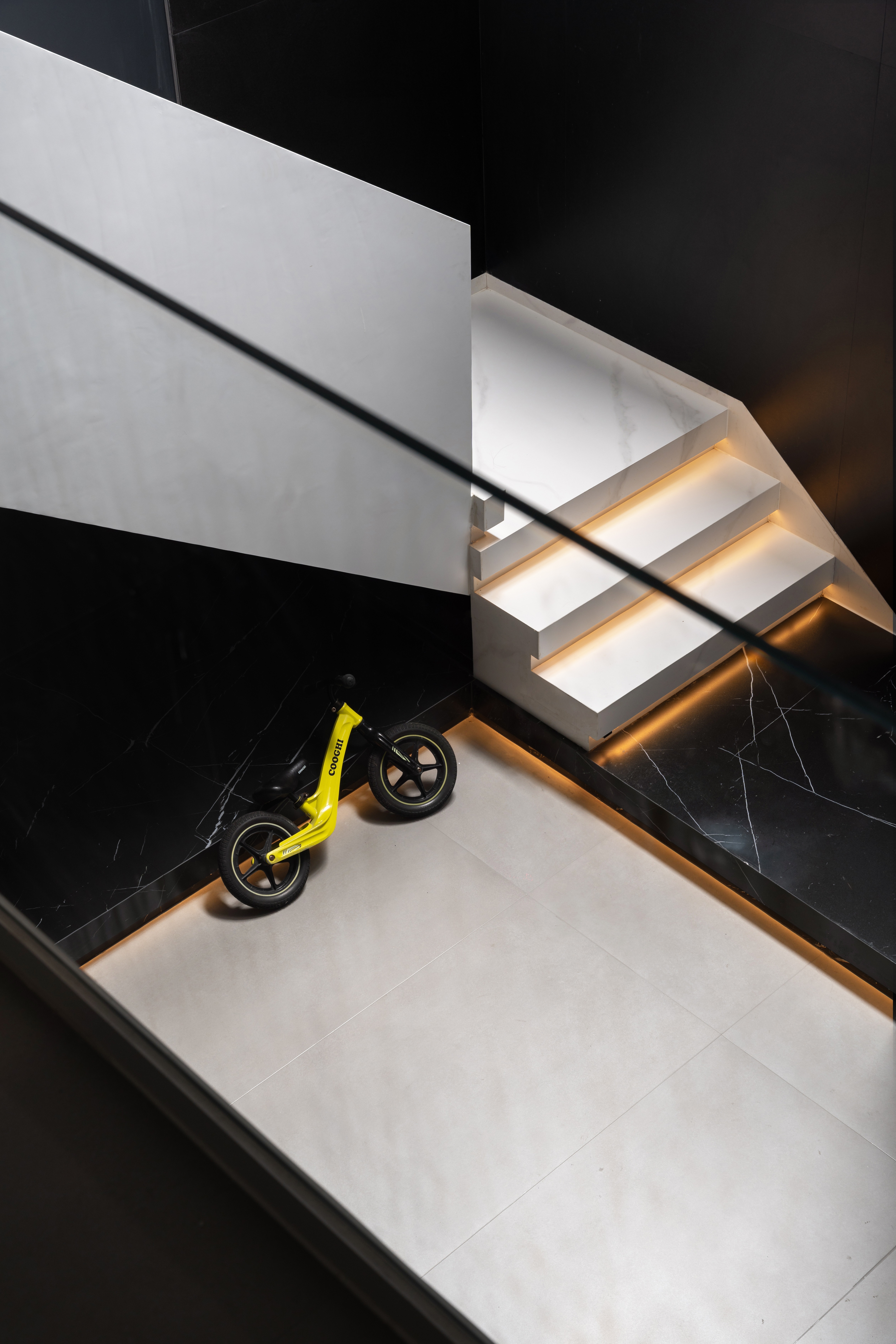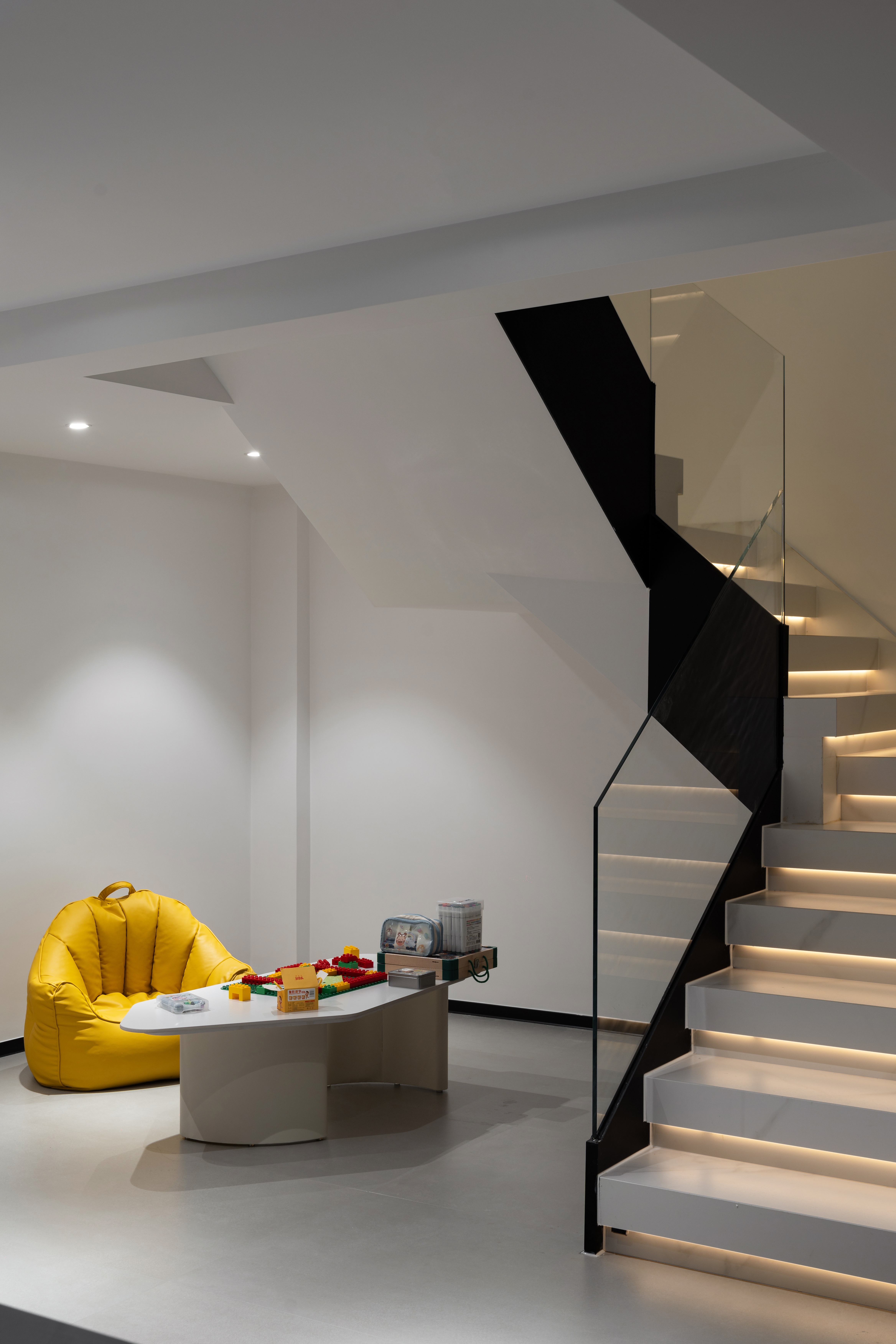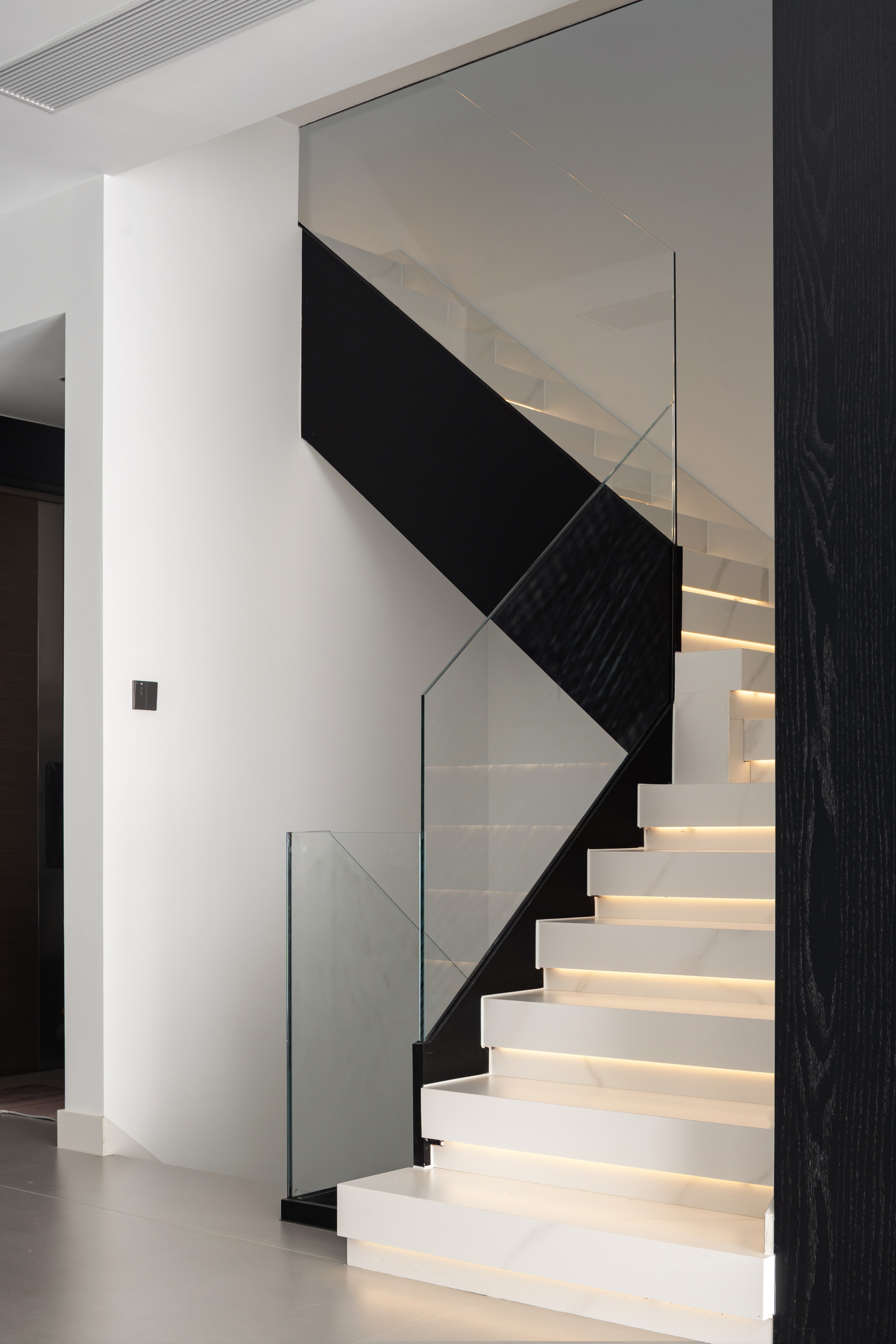 经典的黑白演绎极简, 雅静的空间恰好纳入光线, 在黑白之间是天光的乍现, 在起承之间是步步向上的台阶, 在内外之间是自我意识的完整呈现。 钢板的极致简练, 玻璃的通透蜿蜒, 色调延伸向上, 两种材质同频共振, 呼吸吐纳间尽是怡然。