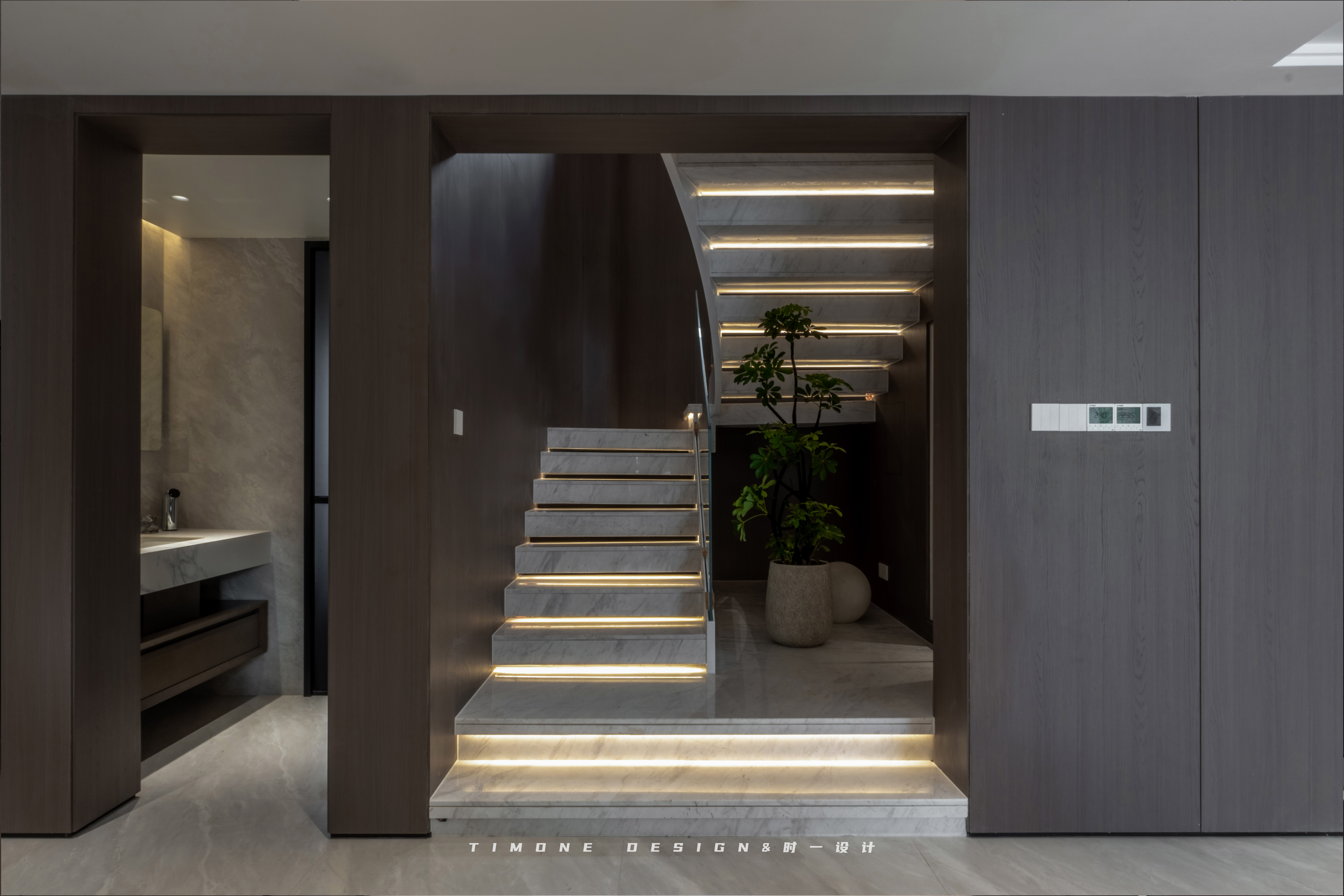 空间布局:这套复式旧房的改造,没有复杂的材质和设计,却处处都是意式轻奢的高级感:可能是隔而不断的悬空电视背景墙,可能是入户的水滴镂空造型,也可能是旋转跳动而上的精致楼梯。