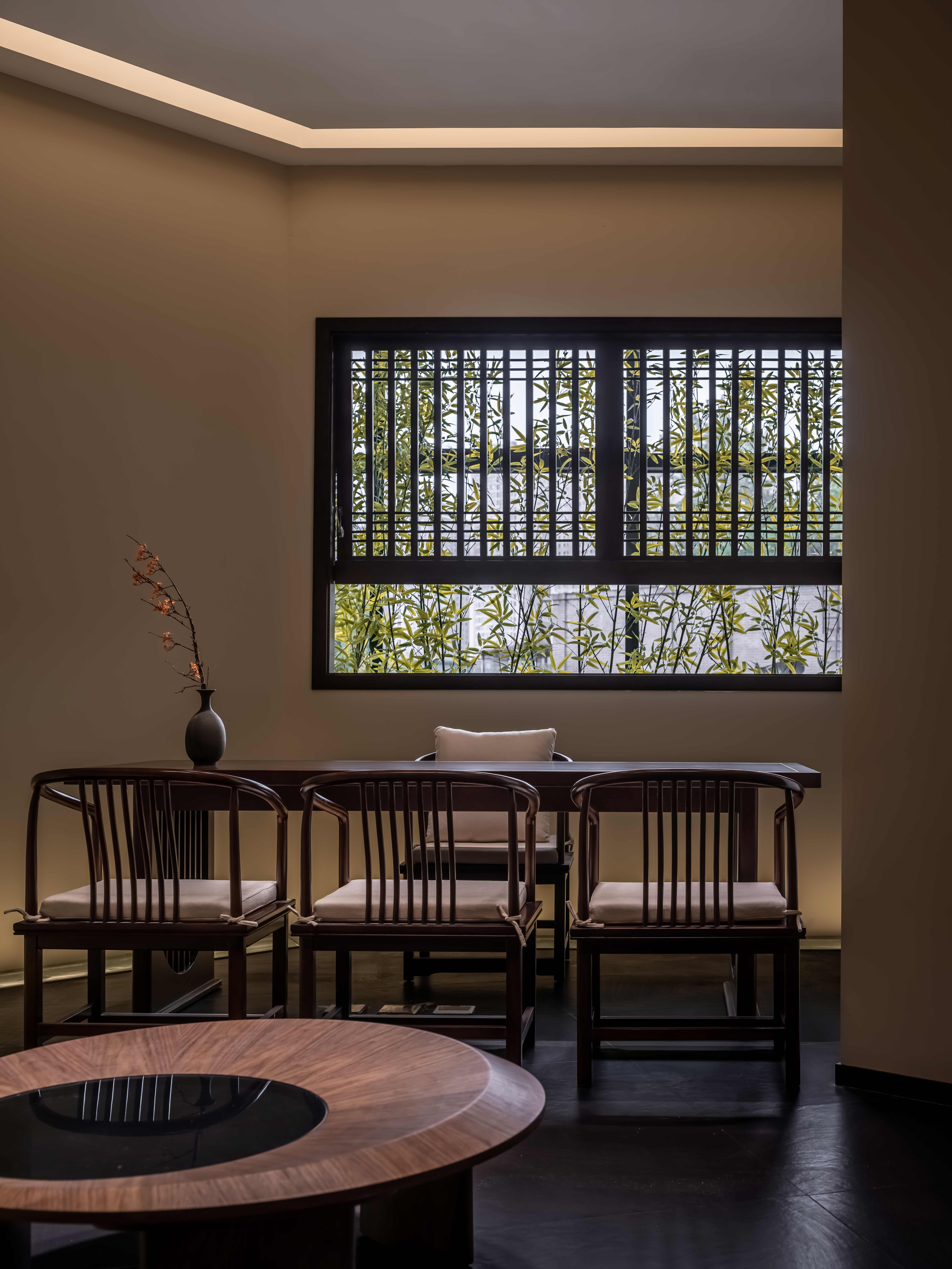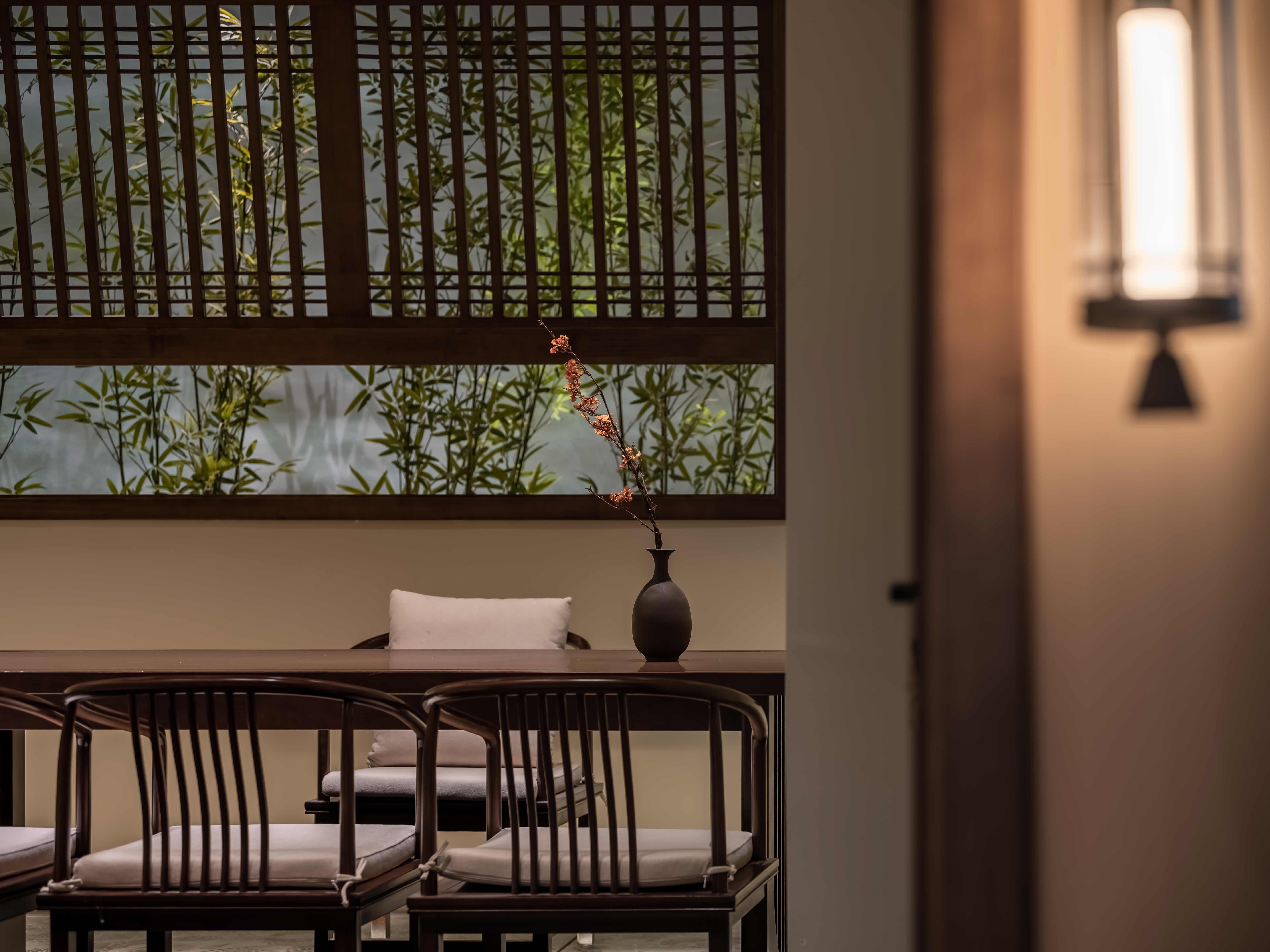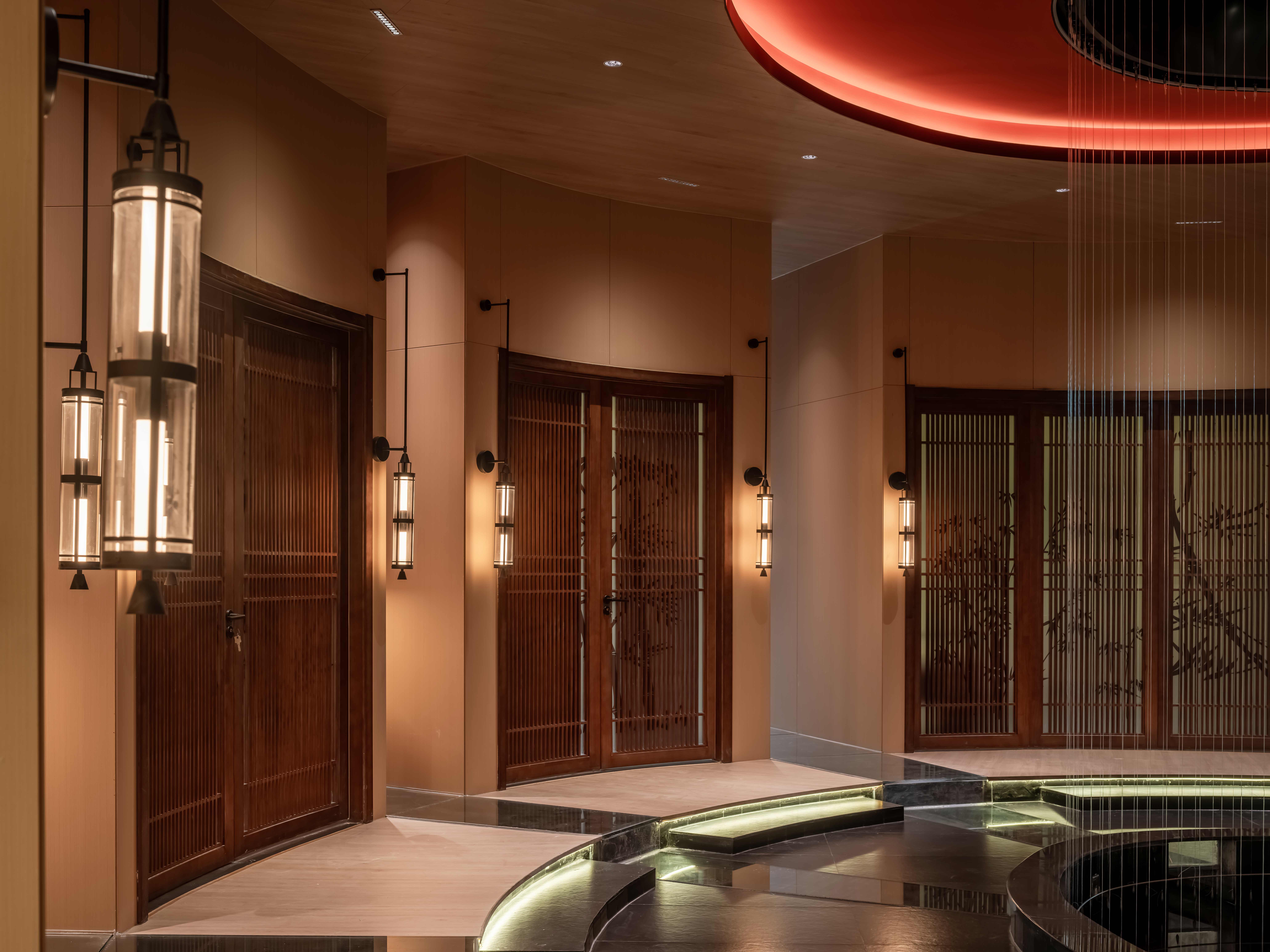 东方温润材质:木质天花、竹纹玻璃、仿天然石材铺地,传递人文温度与文化亲和力。