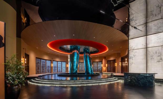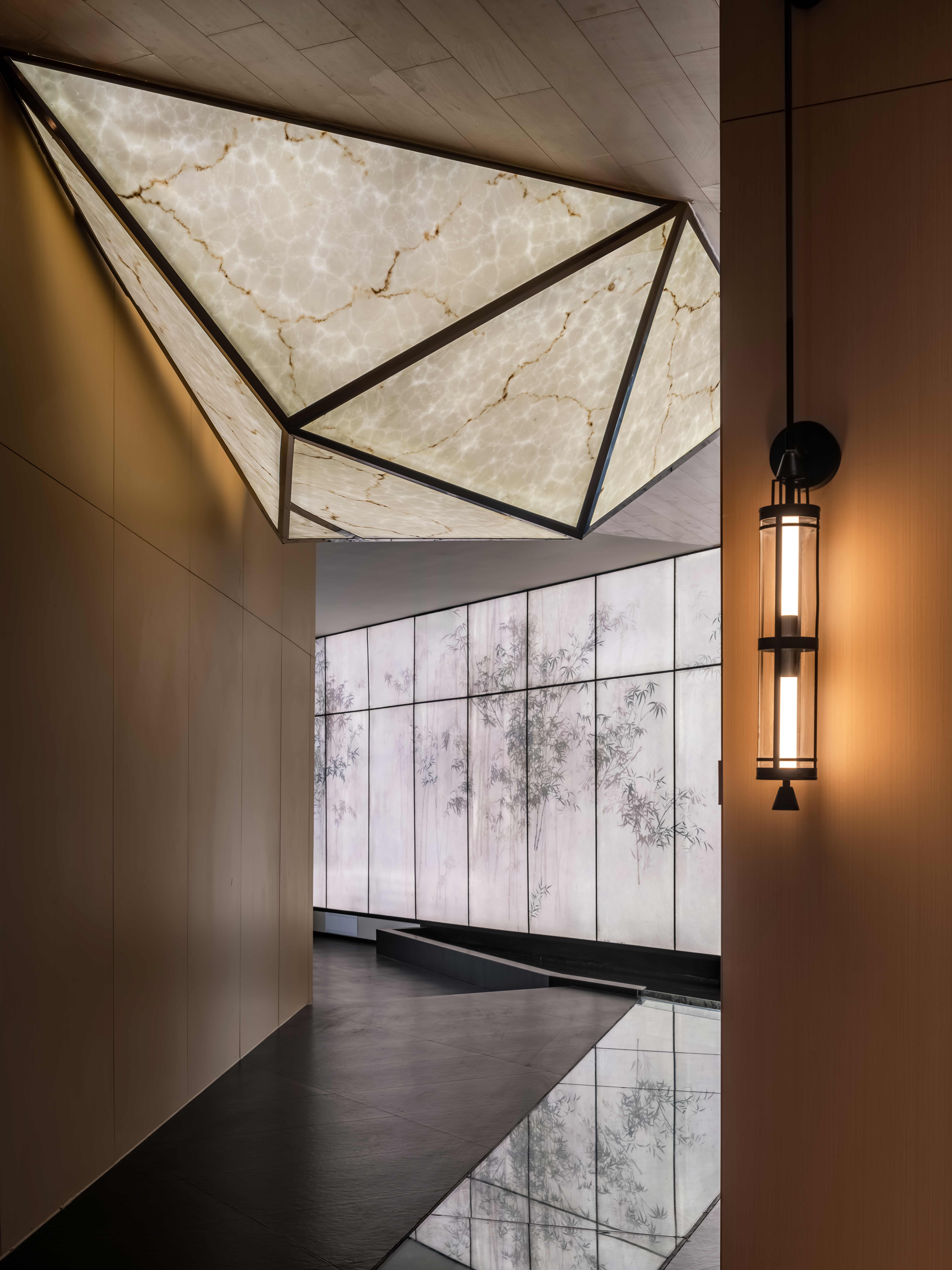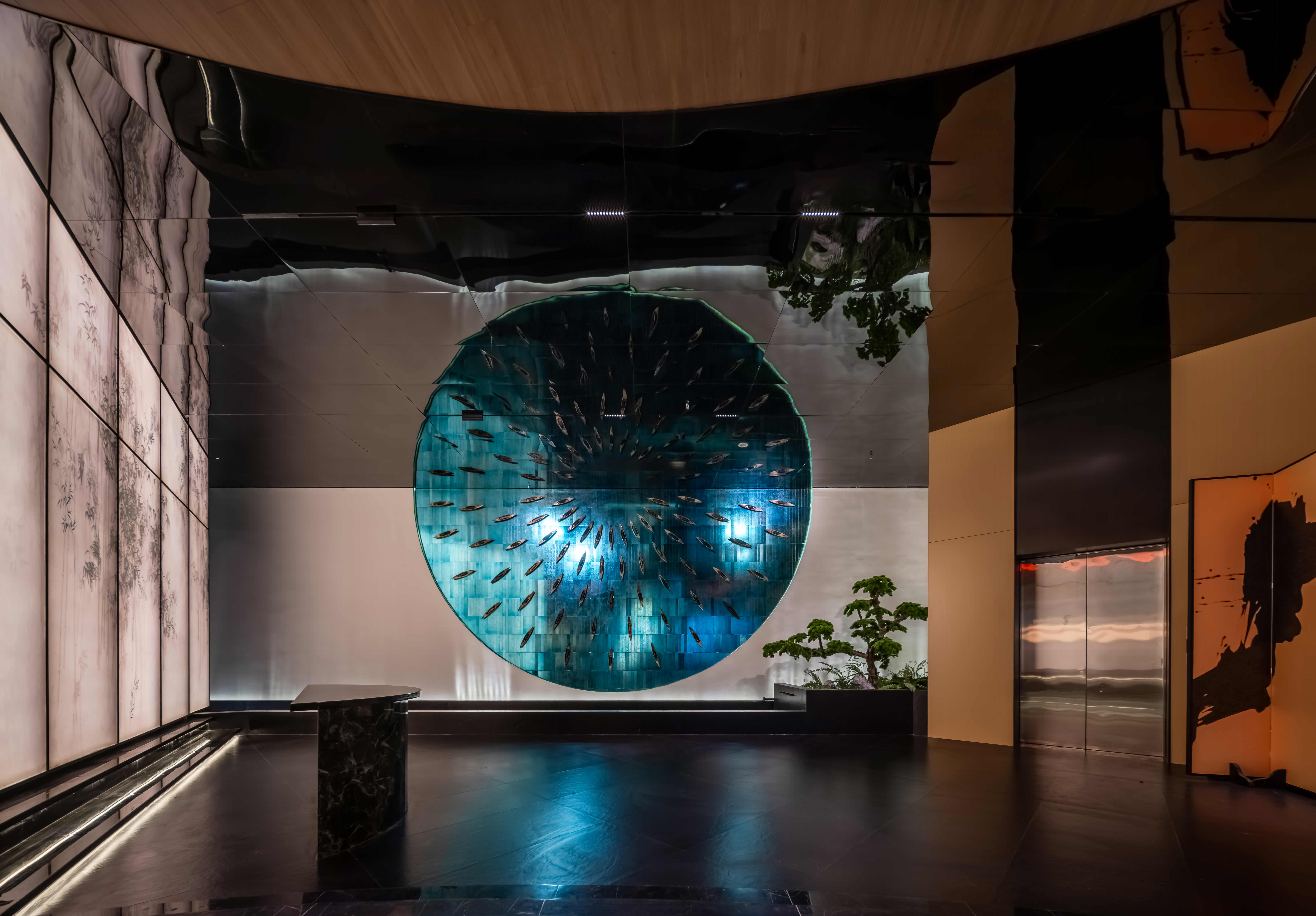 空间意境:创新性地将传统东方意境与现代科技美学进行场景化叠合。核心迎宾区以“圆形水庭”与“星光顶”营造“天圆星瀚”的哲思场景,植入红色环形装置与蓝调金属柱,形成传统符号与未来精神的视觉对话。过渡廊道以几何菱形灯结合竹纹格栅,实现光影的科技感与材质的文化感交织,创造出“一步一景、古今交融”的叙事性场景体验。
