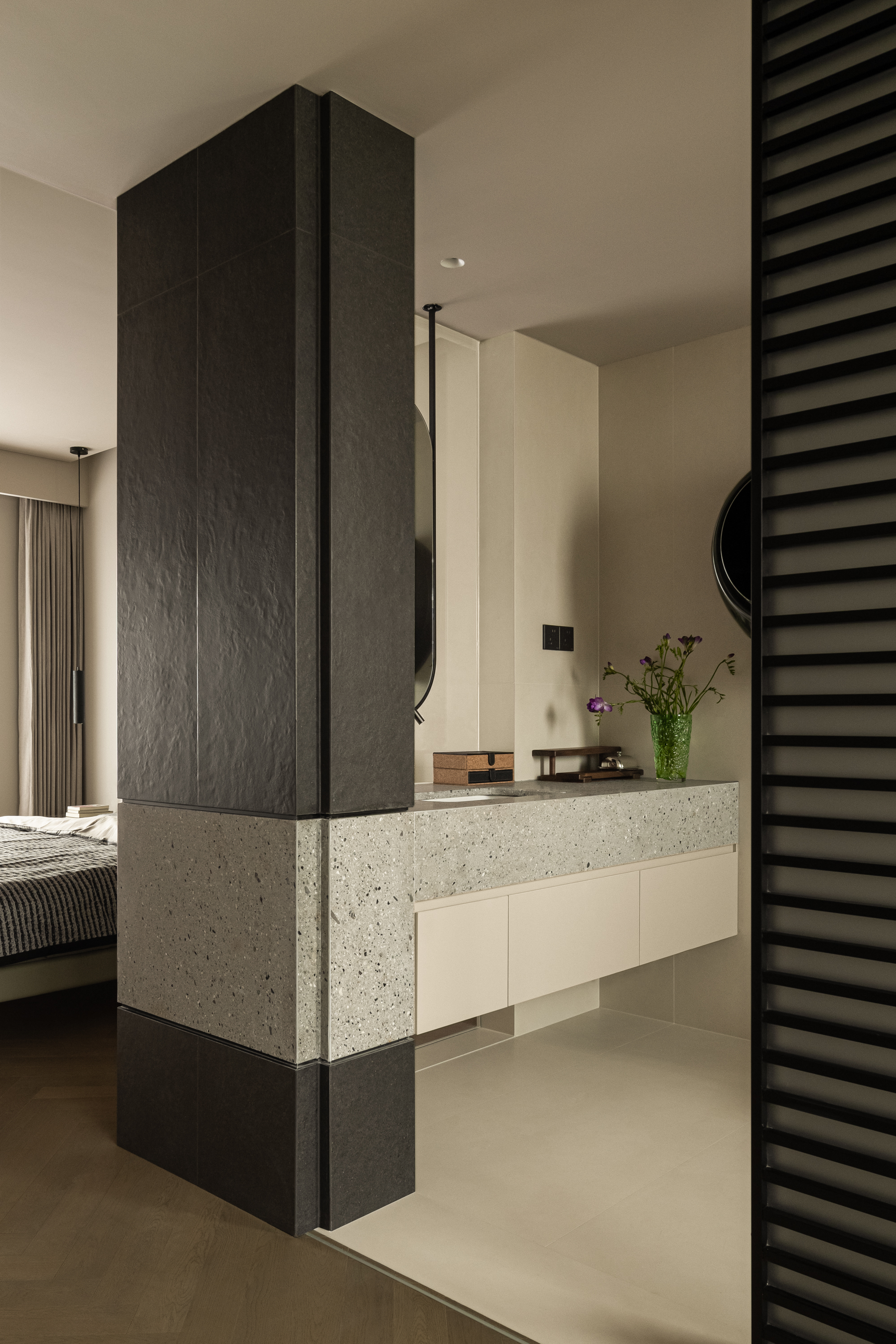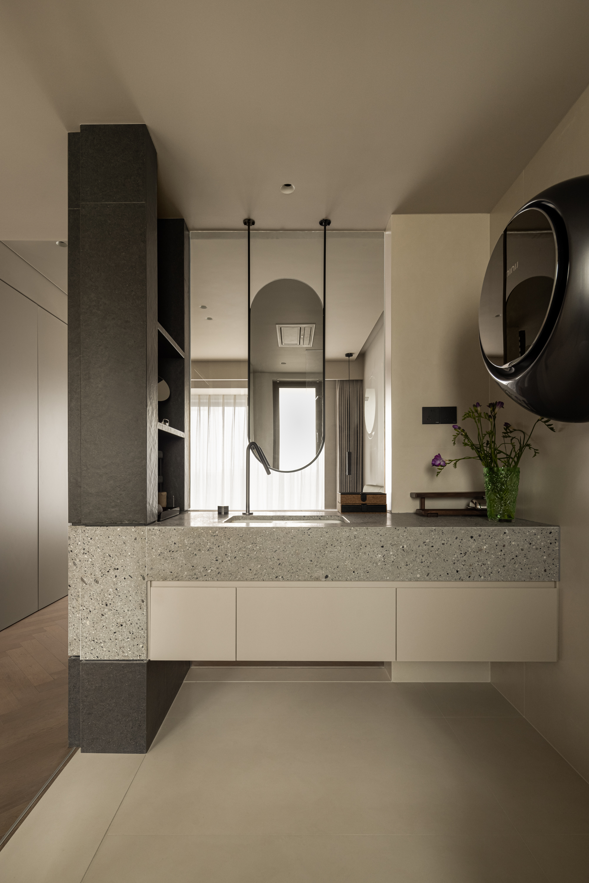 设计选材:材质上选择浅色黑胡桃的木纹与黑木纹交织使用,不锈钢材质做点缀,水磨石在不同空间中呼应联结