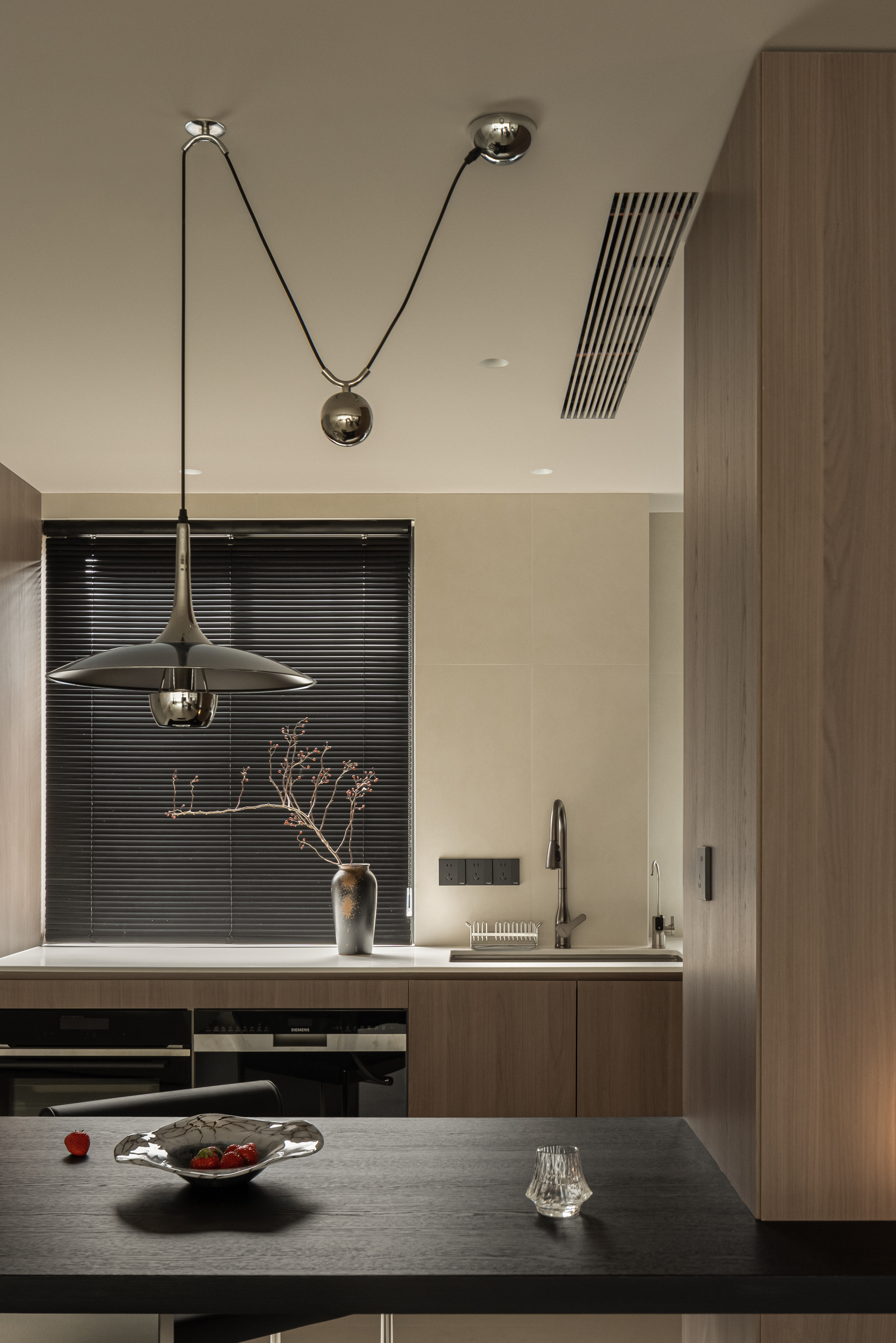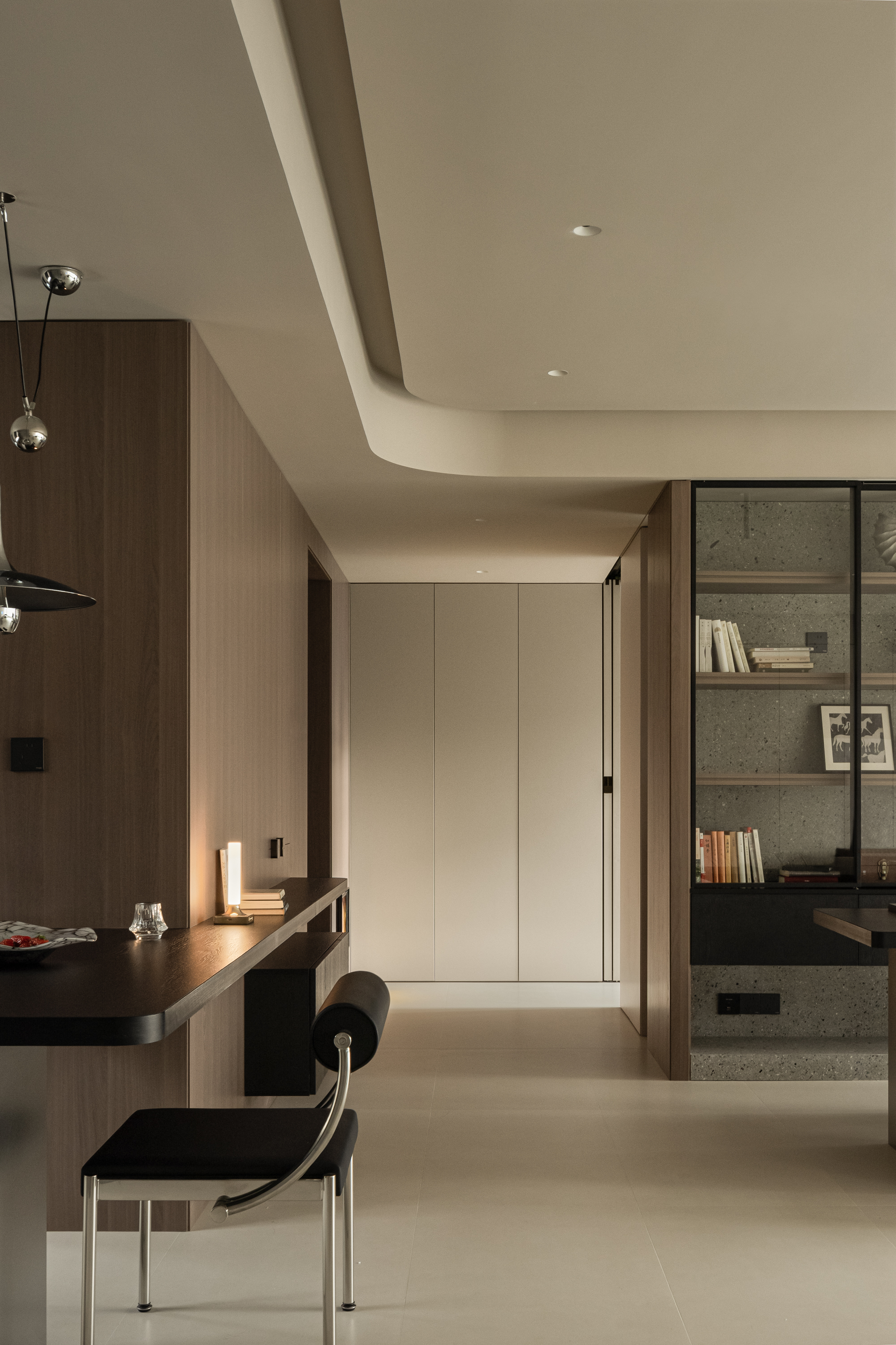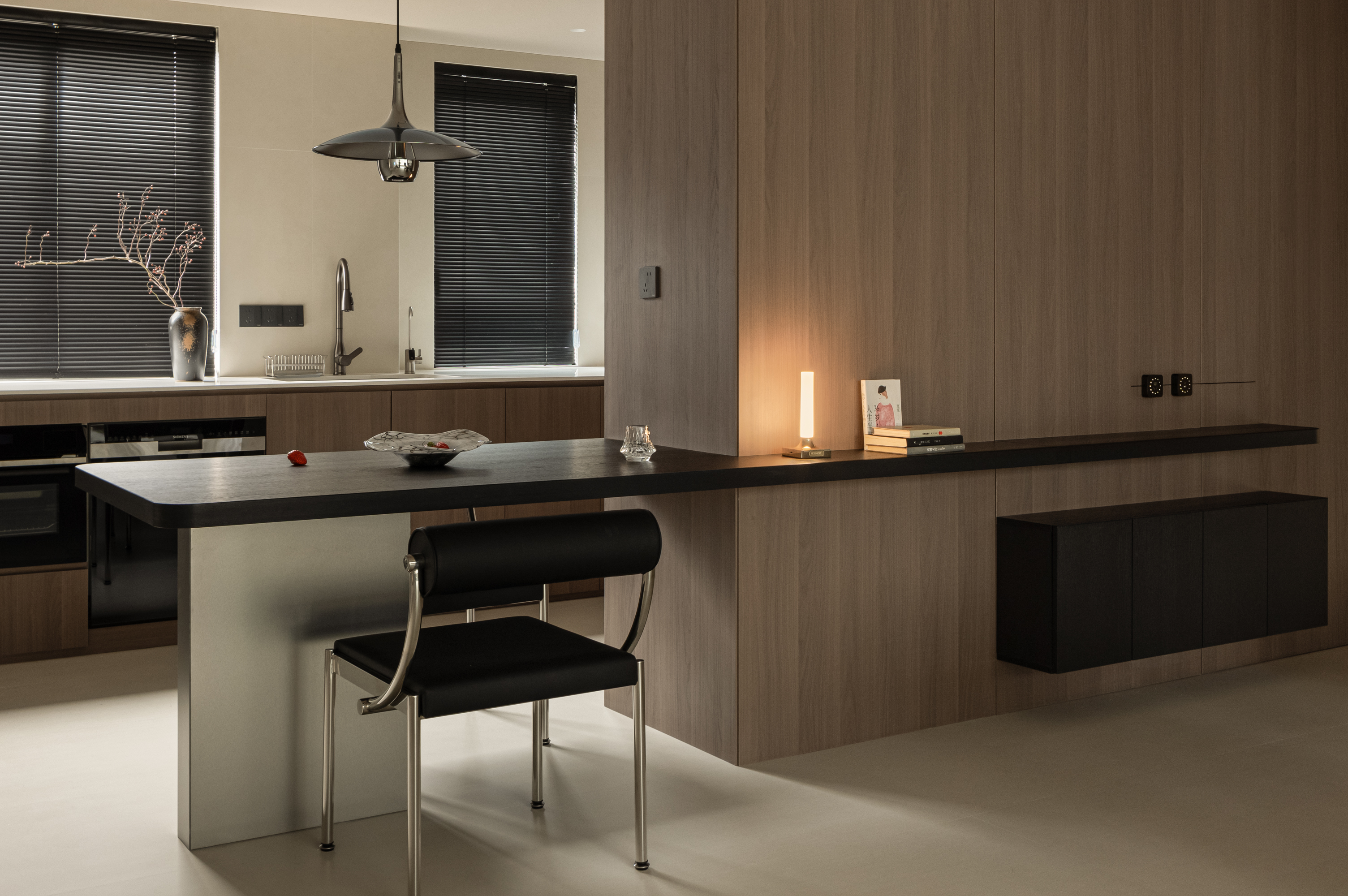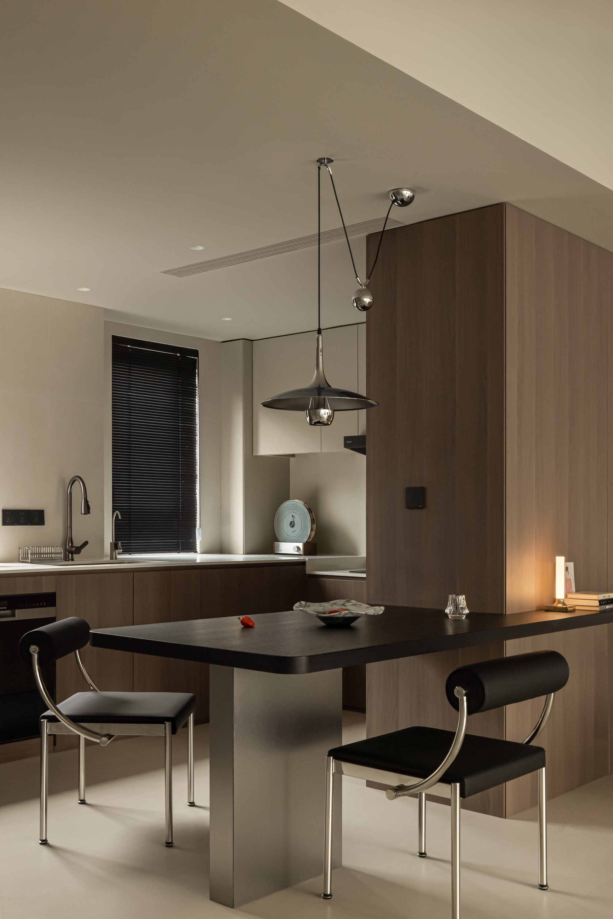 空间意境:黑色木纹餐桌与承重墙穿插咬合,延伸至玄关;木饰面从玄关墙面向厨房自然过渡;不锈钢金属桌腿与线形餐桌形成L型结构