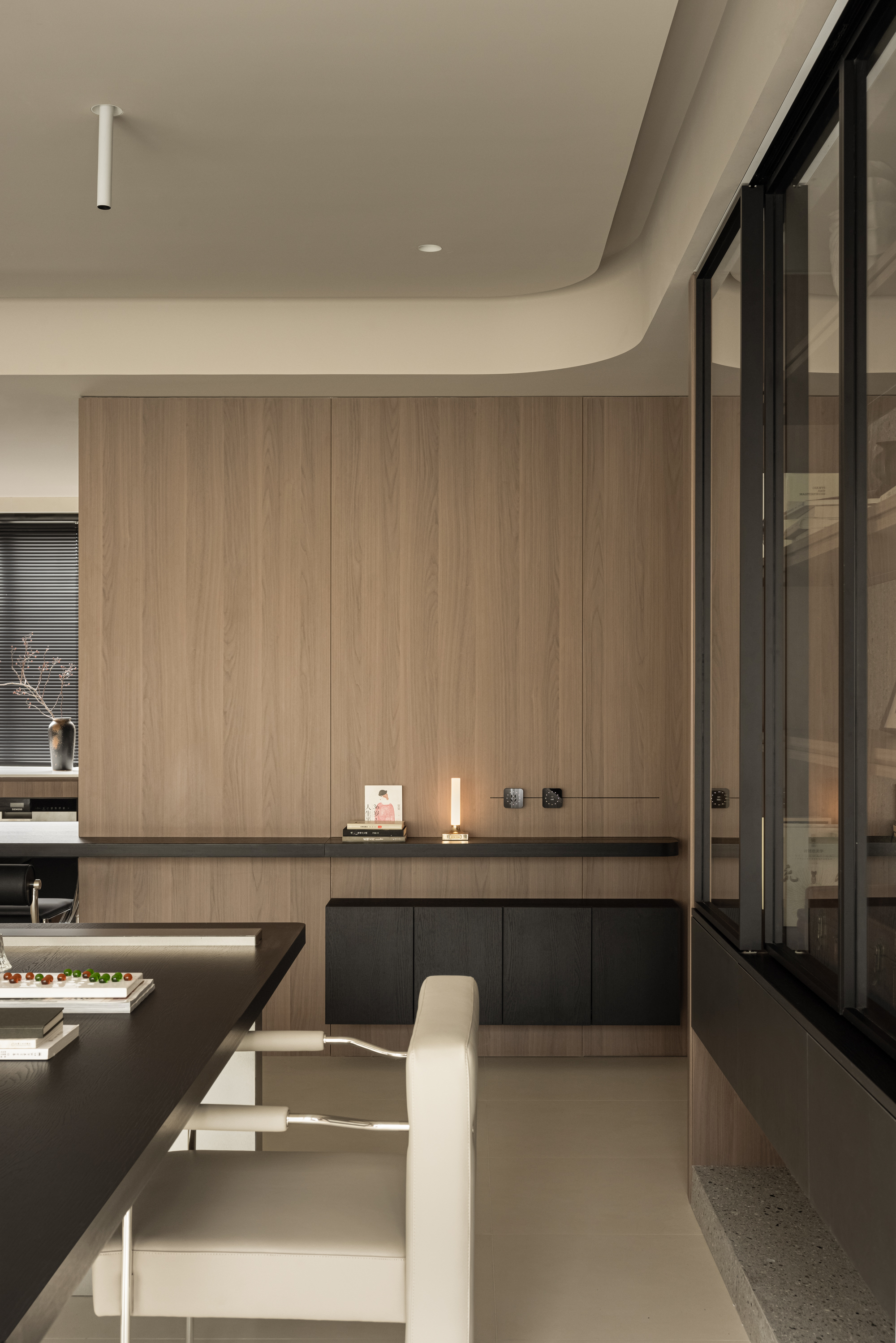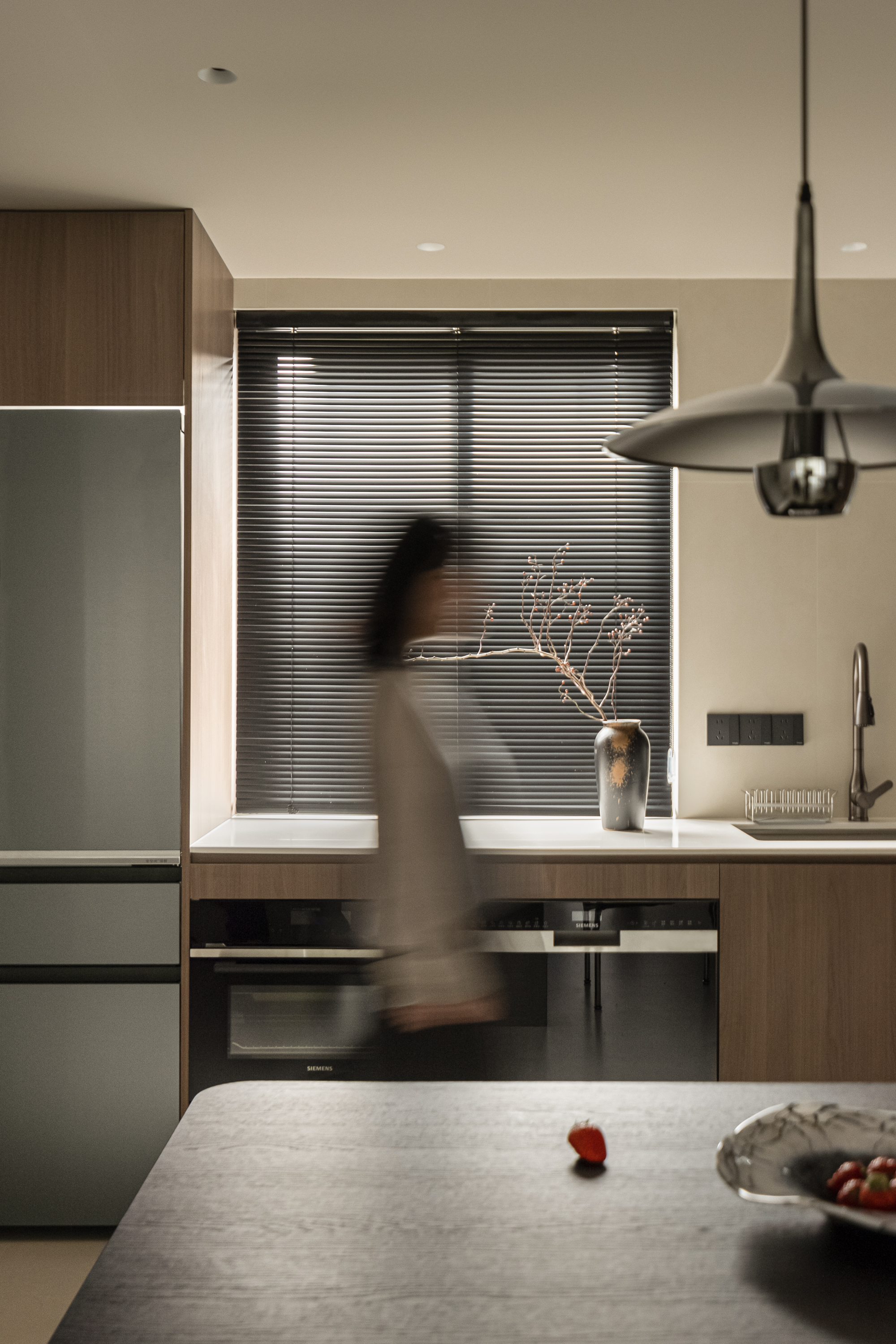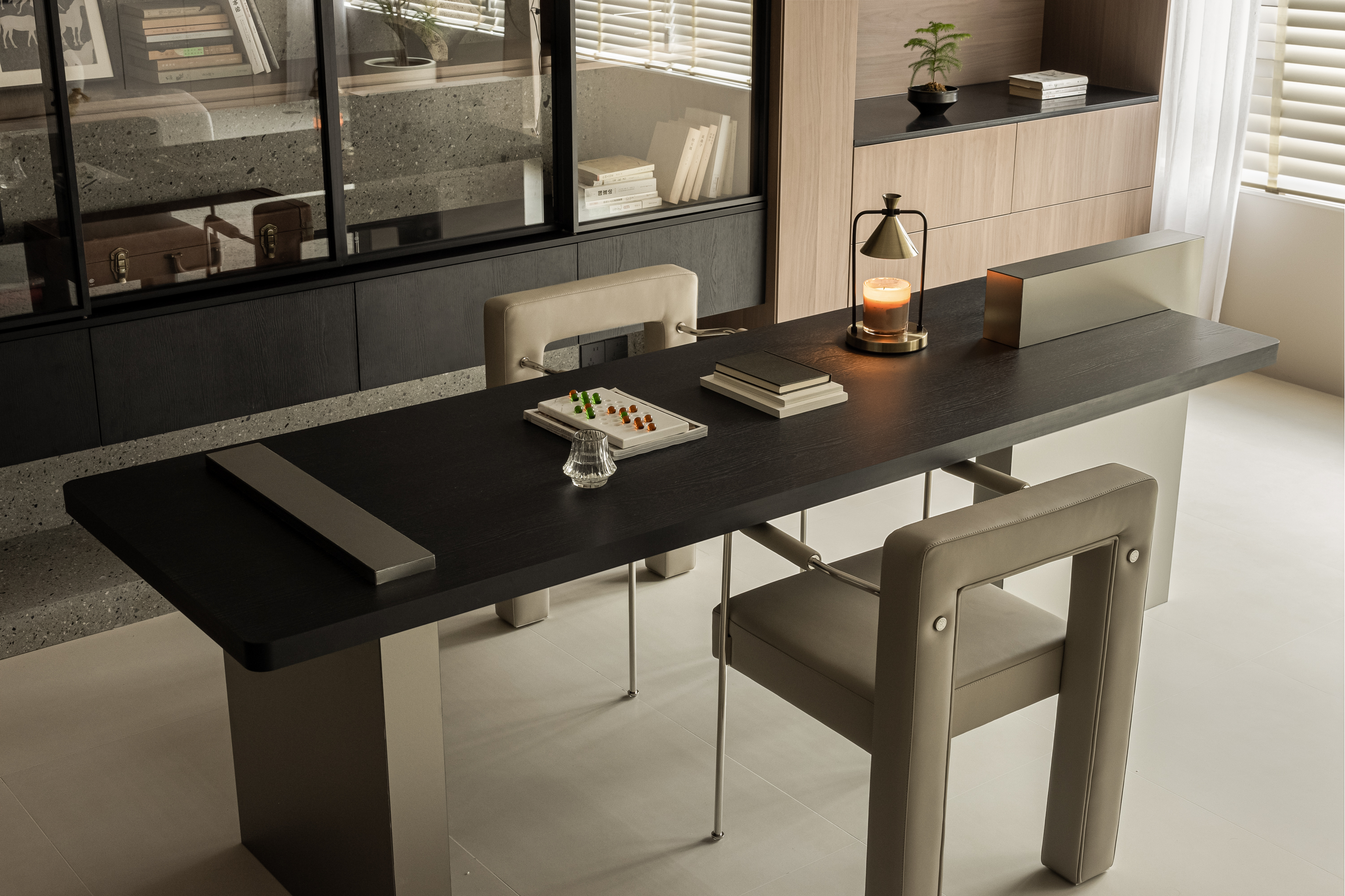 空间意境:黑色木纹餐桌与承重墙穿插咬合,延伸至玄关;木饰面从玄关墙面向厨房自然过渡;不锈钢金属桌腿与线形餐桌形成L型结构