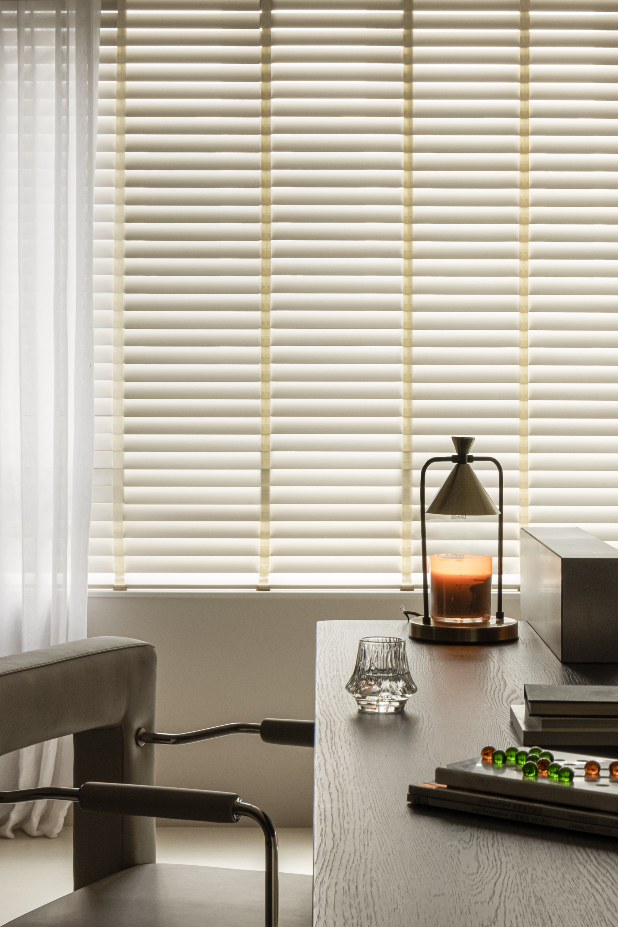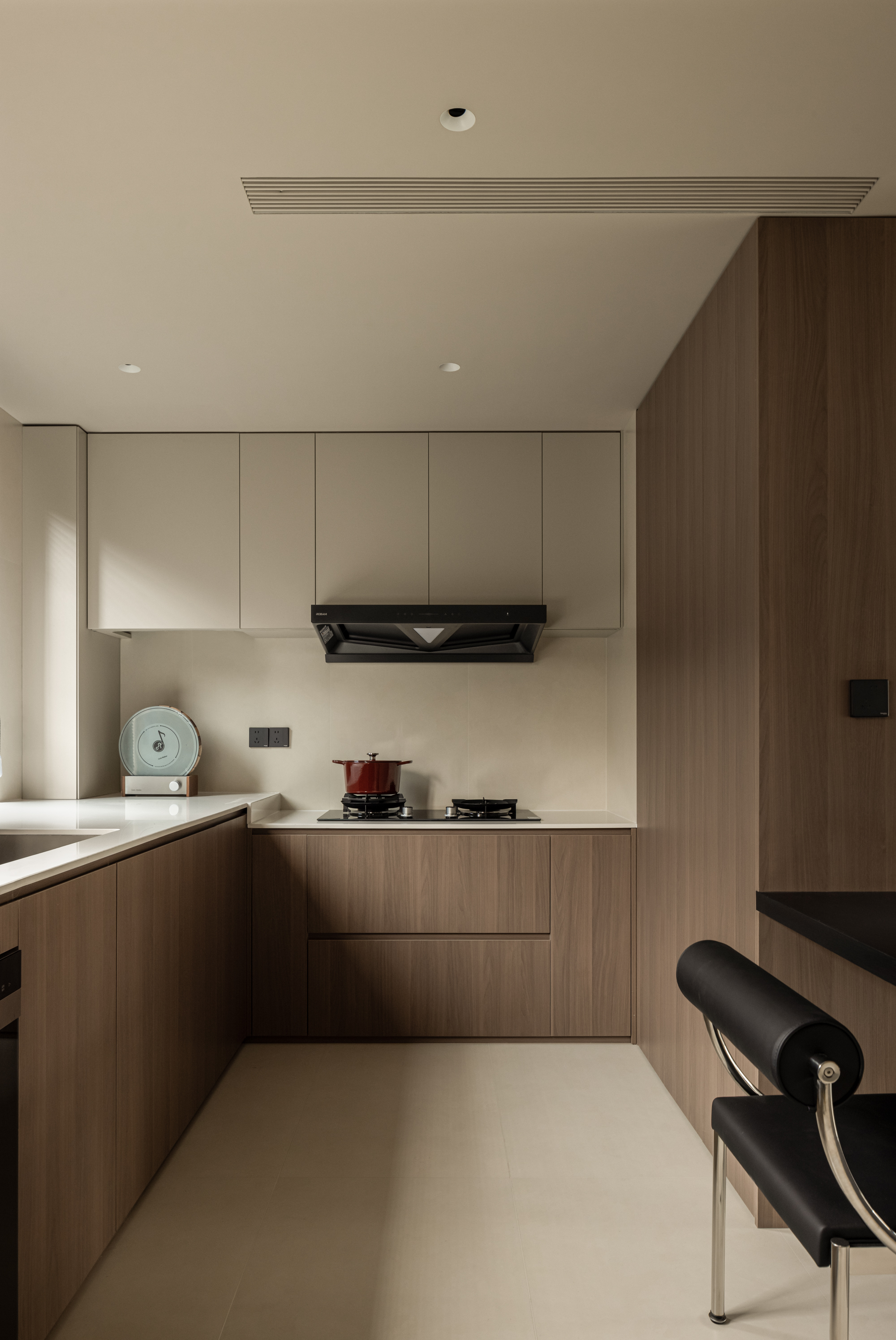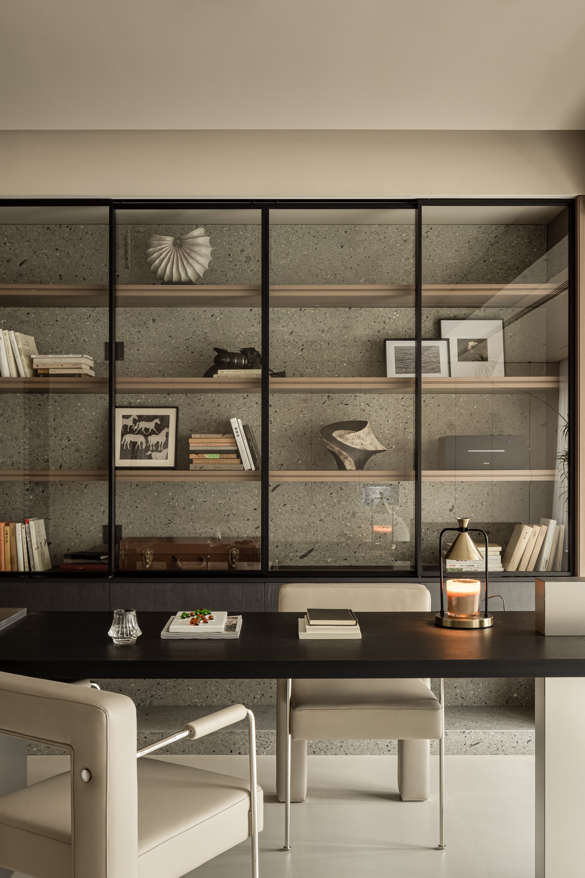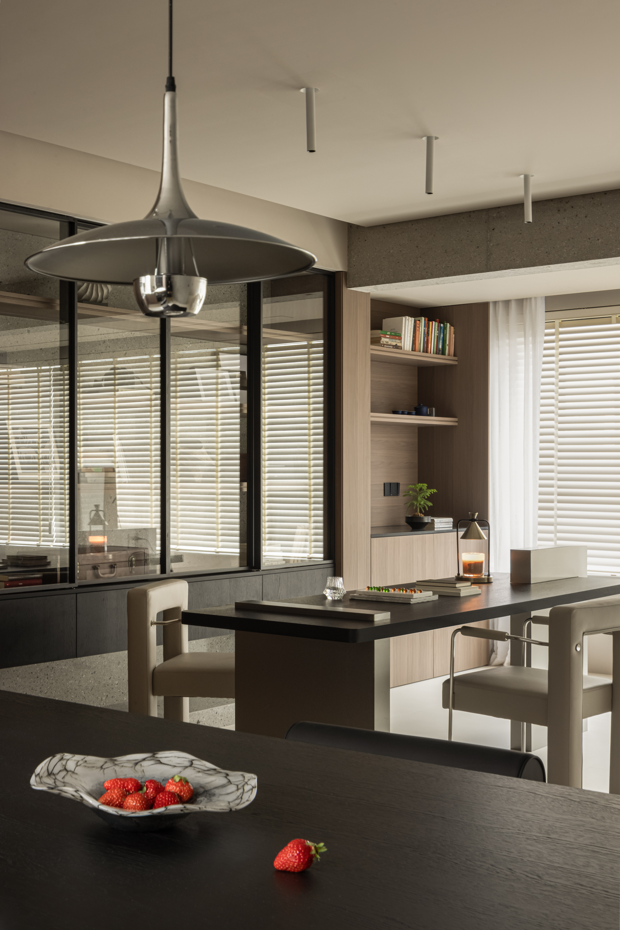 空间意境:黑色木纹餐桌与承重墙穿插咬合,延伸至玄关;木饰面从玄关墙面向厨房自然过渡;不锈钢金属桌腿与线形餐桌形成L型结构