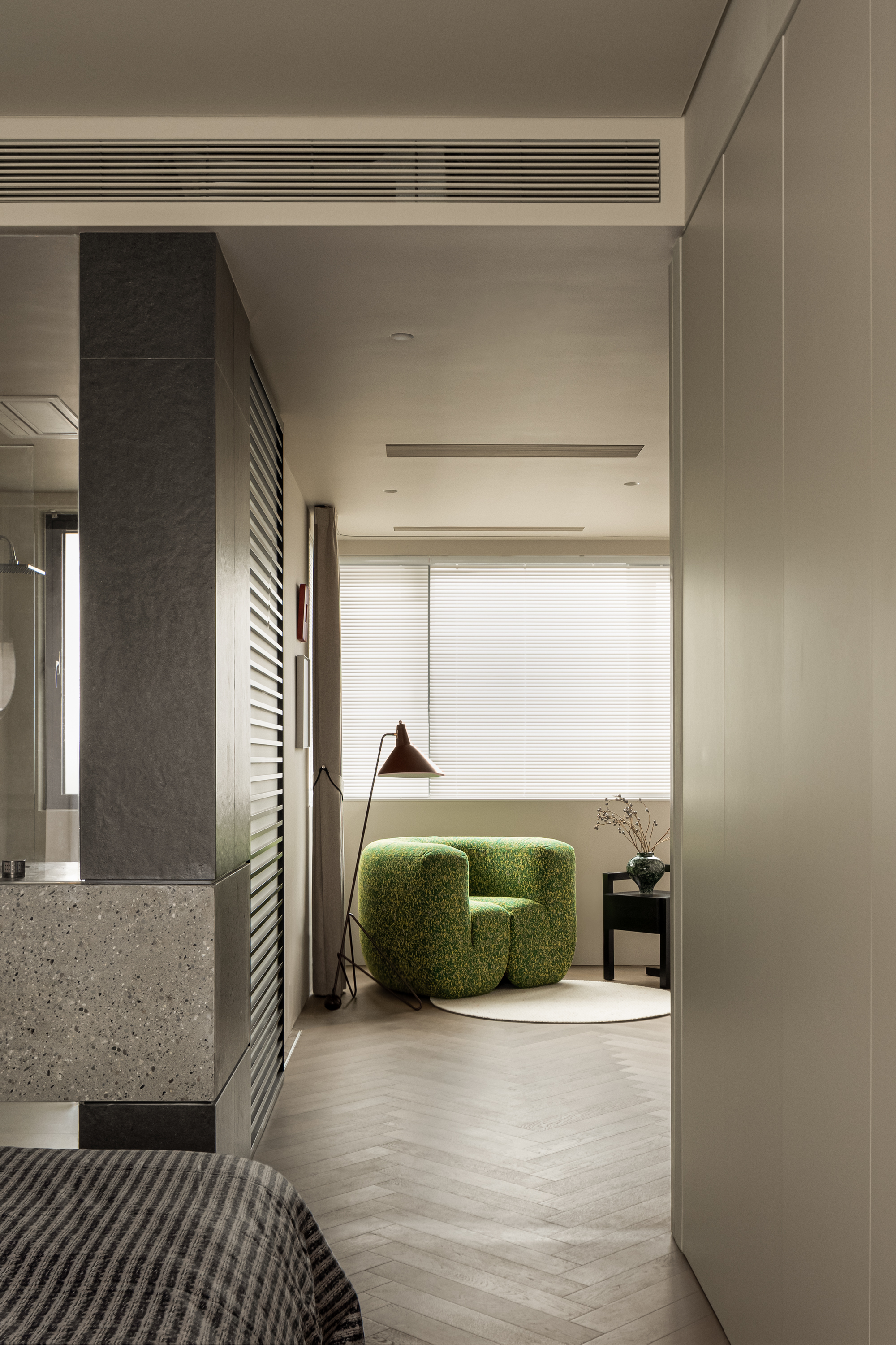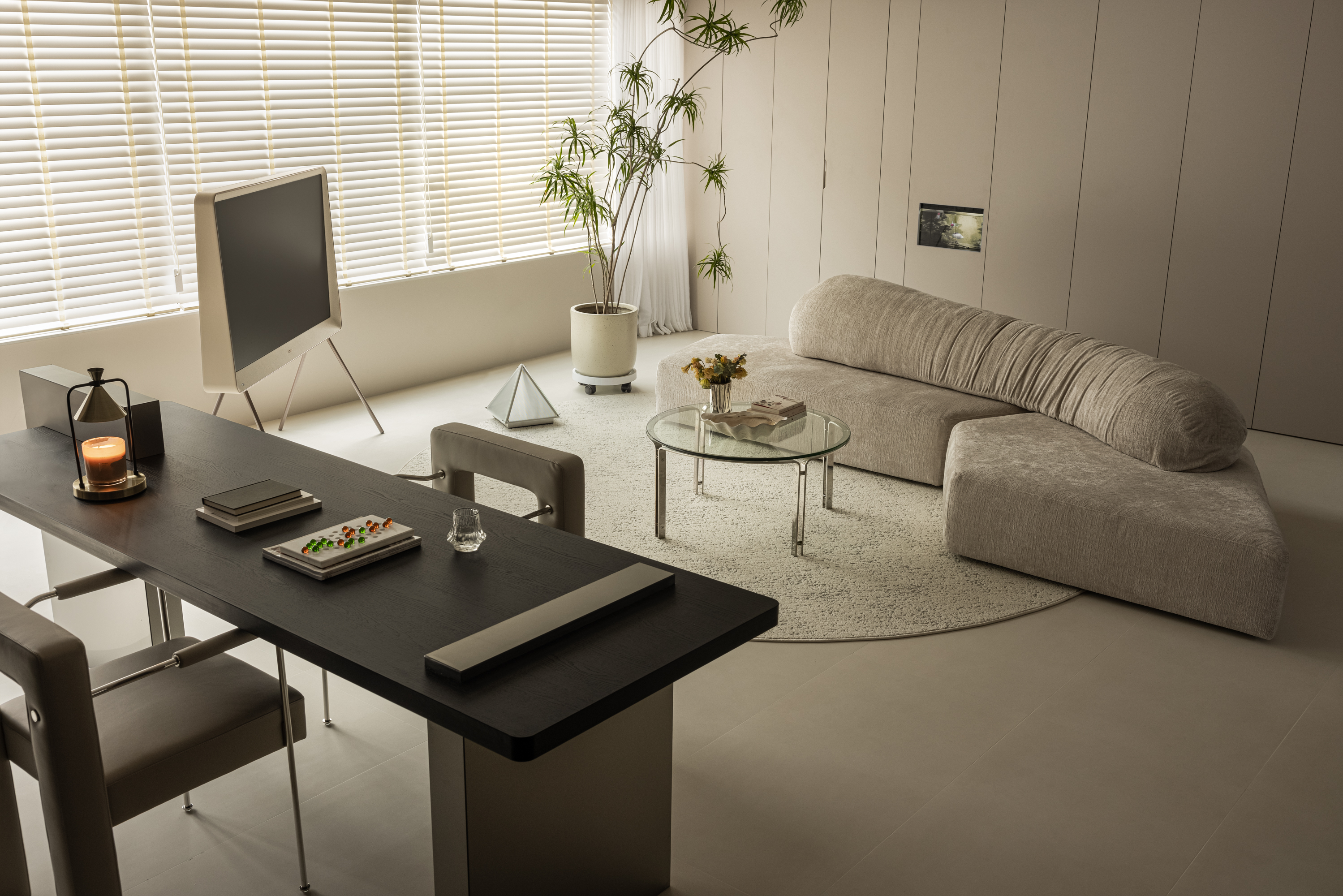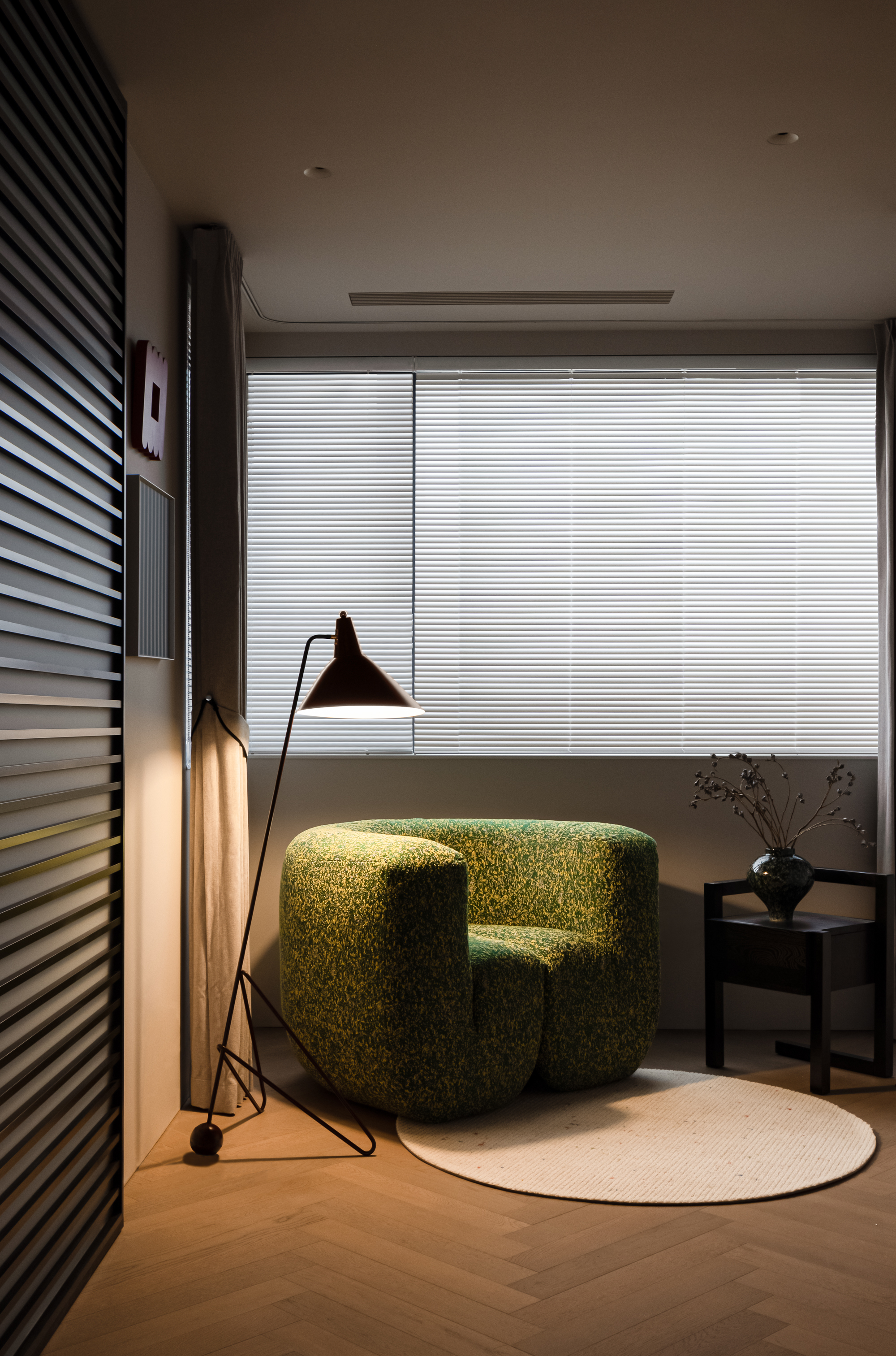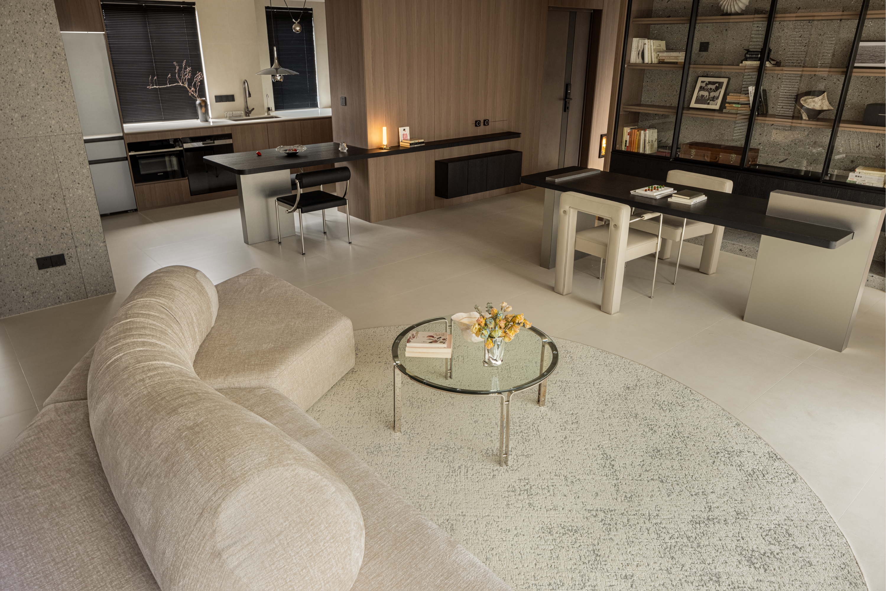 空间布局:选用灰白相间的岩石沙发,以几何切割塑造多面体块的拼接形态,适应不同角度的视线和空间布局,构成家庭核心区,与书房、与餐厨、与玄关等多空间形成视觉对话,为居者实现了“平行陪伴”的美好生活场景。