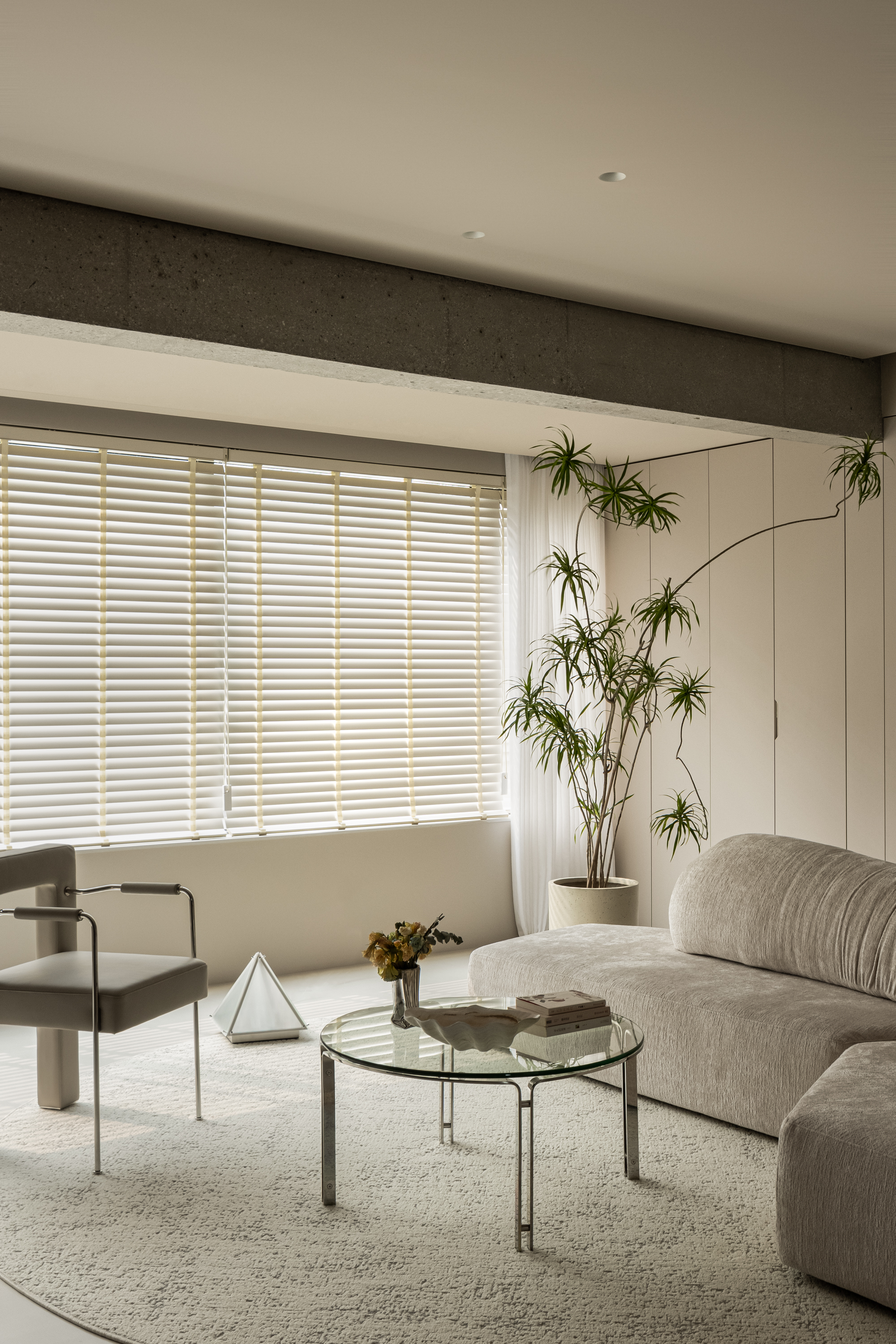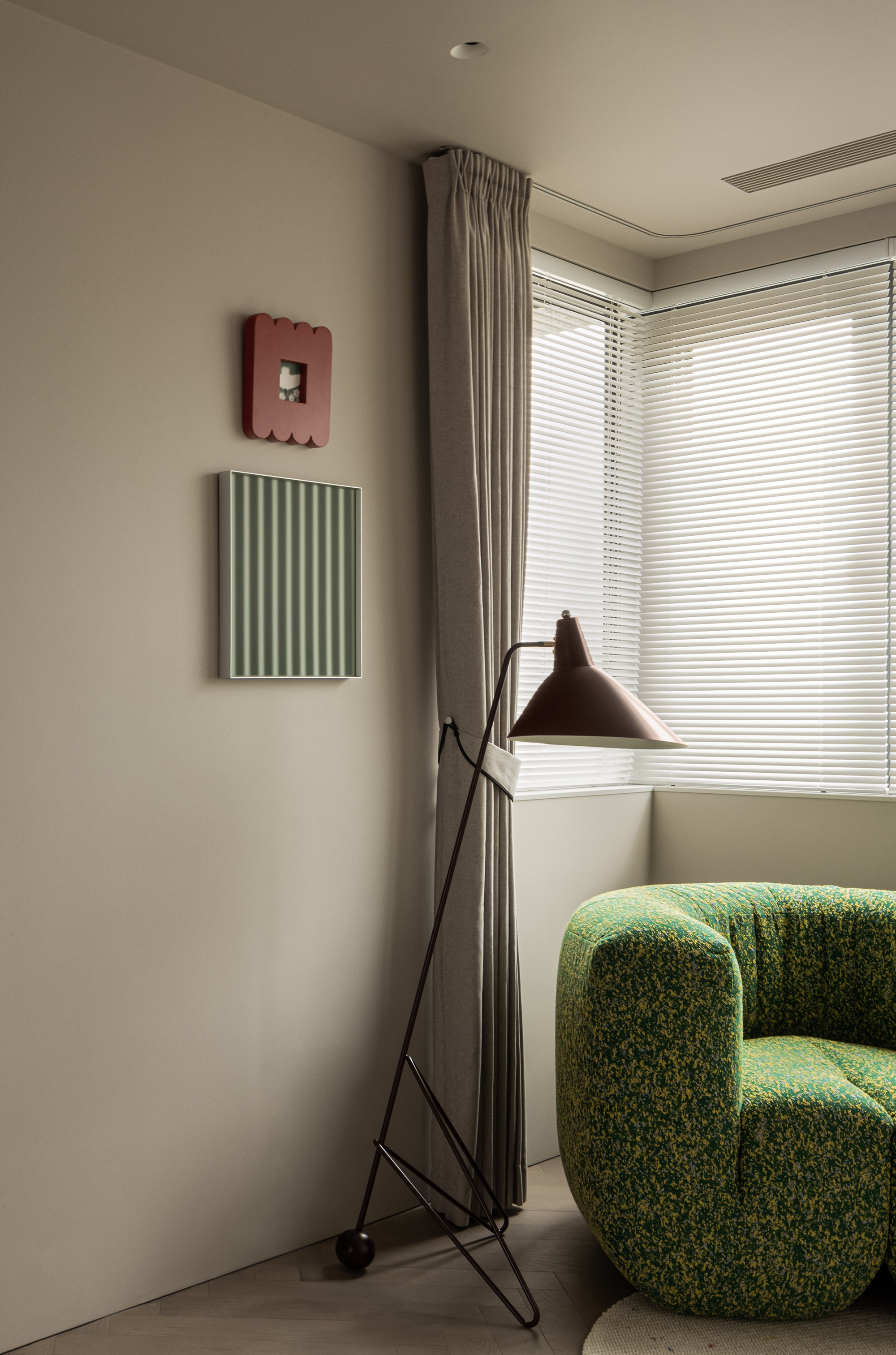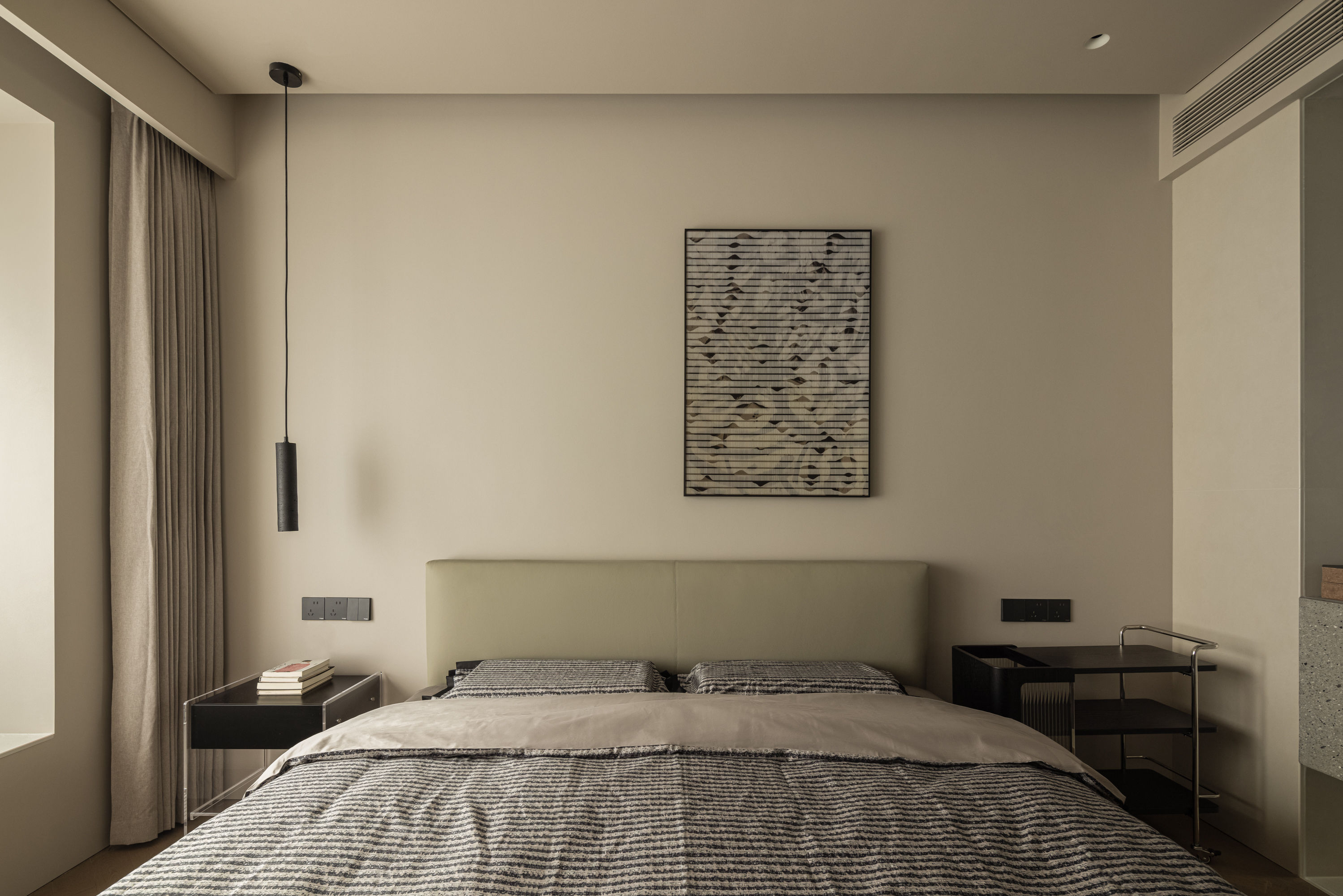 空间布局:选用灰白相间的岩石沙发,以几何切割塑造多面体块的拼接形态,适应不同角度的视线和空间布局,构成家庭核心区,与书房、与餐厨、与玄关等多空间形成视觉对话,为居者实现了“平行陪伴”的美好生活场景。