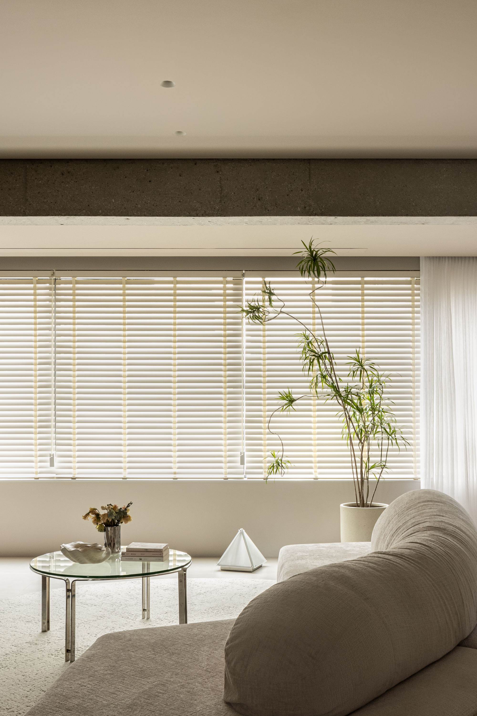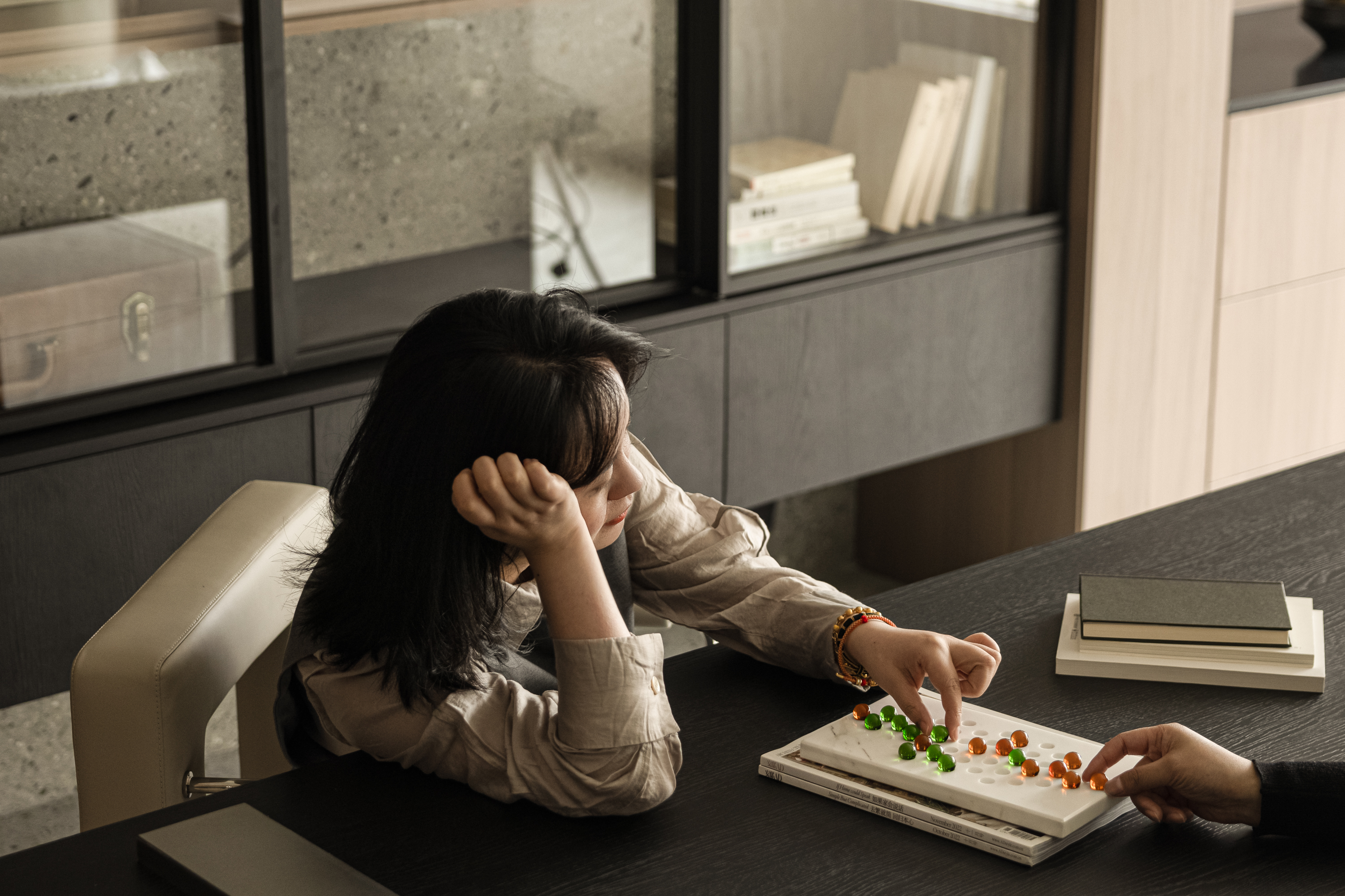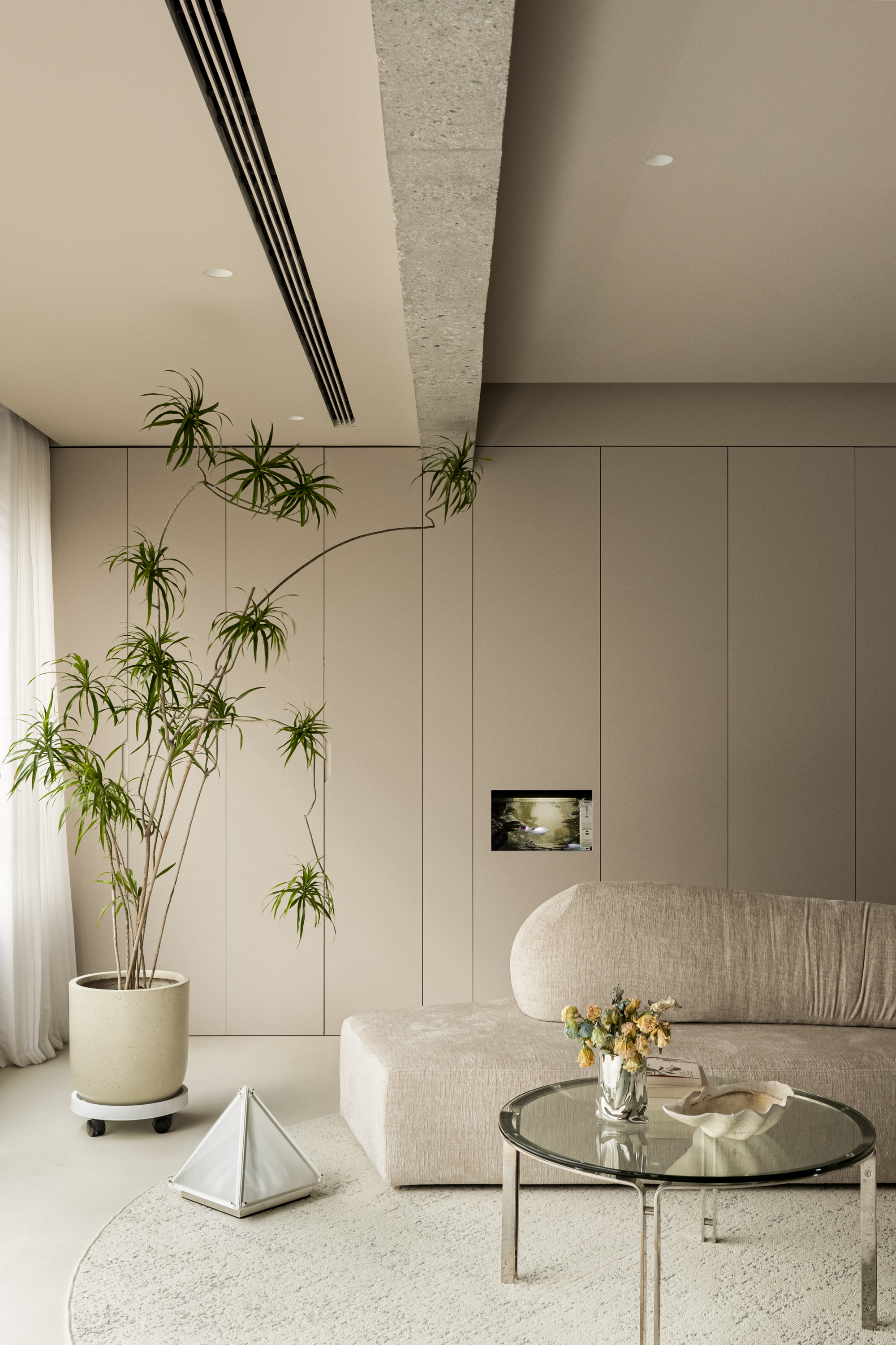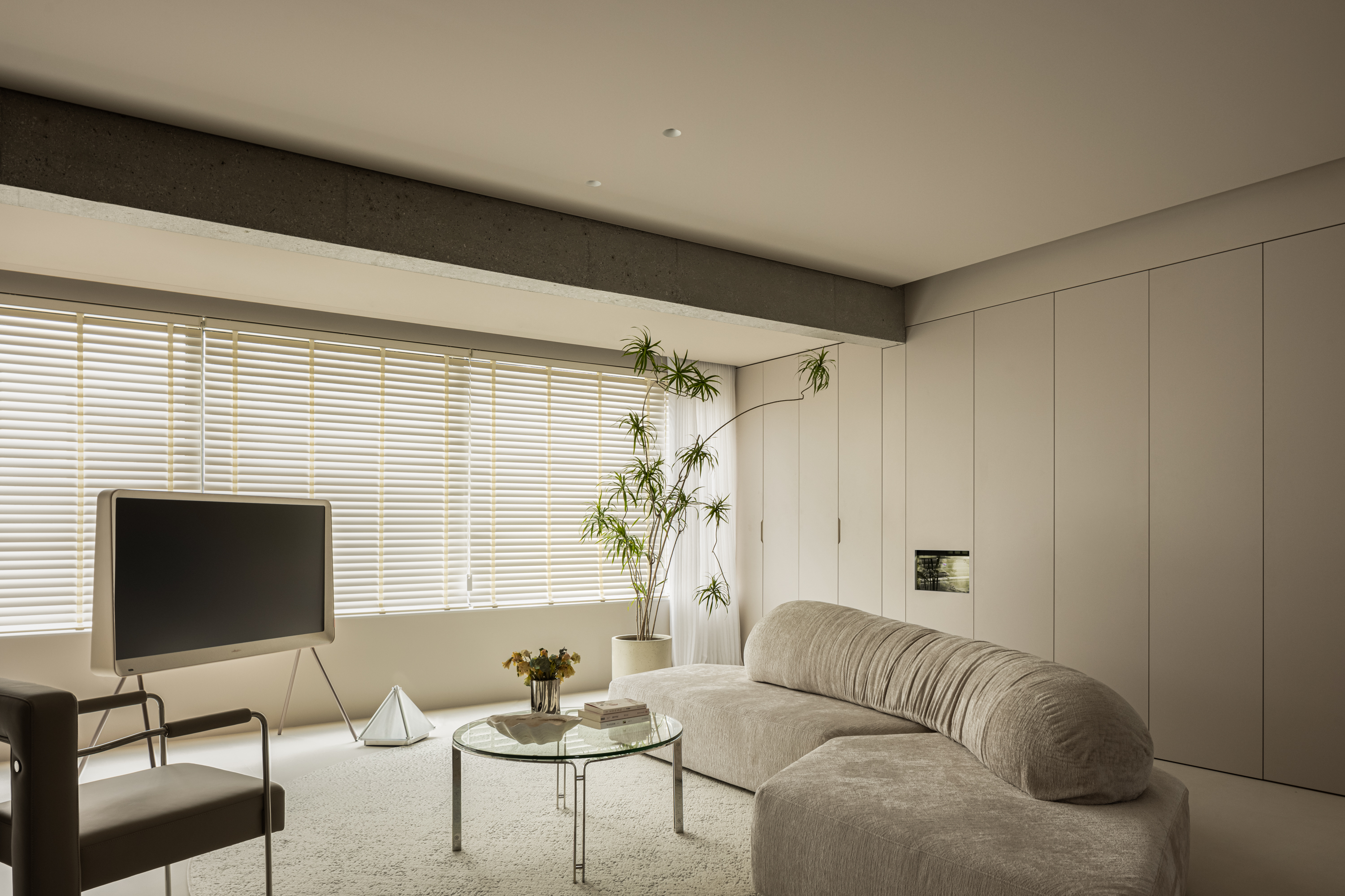 空间布局:选用灰白相间的岩石沙发,以几何切割塑造多面体块的拼接形态,适应不同角度的视线和空间布局,构成家庭核心区,与书房、与餐厨、与玄关等多空间形成视觉对话,为居者实现了“平行陪伴”的美好生活场景。