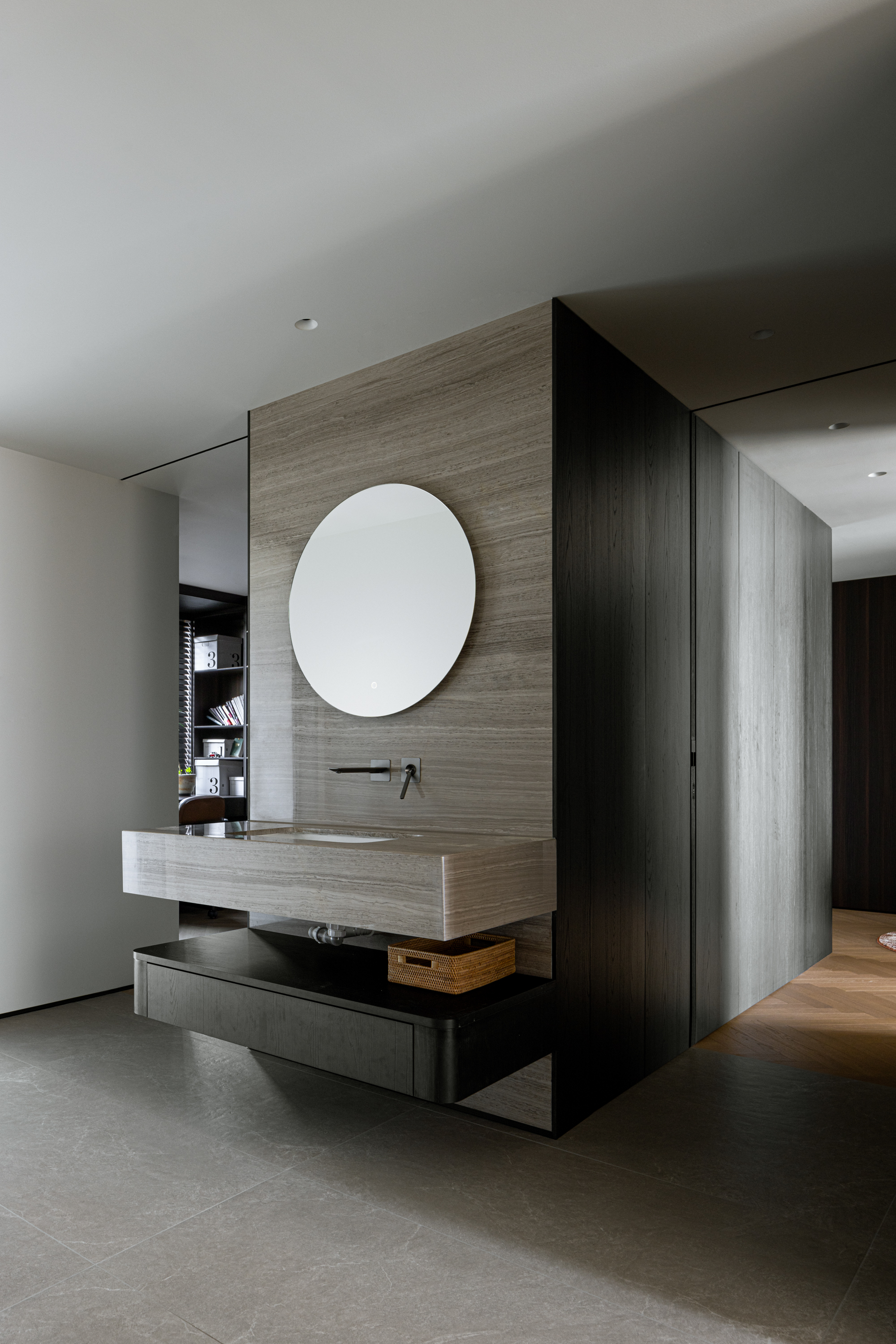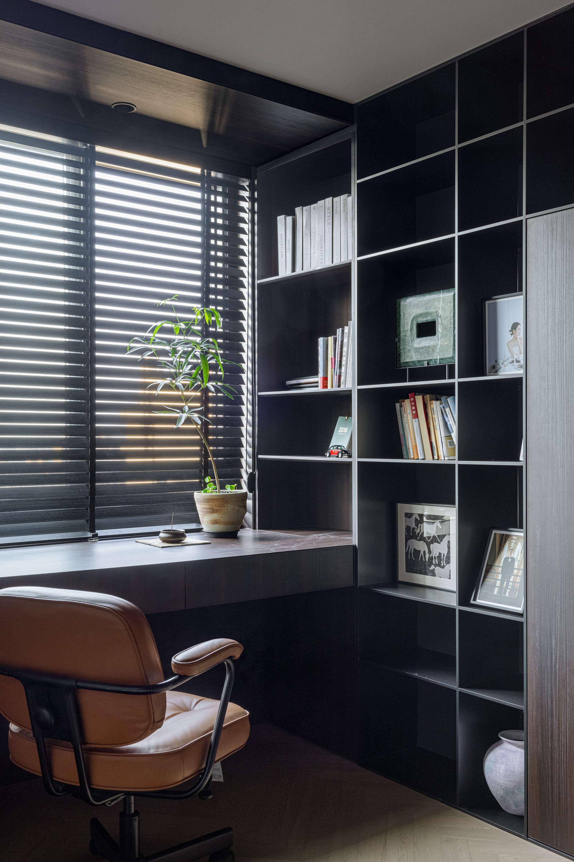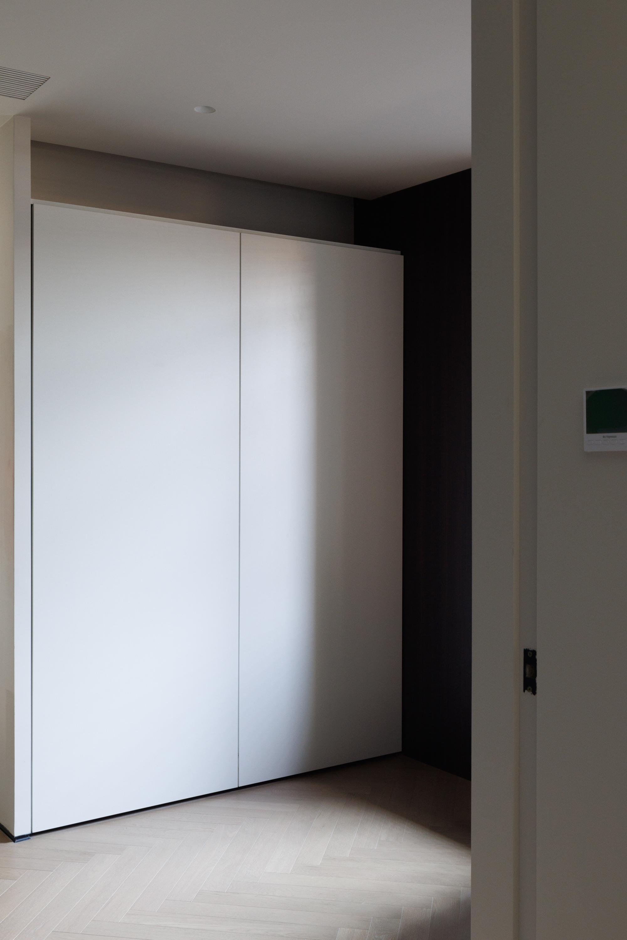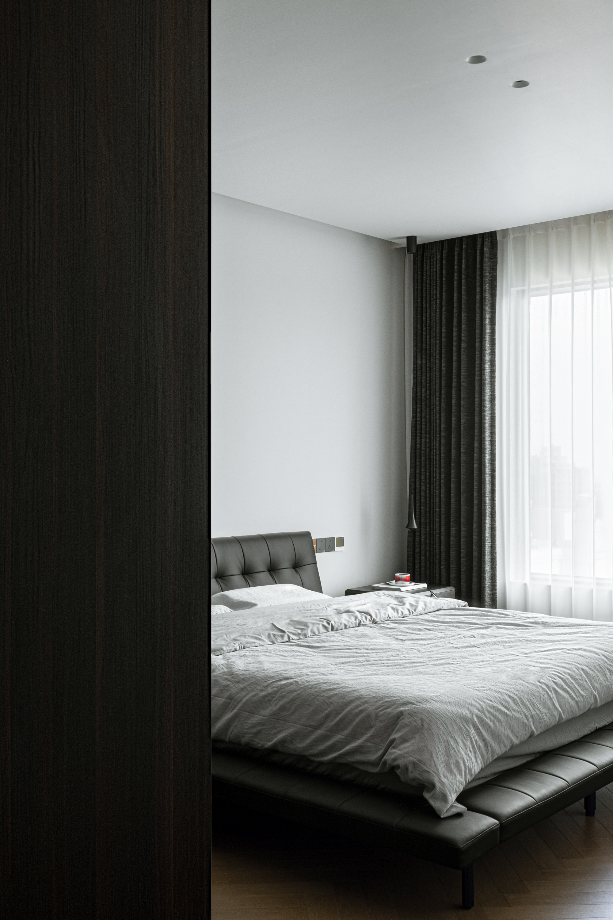 组合柜内隐秘嵌套三扇同材质口袋门,通过极简的线性吊轨悄然开合——书房可独立办公及留宿,氛围静谧,卧室可开放联动,场景灵活切换。