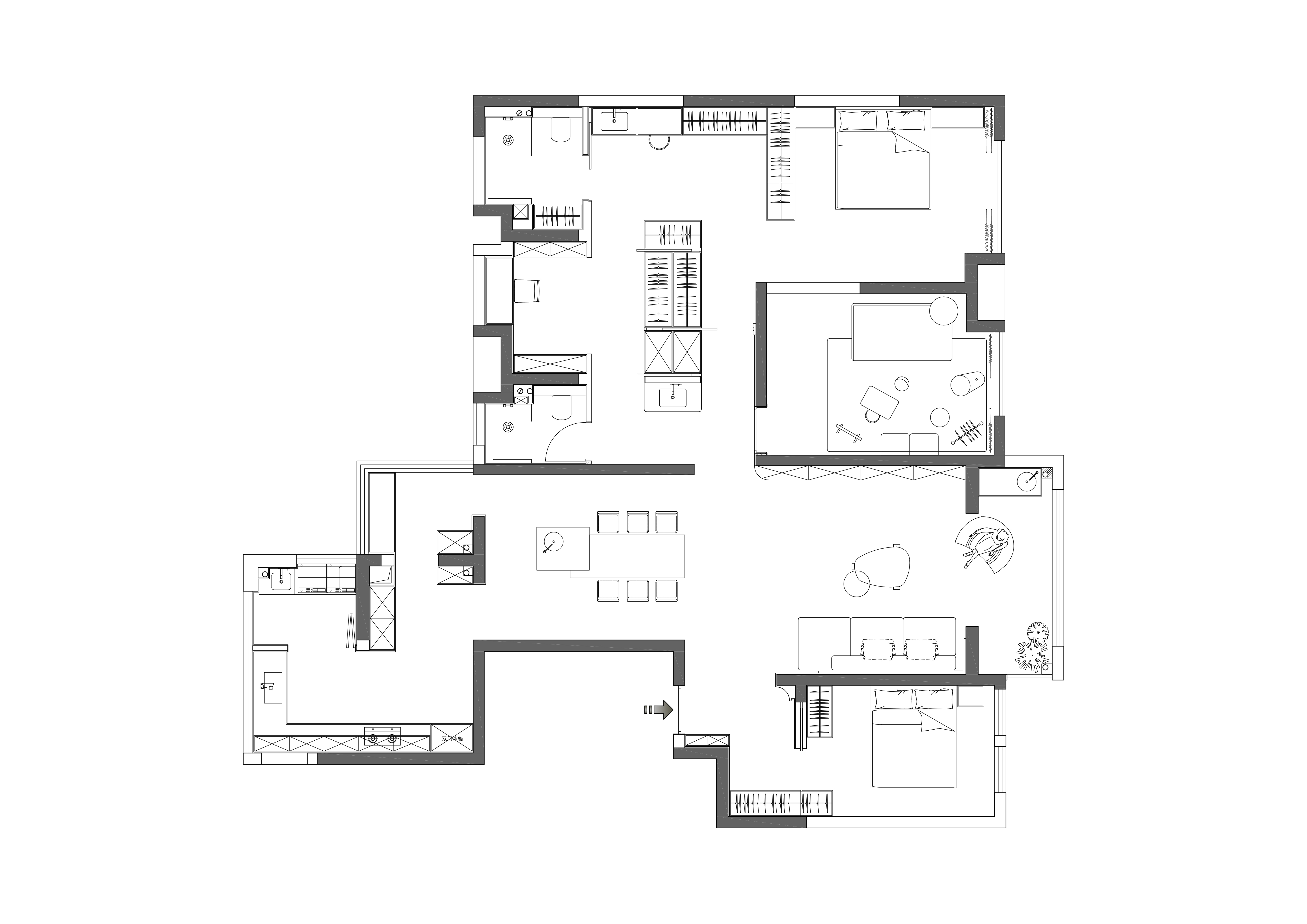 空间布局:主卧套房以创新的 “背靠背组合柜” 为核心,自然分割空间的同时,巧妙构建环绕型动线,视线与光线在此自由穿透、延伸,空间豁然开朗。