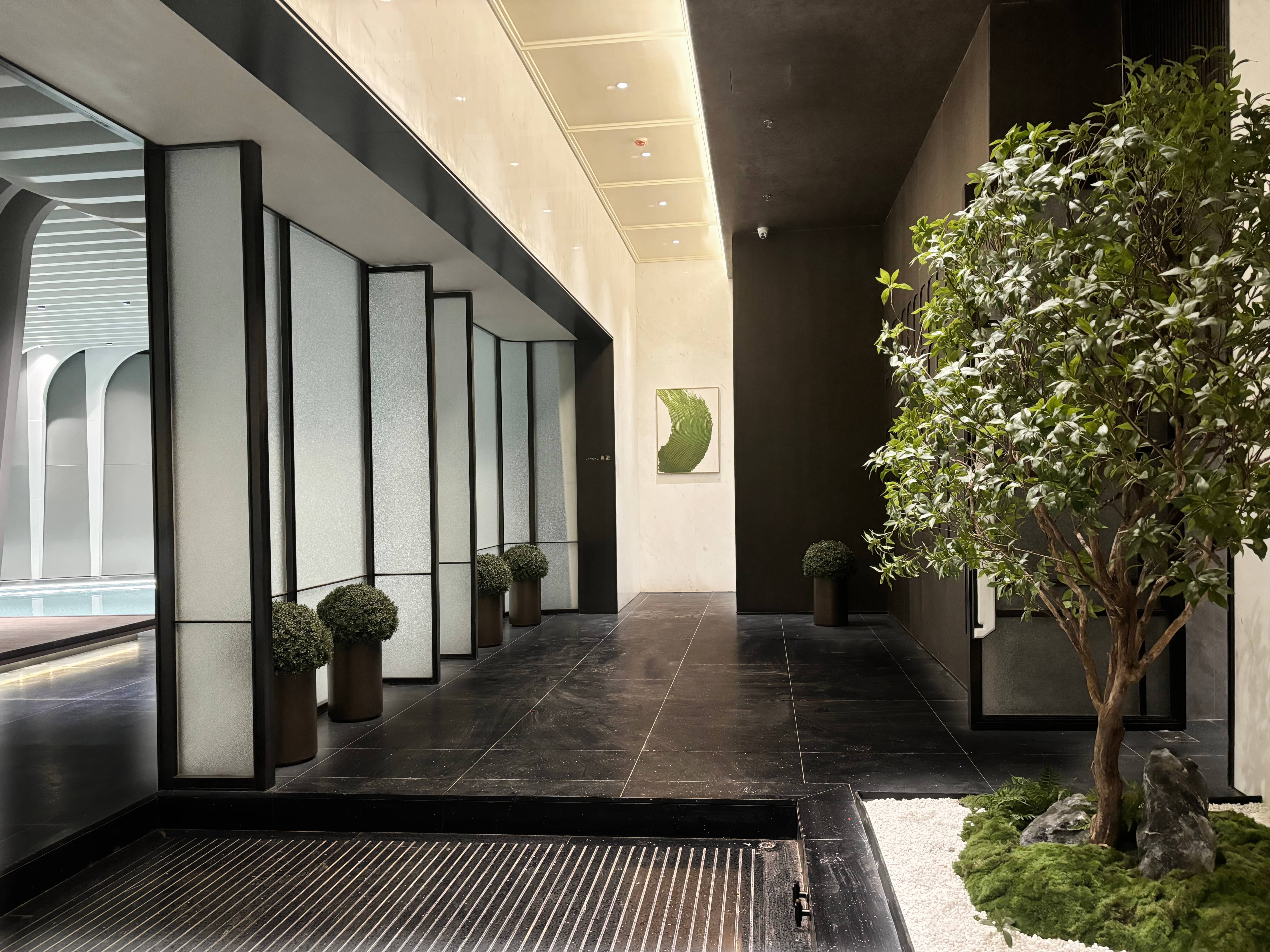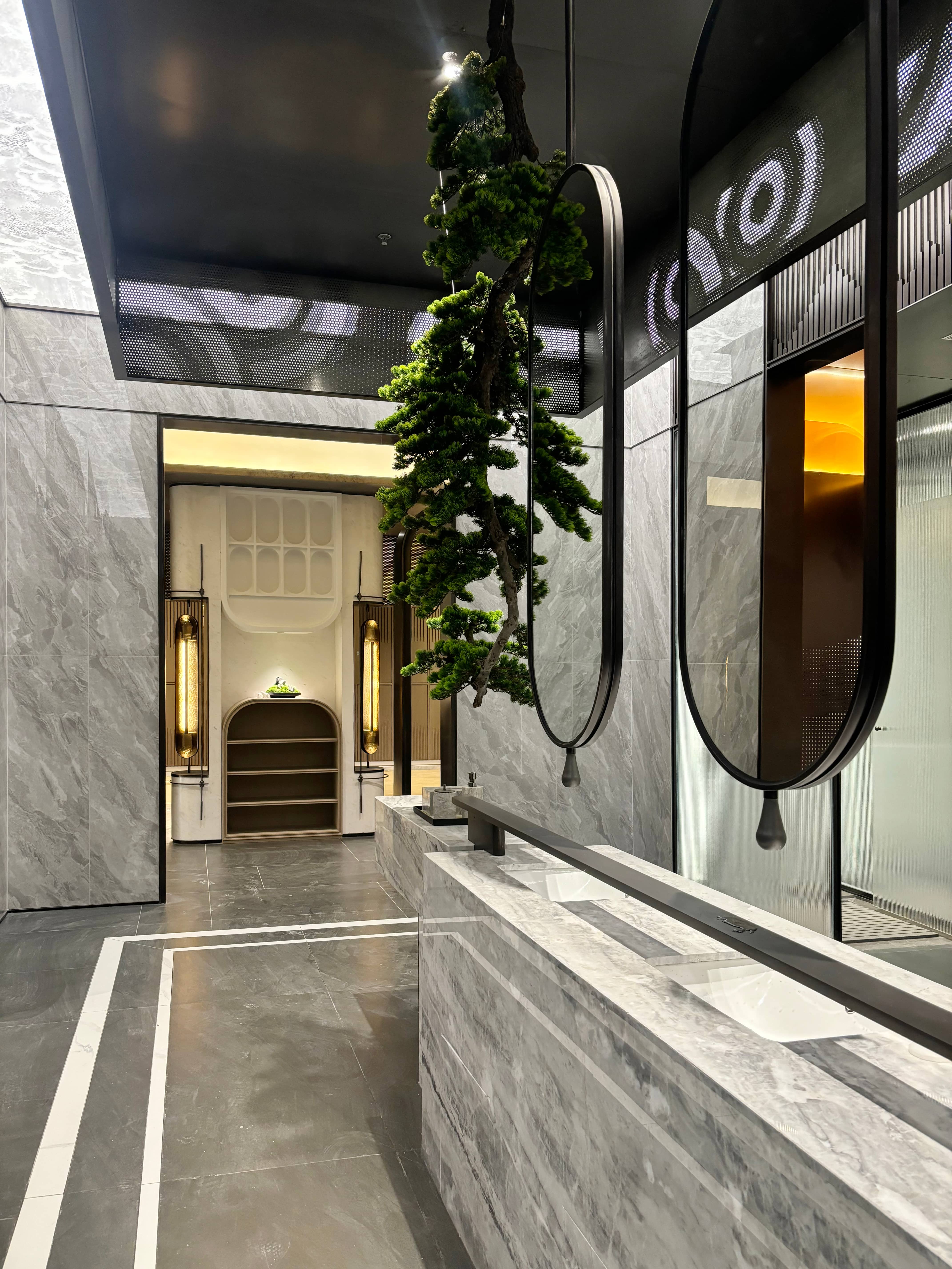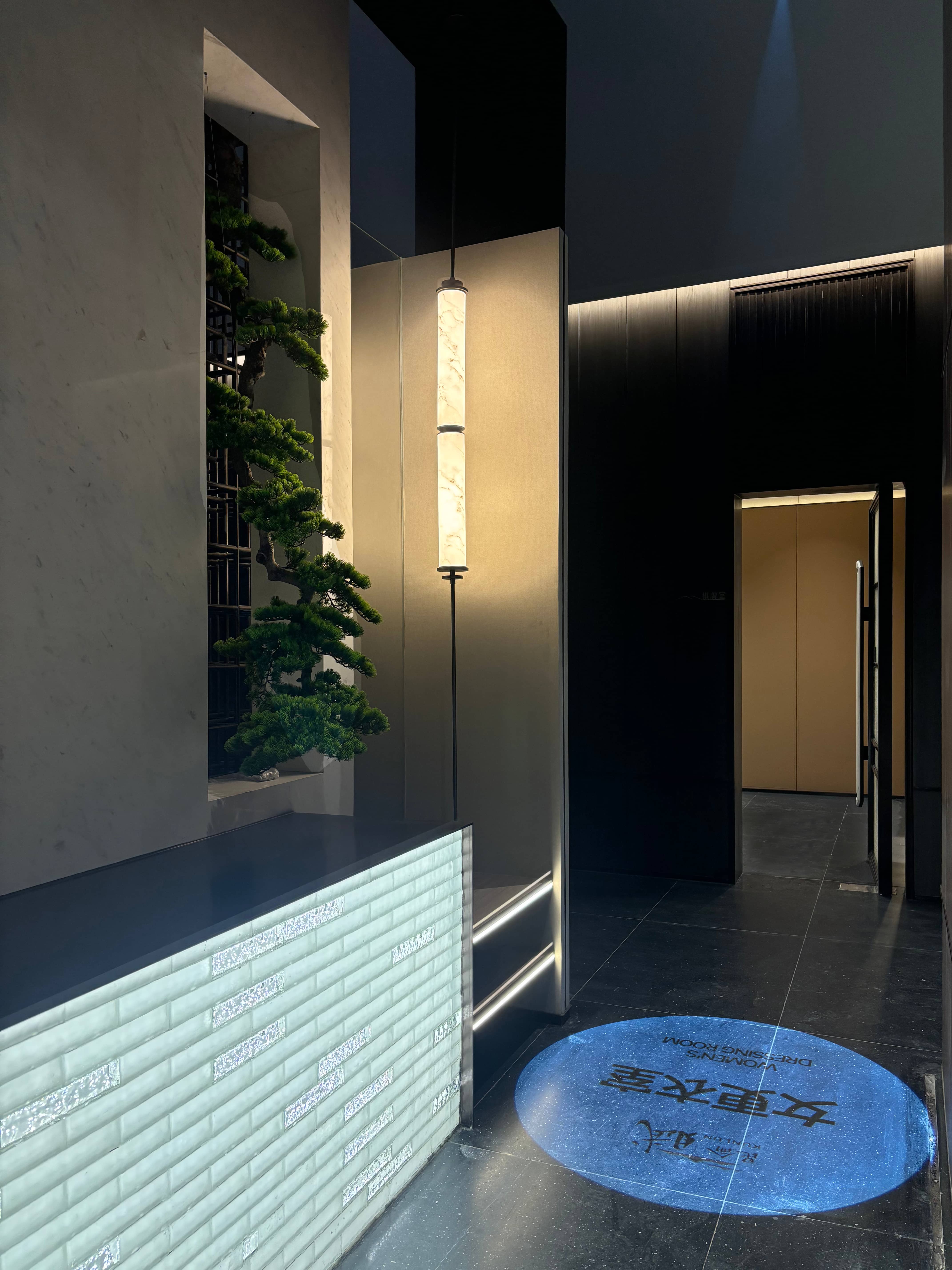空间意境:会所环境风格创新以“暗调奢境·冰韵新生”为核心,将北方冰雪基因与现代奢华肌理深度共生,打破传统暗调空间的沉闷感。空间基底以墨黑哑光石材与深棕丝绒奠定沉稳基调,创新融入冰晶元素——接待区屏风采用双层夹丝玻璃,内嵌仿冰晶切割的金属线条,冷光映照下如冰封艺术装置,呼应哈尔滨地域特质。项目处于负一层无窗空间,引入大量绿植来营造空间生机勃勃的景象。