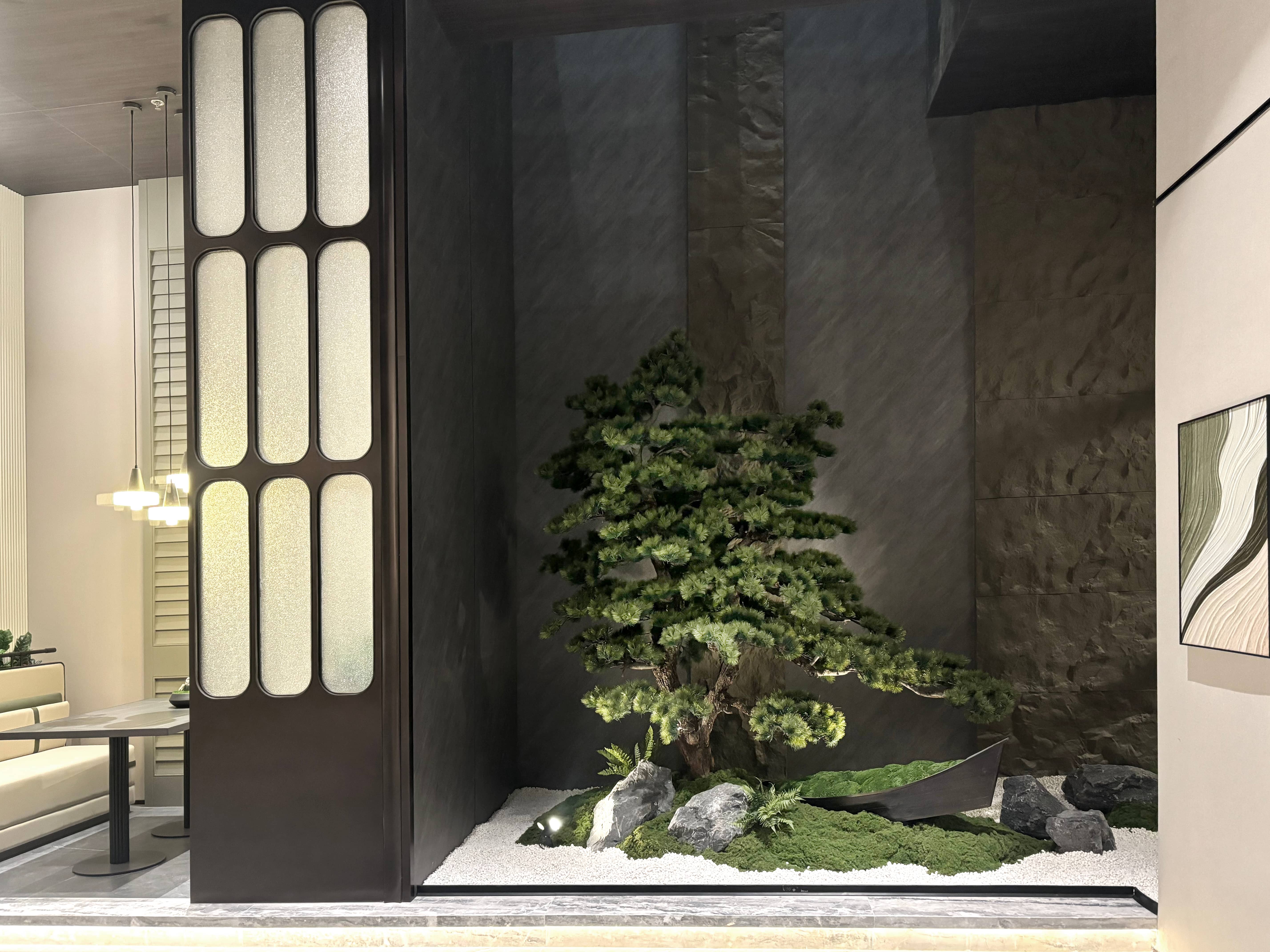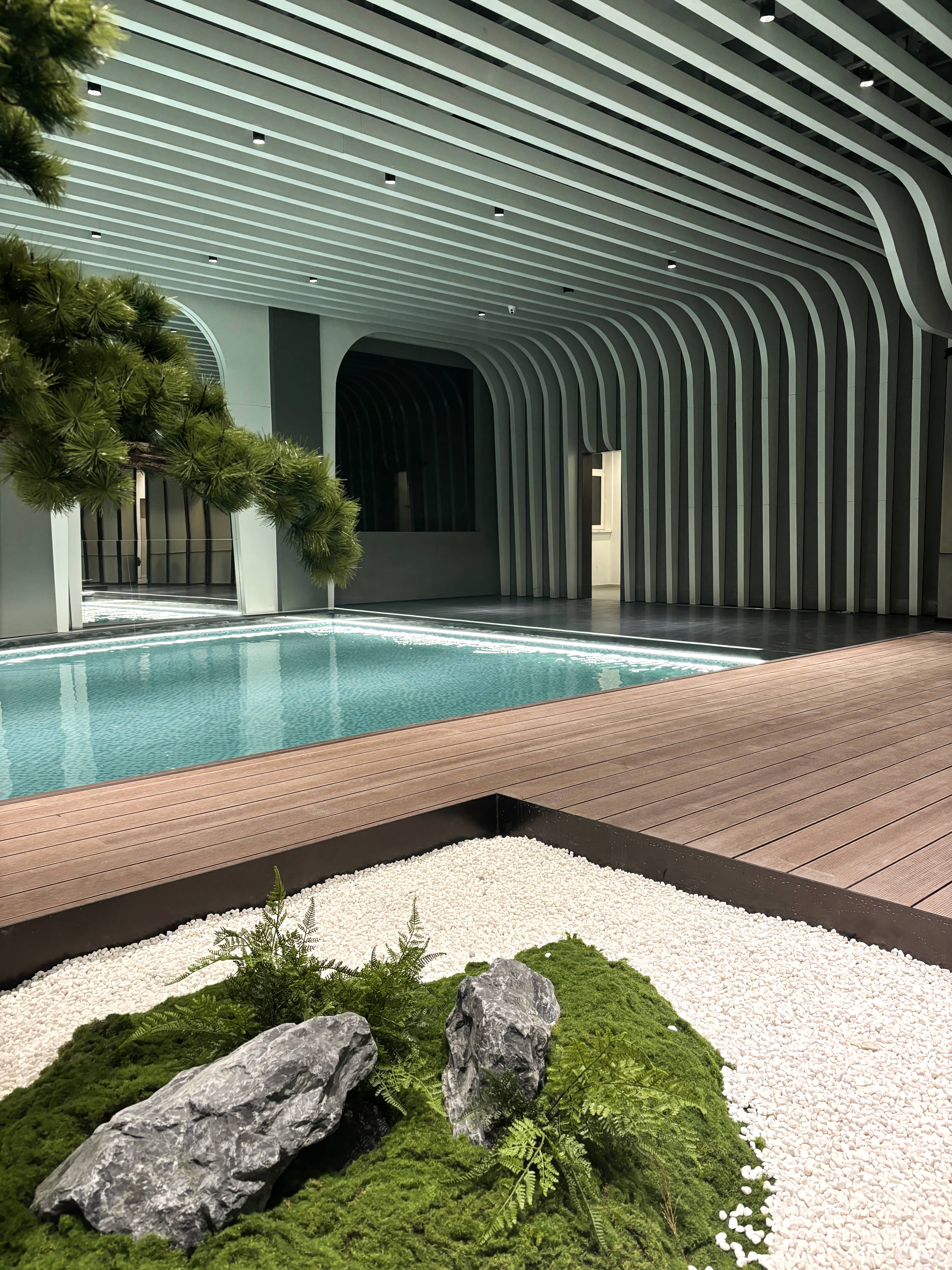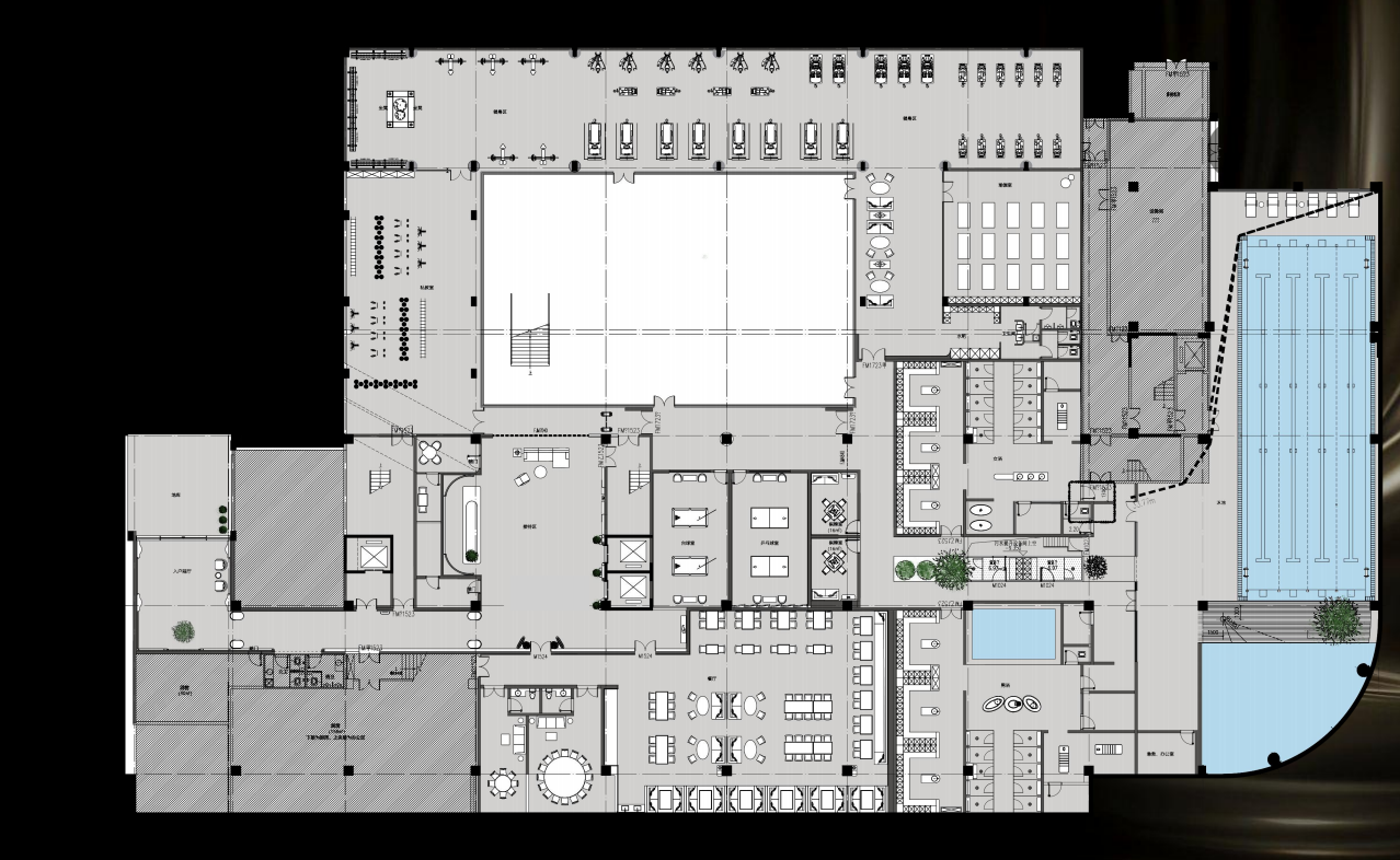 空间意境:会所环境风格创新以“暗调奢境·冰韵新生”为核心,将北方冰雪基因与现代奢华肌理深度共生,打破传统暗调空间的沉闷感。空间基底以墨黑哑光石材与深棕丝绒奠定沉稳基调,创新融入冰晶元素——接待区屏风采用双层夹丝玻璃,内嵌仿冰晶切割的金属线条,冷光映照下如冰封艺术装置,呼应哈尔滨地域特质。项目处于负一层无窗空间,引入大量绿植来营造空间生机勃勃的景象。