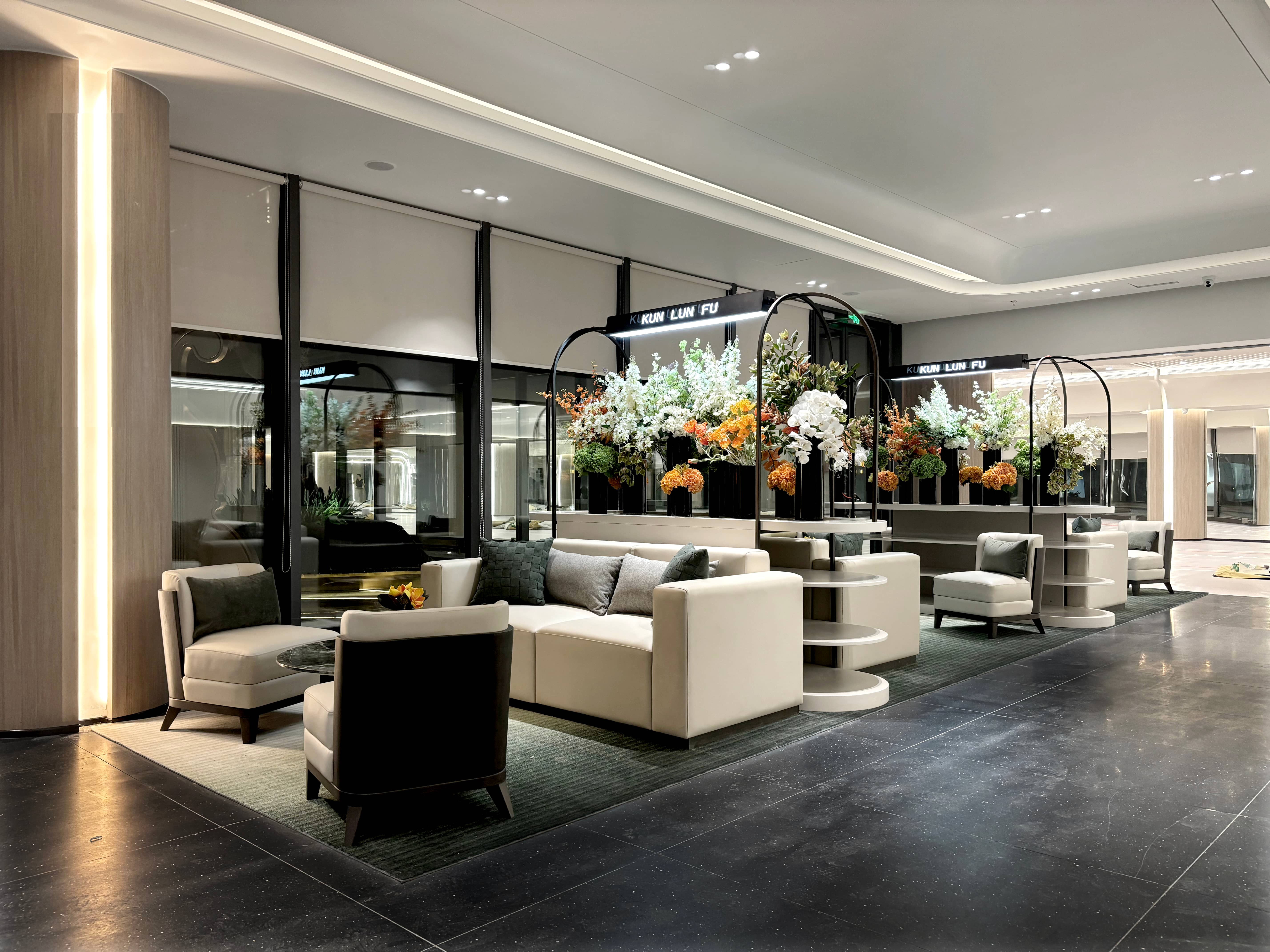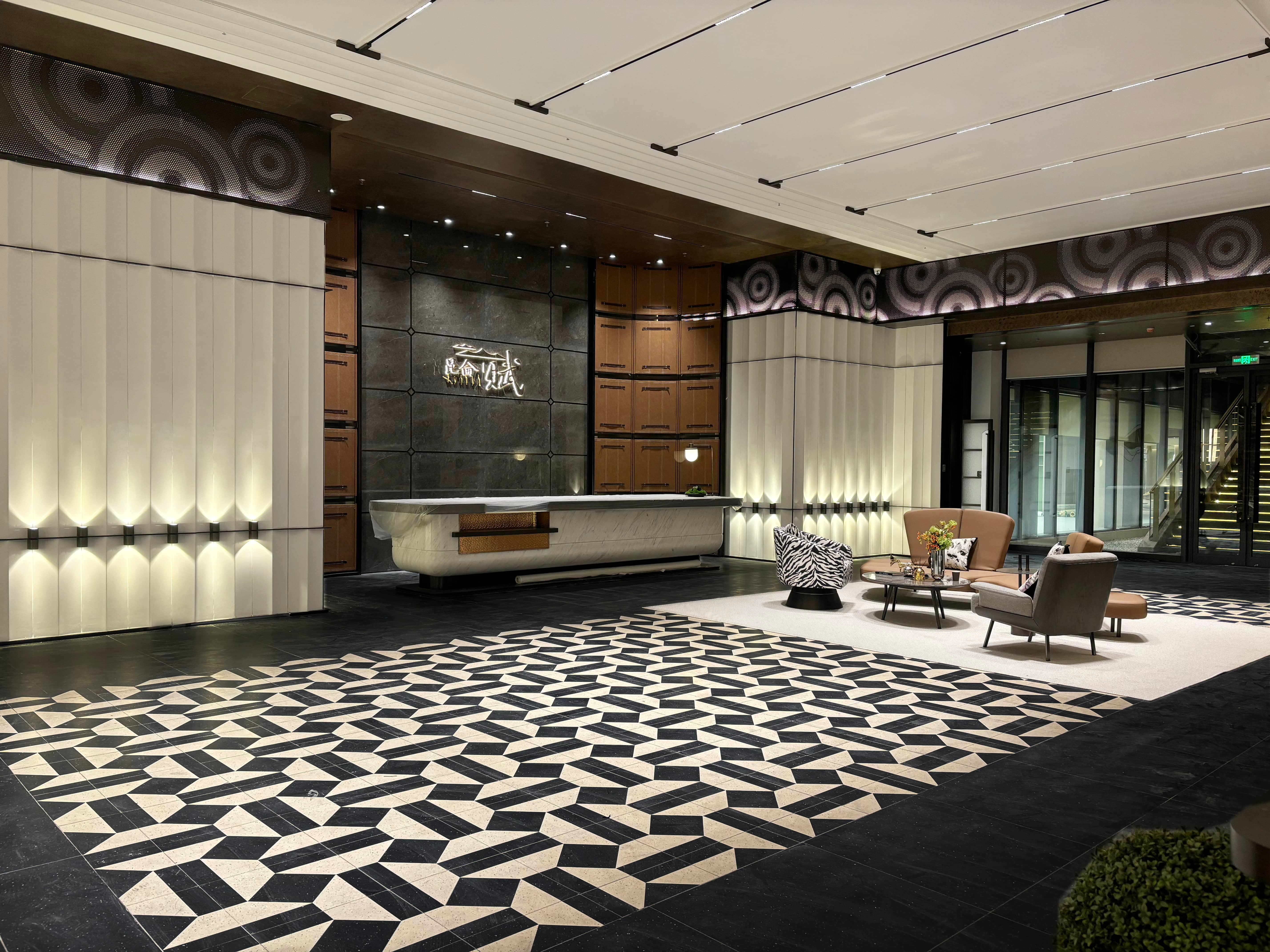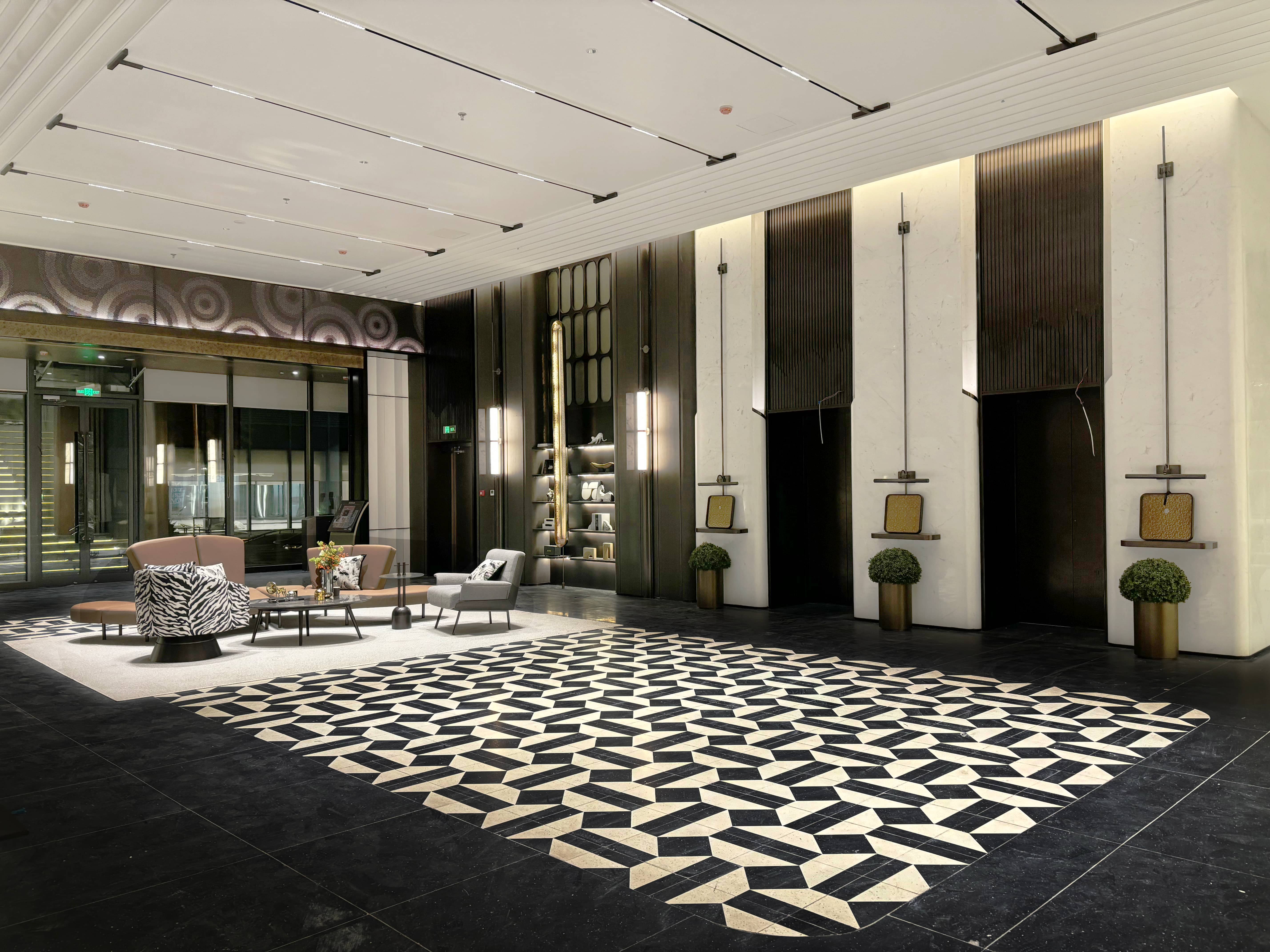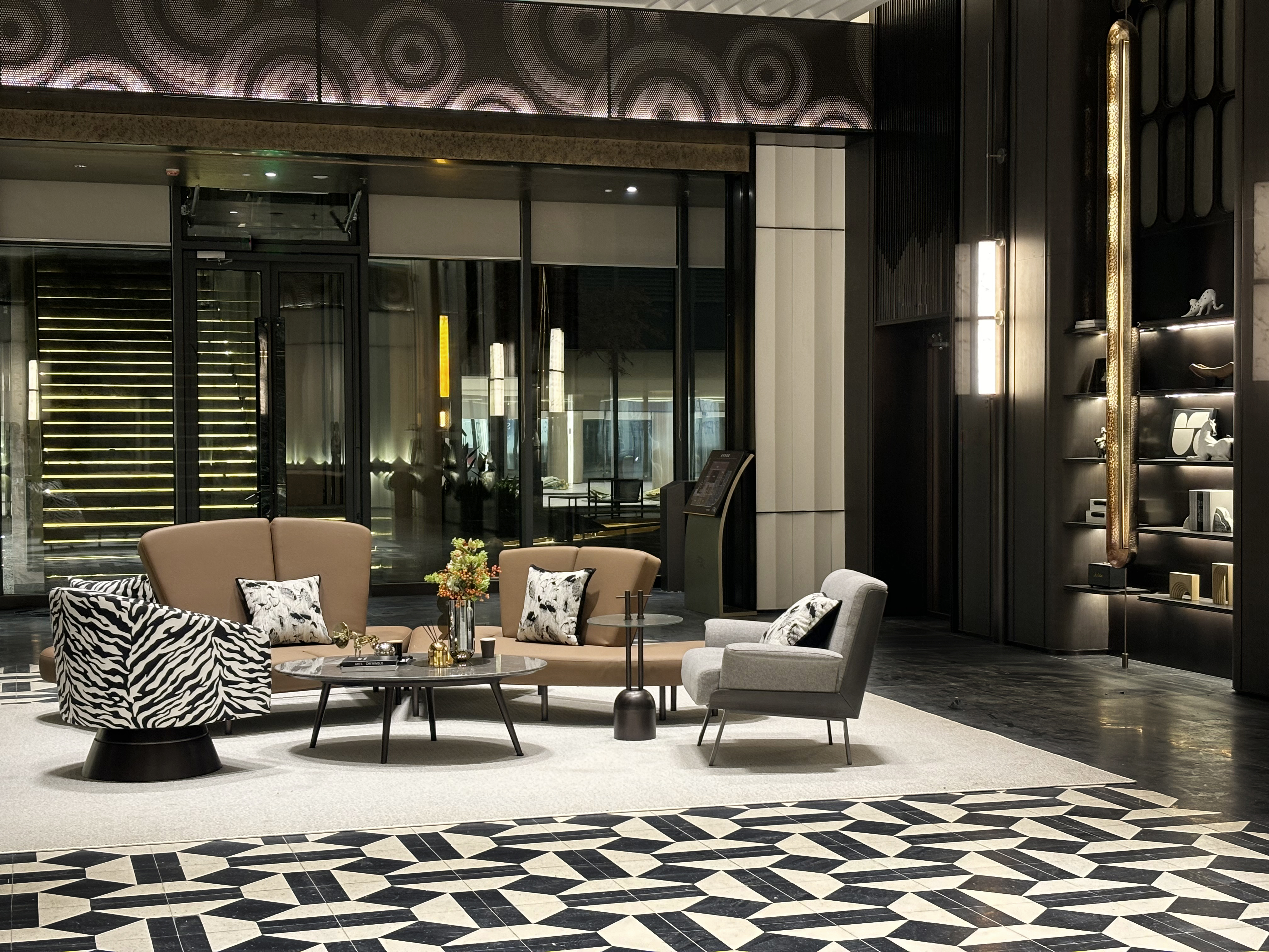 设计选材:会所选材创新以“低碳奢材·经济适配”为核心,在延续暗调奢华质感的同时,实现环保与成本的平衡。核心区域优先选用低碳材质:接待区屏风摒弃纯铜,采用回收铝制框架搭配双层夹丝玻璃,表面镀仿铜涂层,既还原金属奢华感,又降低资源消耗与成本。