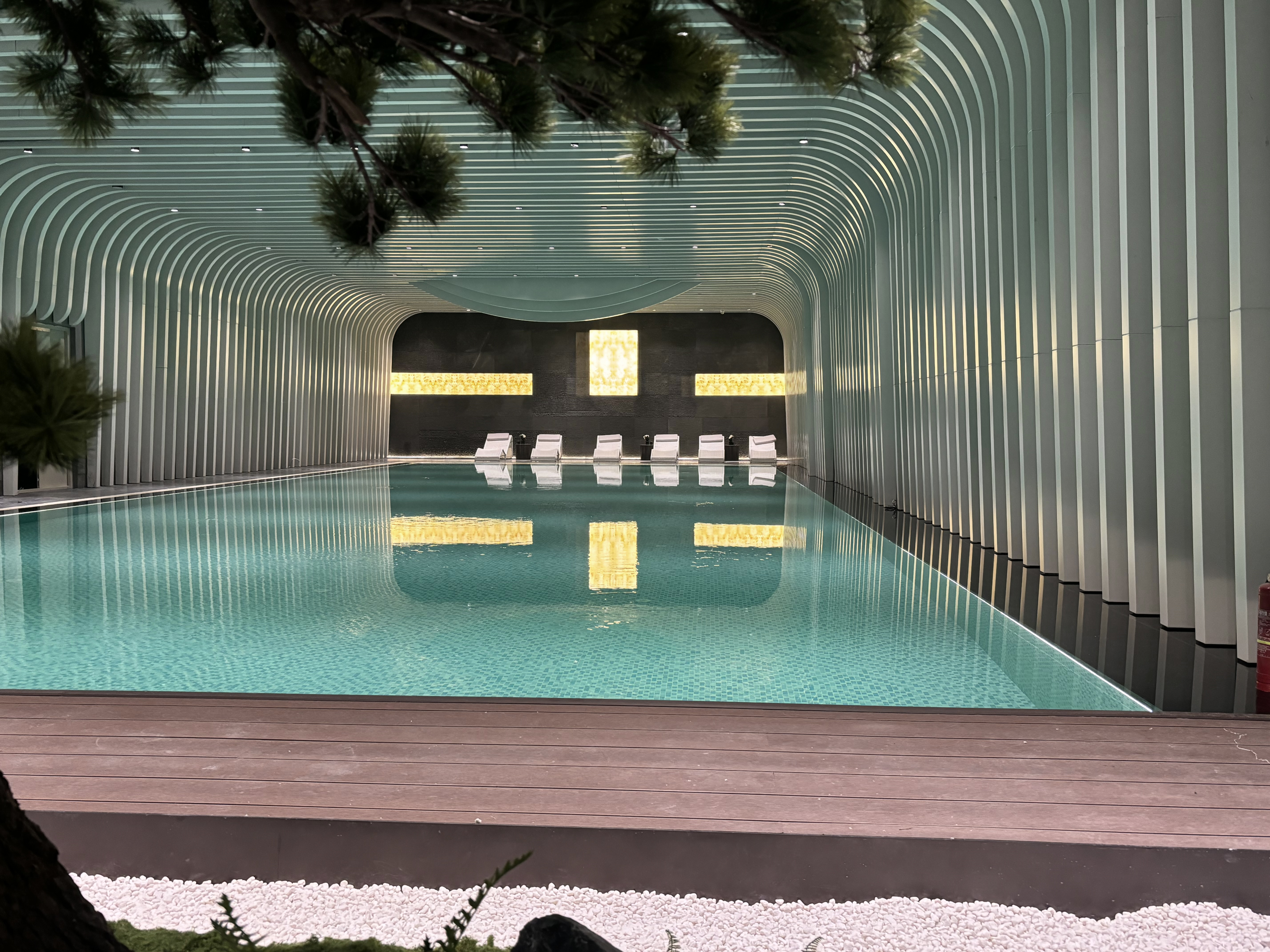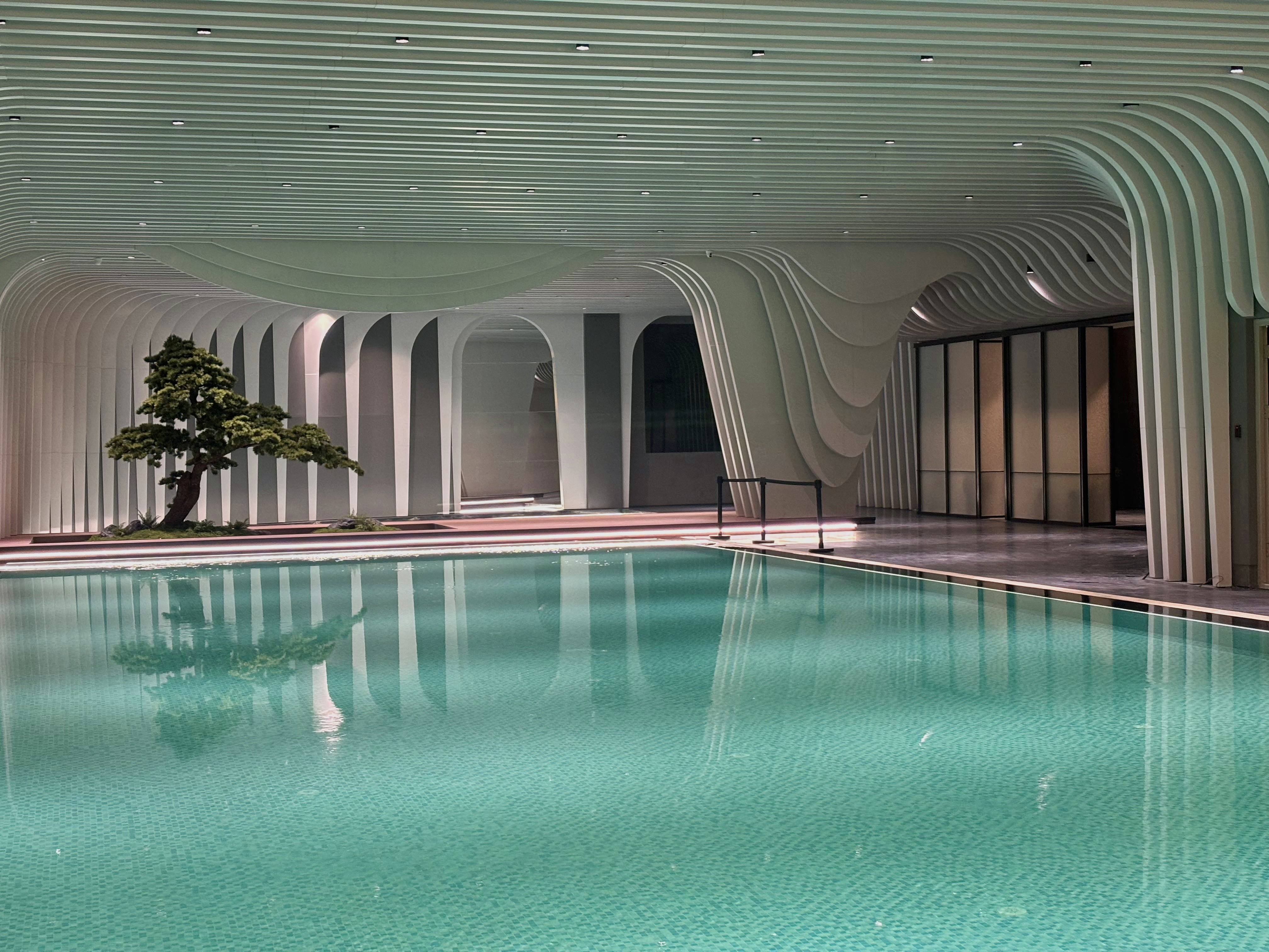 空间布局:空间较大,整体分为三动线,餐厅区、洗浴区、休闲娱乐区等,都可以分别从各自的动线最快到达,相对互通也相对独立,确保同时使用的便捷性以及私密性。
