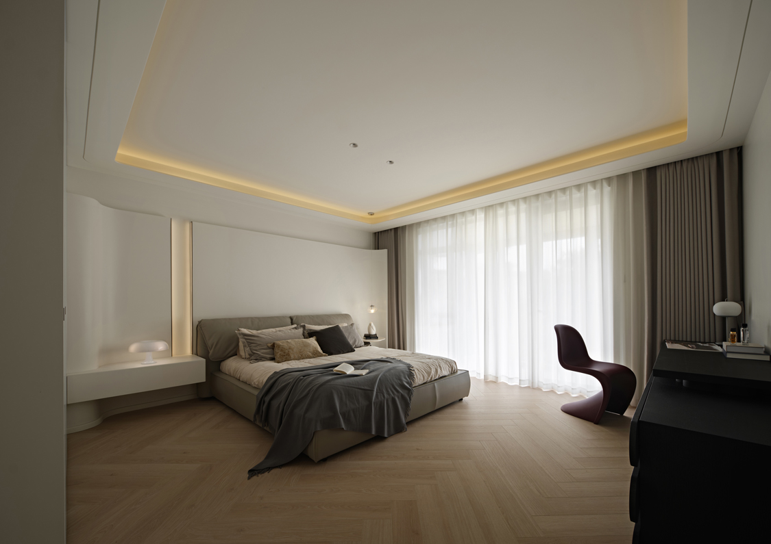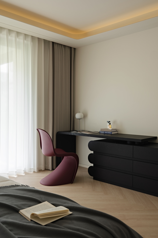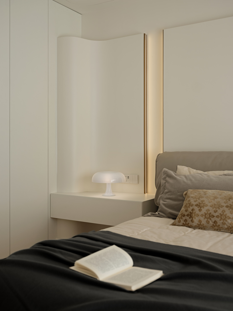 简洁的线条勾勒出主卧的优雅轮廓,低饱和度的素色墙面保持着家的协调,留白的手法搭配丰富细腻的肌理,可生长的空间是设计对未来生活方式最好的展现。