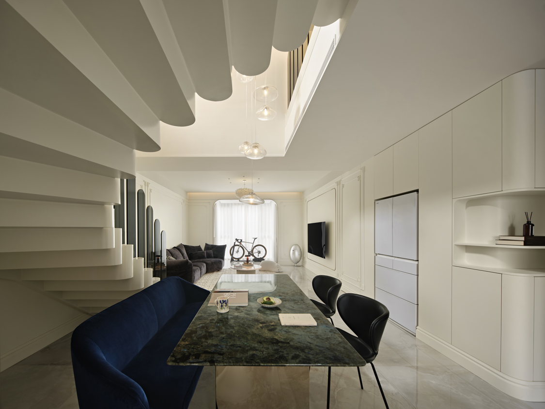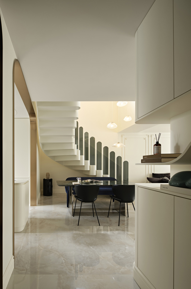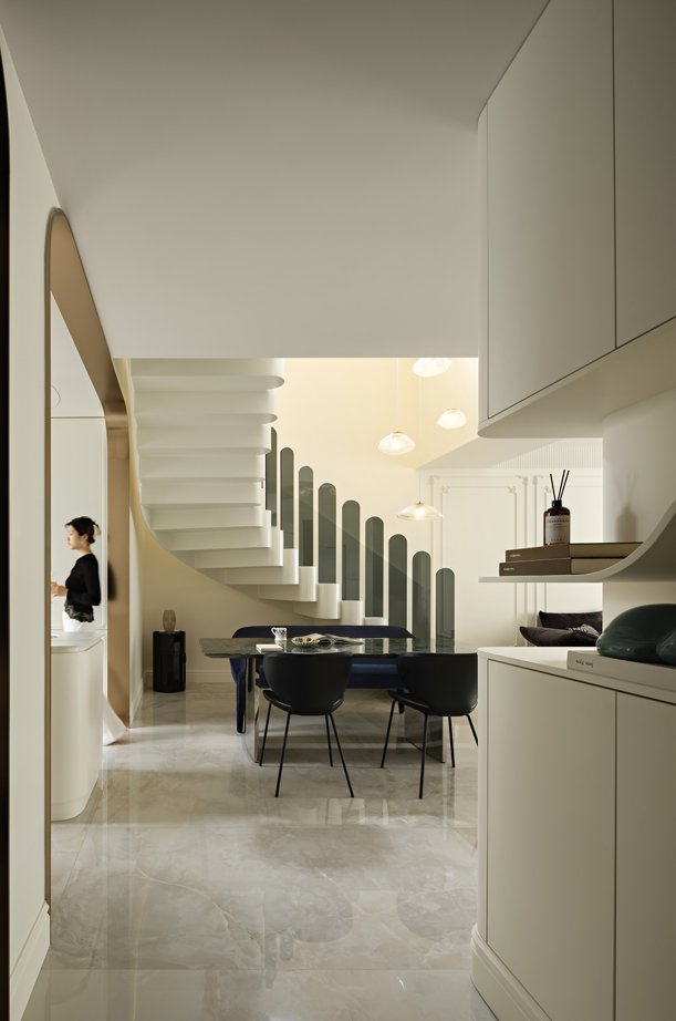 设计选材:设计在材质的选择上均以环保材料为主,在餐厨区域大量使用玻璃加镜面的材质,使得餐厅及围合着餐厅的旋转楼梯在整体视觉上显得开放通透、轻盈美观,同时也让这个现代简约的家中带上了些法式的浪漫韵味。