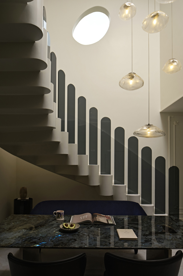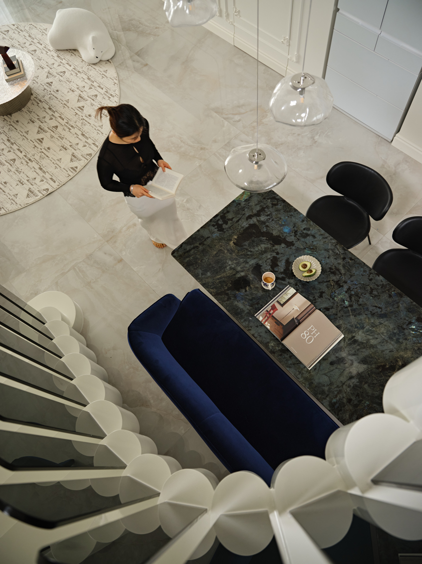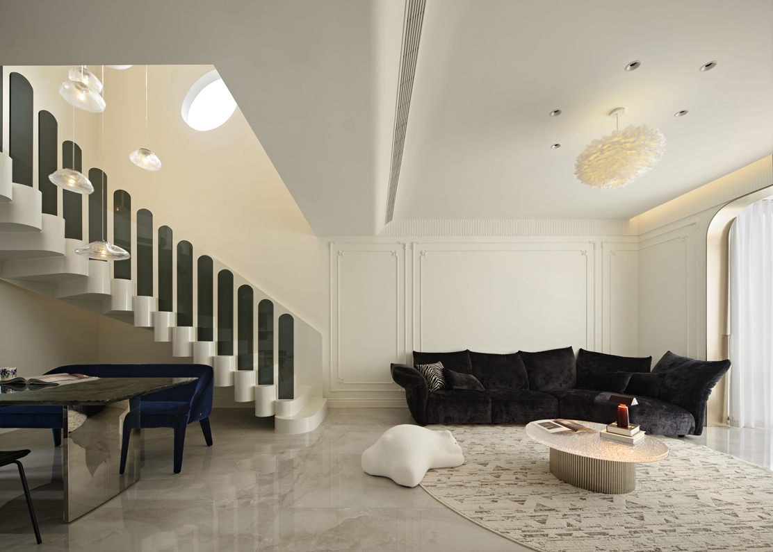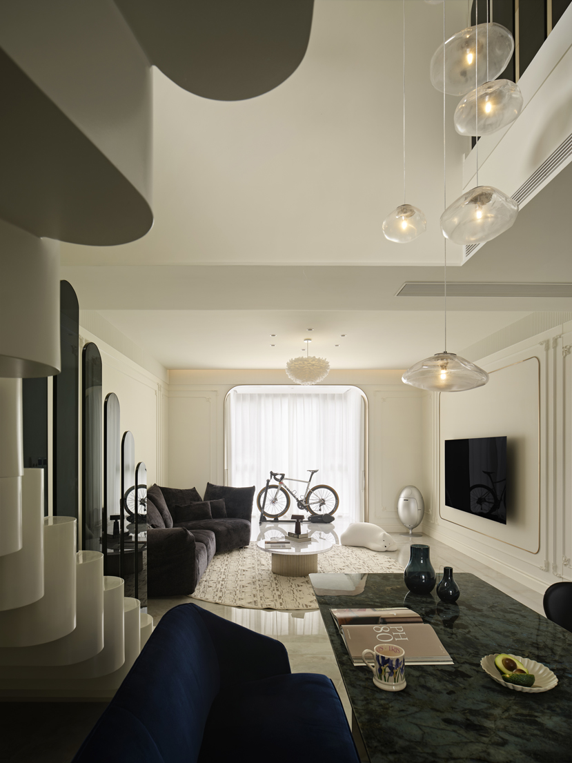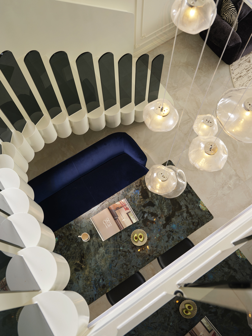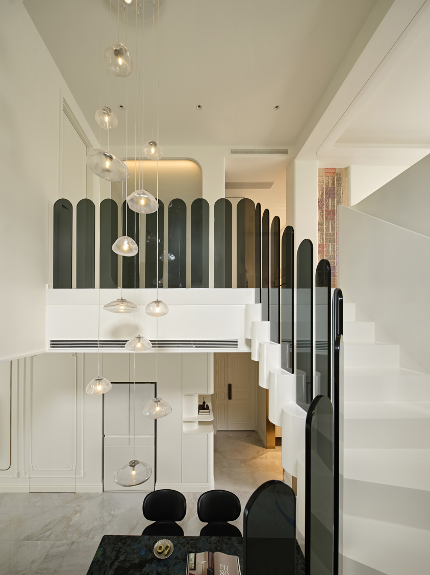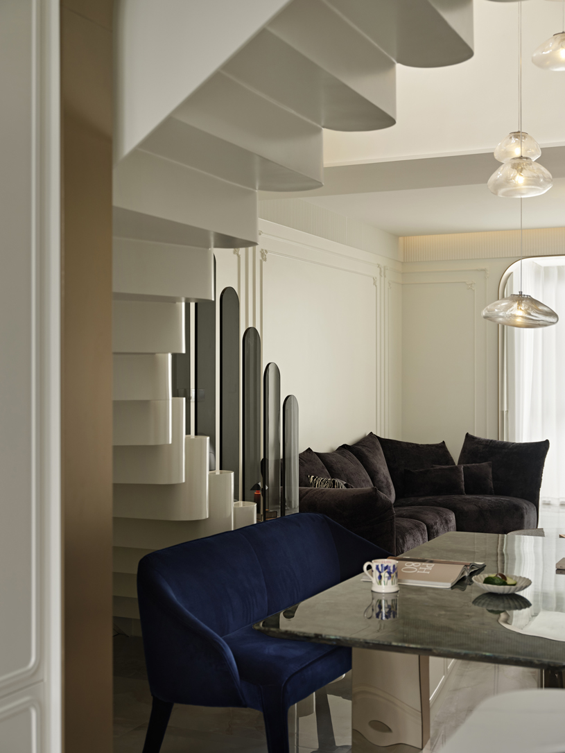 错落有致的吊灯和深色玻璃扶手在同的角度交叠,形成一种富有张力的对话。空间中自有的骄傲姿态,是家具的拟人趣味,是不羁的生活姿态。