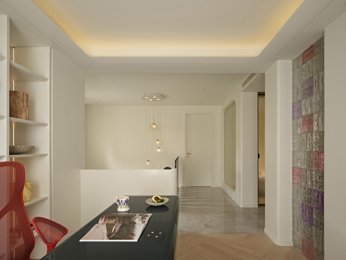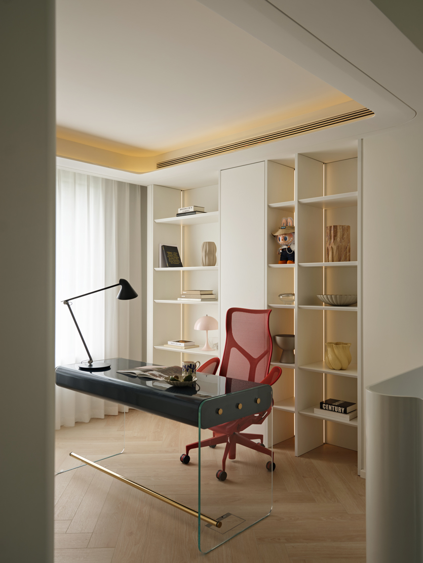延续空间的简洁利落,开放式工作间色调仍以浅色系为主,而充满色彩张力的书桌,让室内更多地达到精神愉悦感和身心合一的无界化升维享受。