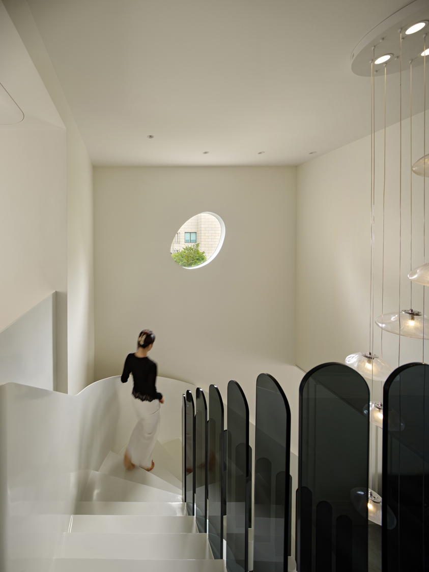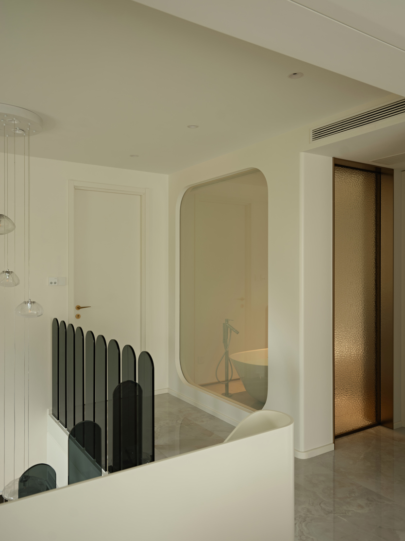 放弃传统楼梯完整面的造型,扶手用间断的灰色玻璃代替,宛如钢琴键蜿蜒而上,伴随着愈加轻快的步伐,聆听空间中关于生活的乐符。