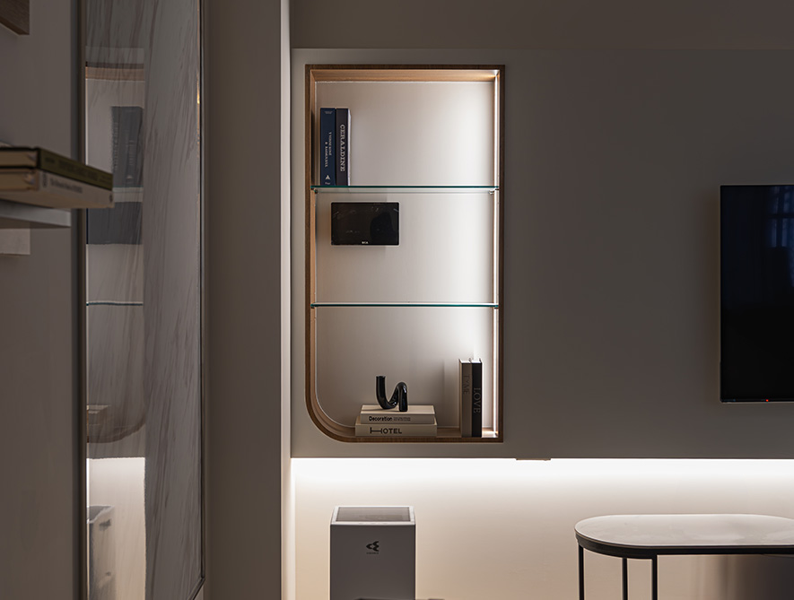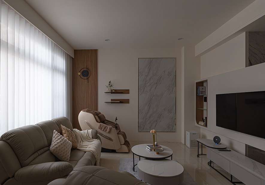 大面积的象牙白与浅驼色在此舒柔交汇,圆润饱满L型沙发如云朵轻盈佔据视觉焦点,编织抱枕、毛绒织品层迭其上,为纯淨基调注入温暖触感;前方浅色圆形造型茶几、弧形电视柜,结合黑色铁件框架,在悬空皓白的电视牆下带出视觉重心,达成色彩的和谐,酝酿一室柔软安定;一旁,大面石纹磁吸板的细腻灰白纹理,宛如行云流水一般悠然延展,将典雅气韵凝结于牆面,同旁侧木质悬浮层板、立面构成异材质的优雅对话,在造型壁灯的光泽映照下,谱写当代简约与生活温度兼容的温馨居家时光。