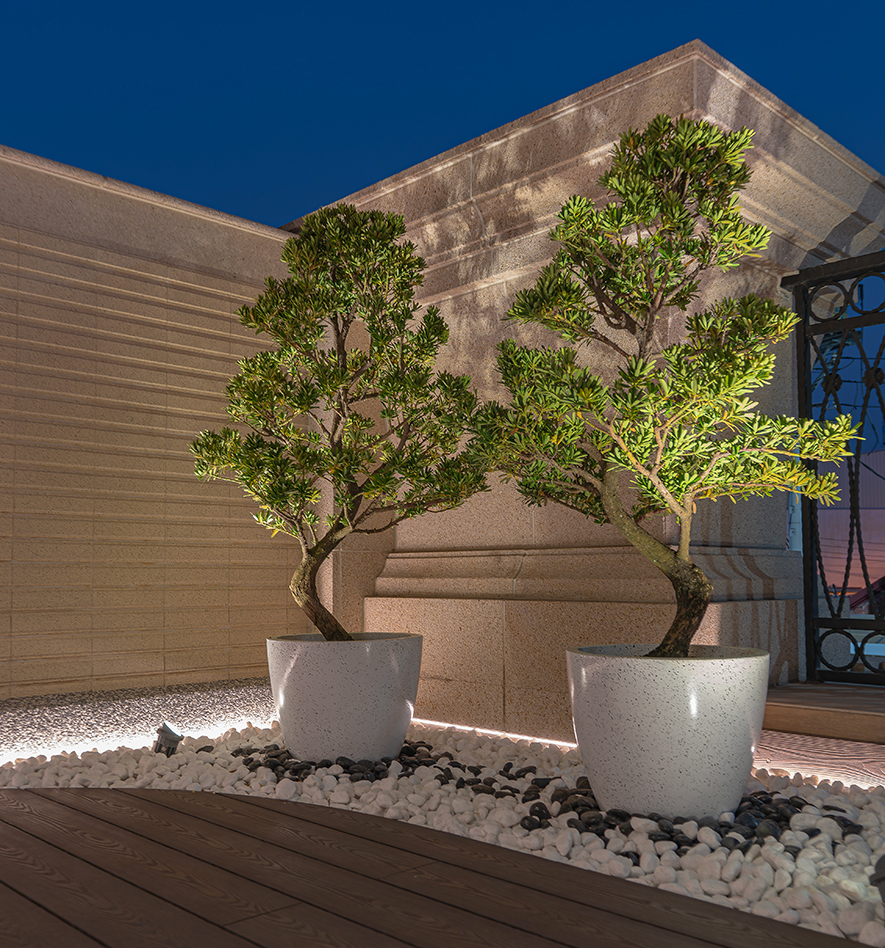 夜幕低垂,二楼露台在深蓝夜空的映衬下,展现另一番禅意景致,设计团队与屋主携手,以木质地板铺陈和煦基底,黑白双色卵石交错铺设,配合周围嵌入的间接照明,其光晕温柔勾勒石材、木纹的细腻质地。卵石之上,两颗绿植挺立于洁白陶盆,苍劲枝干与翠绿针叶在夜色中依然盎然生机,透过精心配置的地灯投射,将植栽的优雅身姿映射于牆面,构成一幅流动的光影画作,在有限中创造无限的閒适气氛,成为一家人在忙碌中得以放鬆身心、亲近自然的秘密花园。