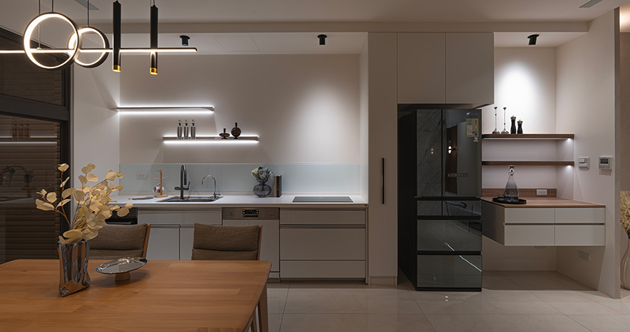 洗练白色系统柜沿牆面一字排开,之中黑色镜面冰箱错落其间,实现恰到好处的色彩对比;牆面上长条灯带为层板投射出柔和光晕,让餐具器皿也成为日常风景。中央实木餐桌以温润质感注入自然气息,围塑一家四口共享美好的核心时光;上方悬挂的环形吊灯,以流畅线条划破空间留白,黑色框架与金色点缀的层次,更为用餐时刻增添一份仪式感。清透白色系与温和中性原木色,在餐厨区中交织清爽明淨的空间表情,而开放格局让烹饪不再是孤单作业,更是串连起家人情感交流的暖心起点。