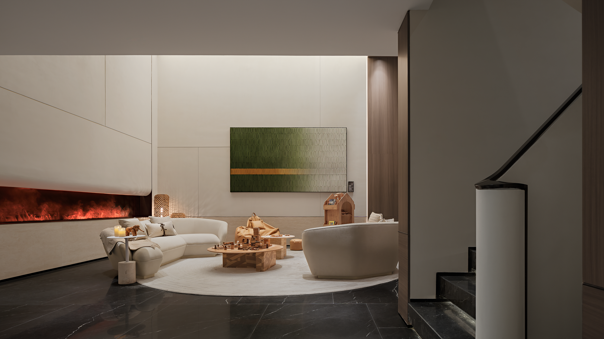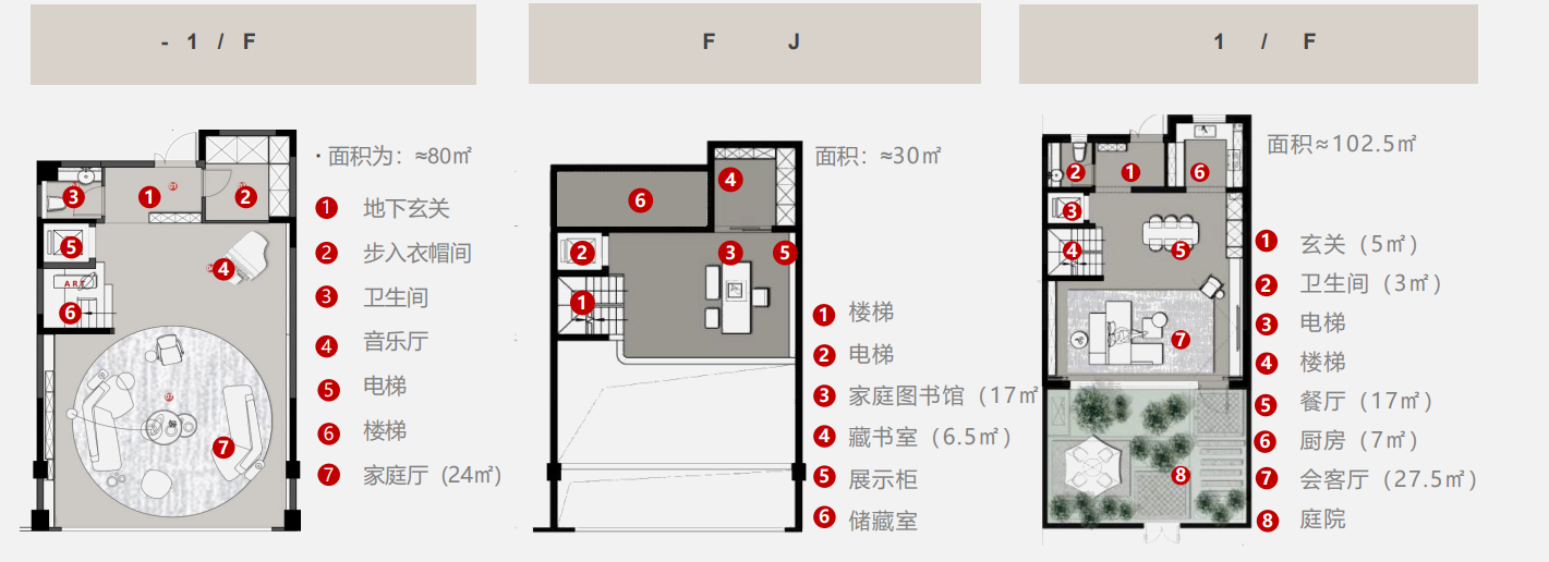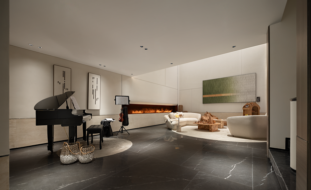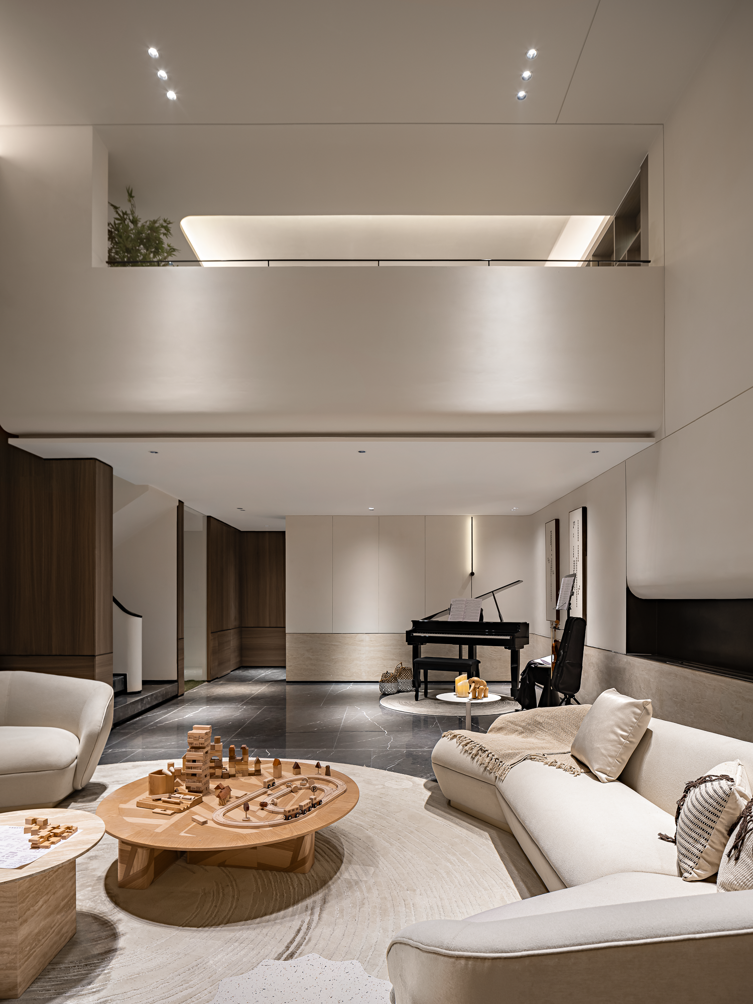 空间布局:一层是开放式客餐厅及厨房,二层是儿童房及老人房,三层是主卧室空间,地下夹层是品茗书房,地下一层是亲子活动家庭空间