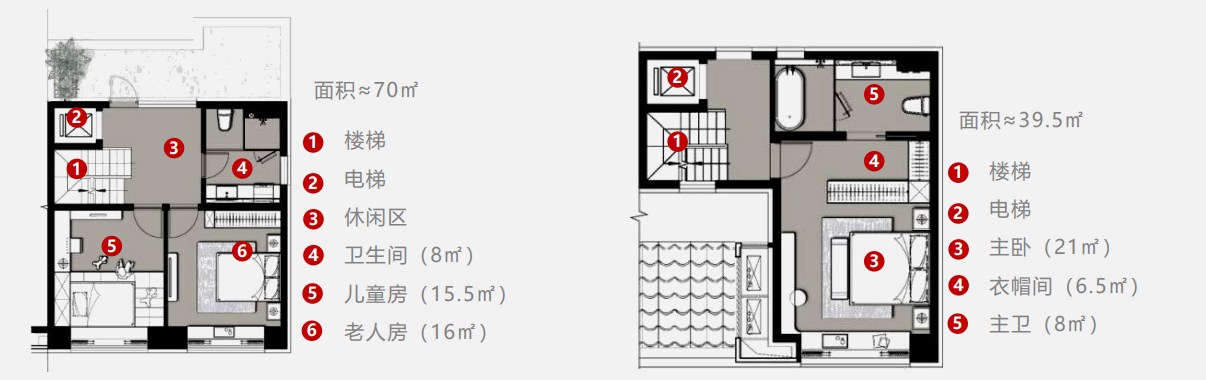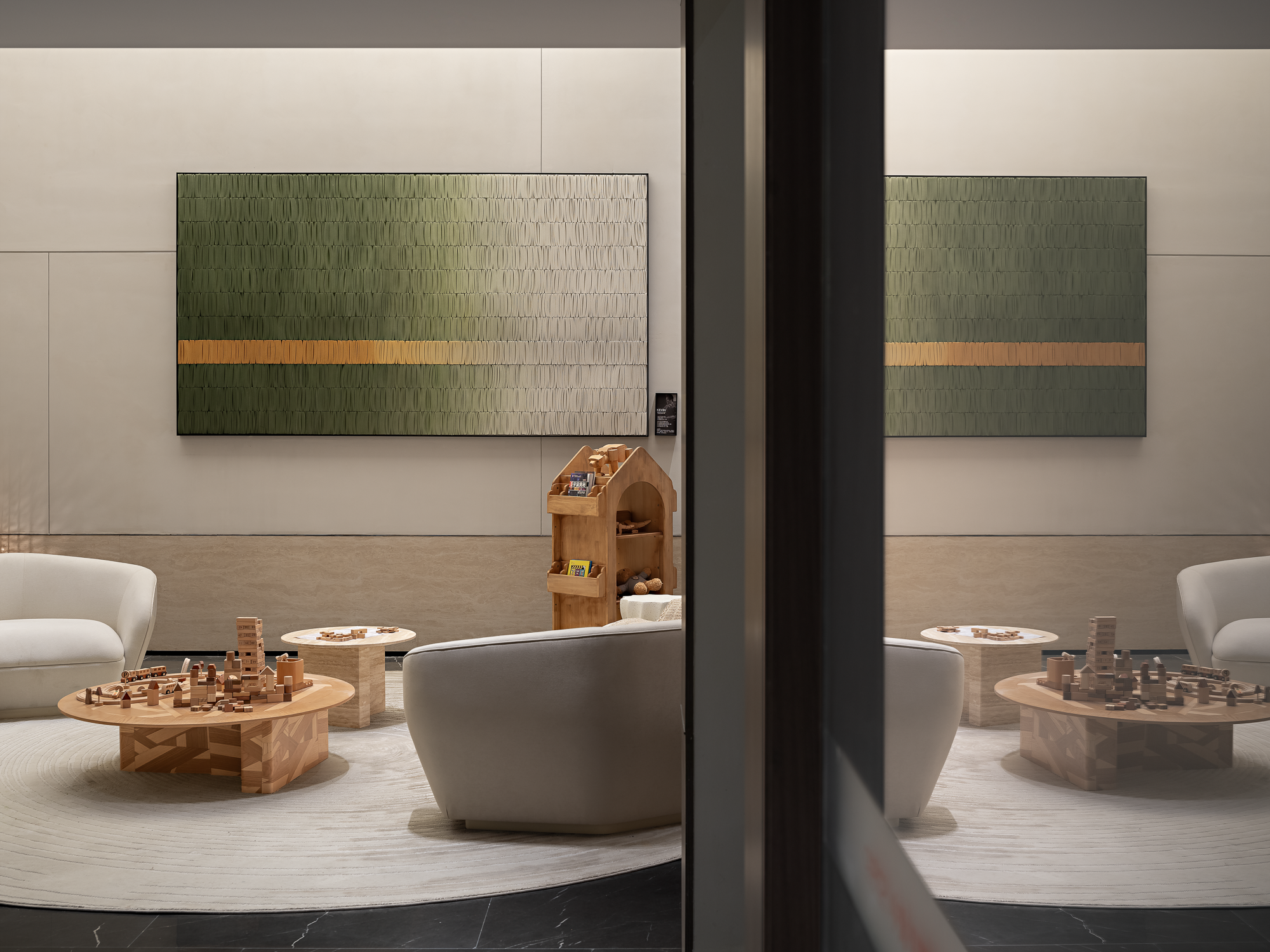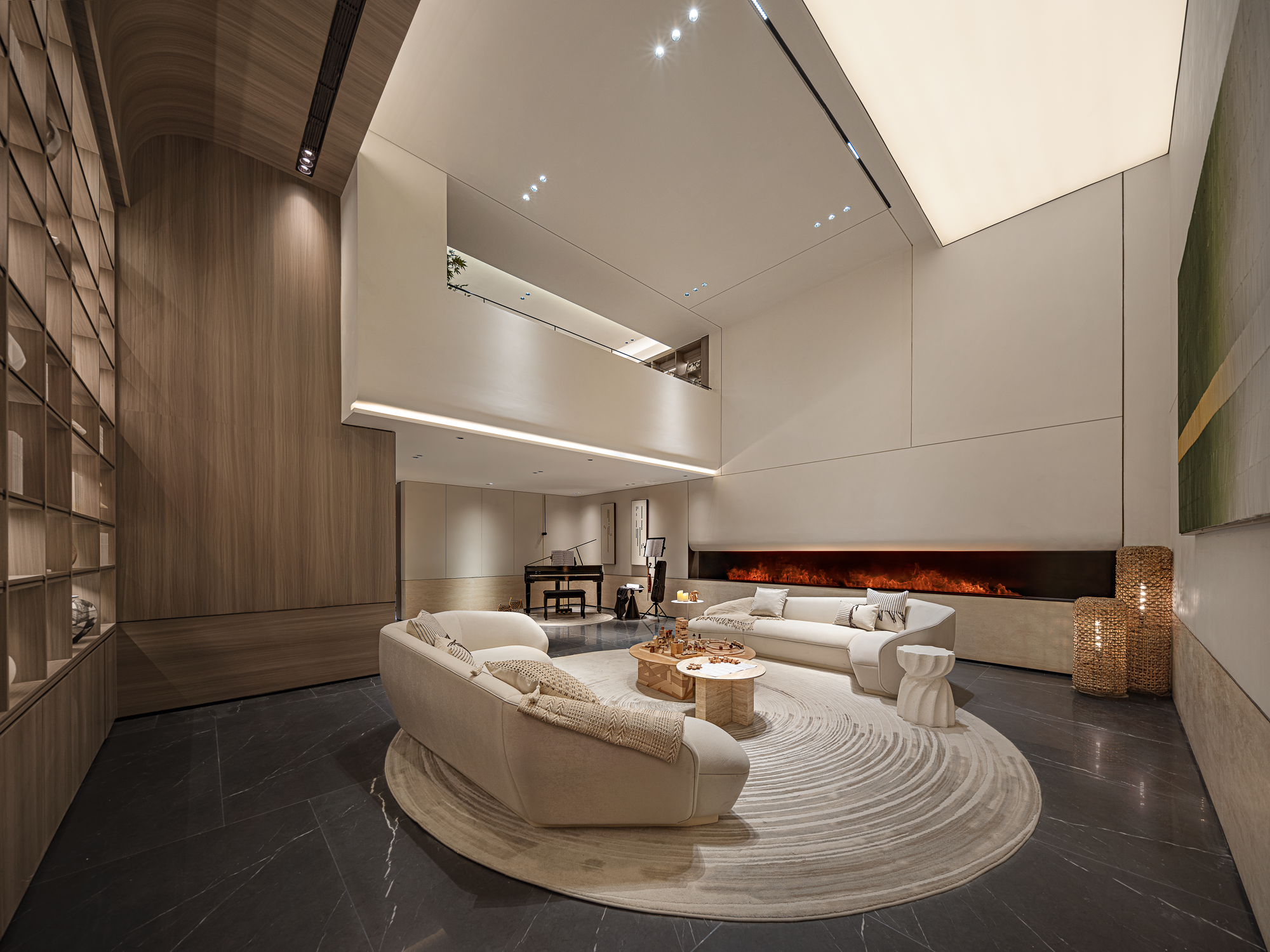 空间布局:一层是开放式客餐厅及厨房,二层是儿童房及老人房,三层是主卧室空间,地下夹层是品茗书房,地下一层是亲子活动家庭空间