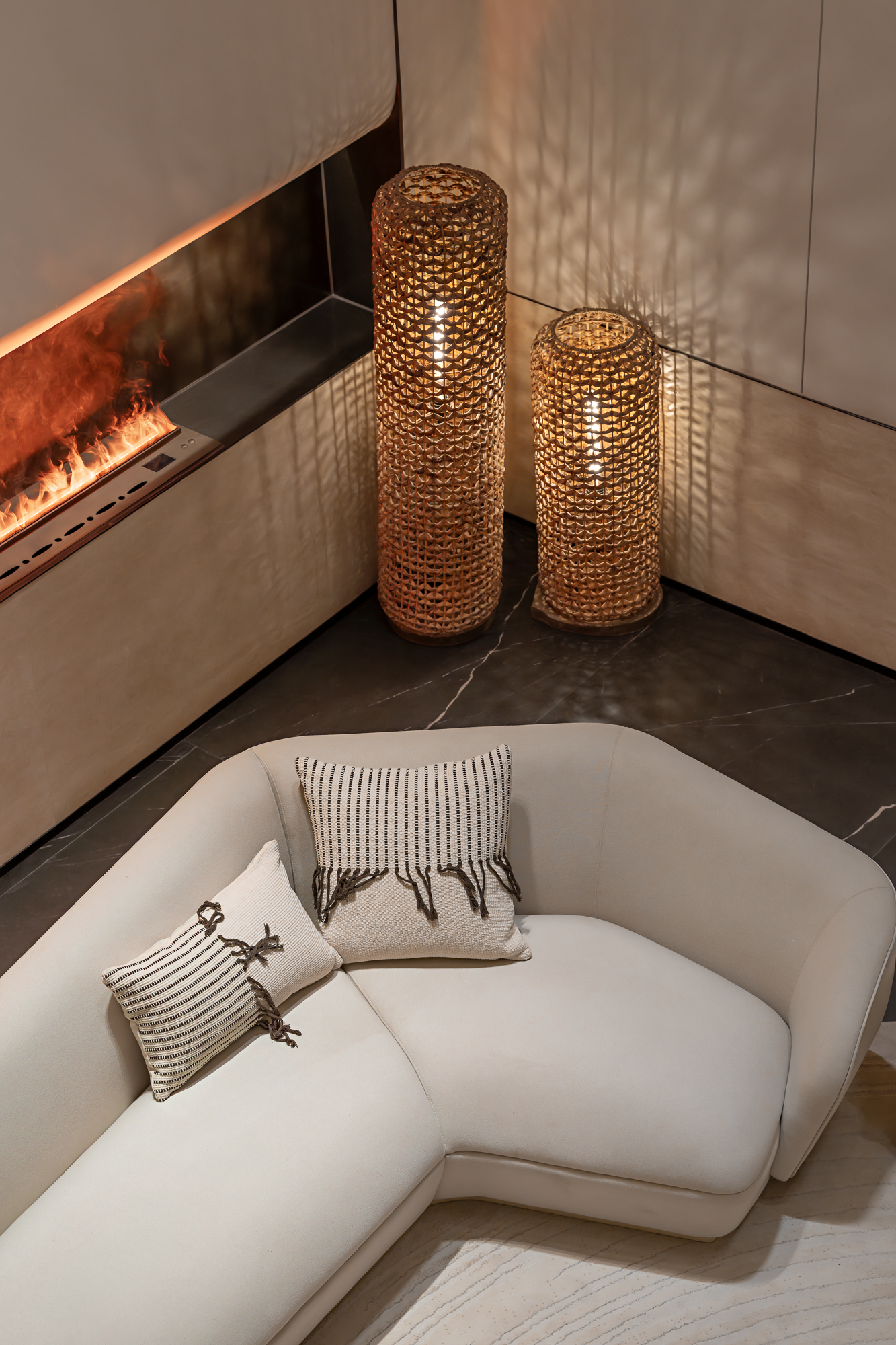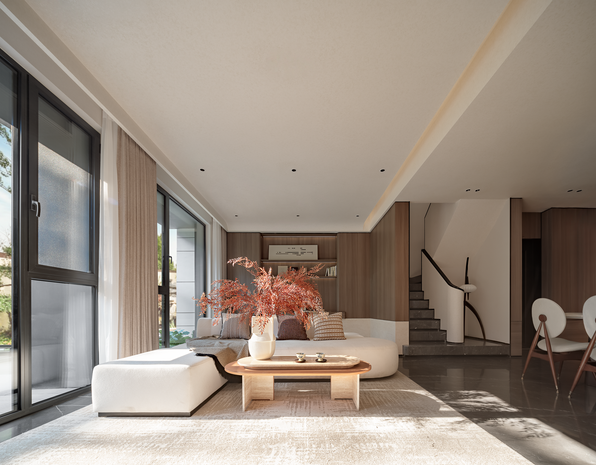 设计选材:坚持一贯简约理念, 把现代极简、古代奢华、等设计元素融为一体的生活美学!原木、东石、布艺之间的搭配体现侘寂风格
