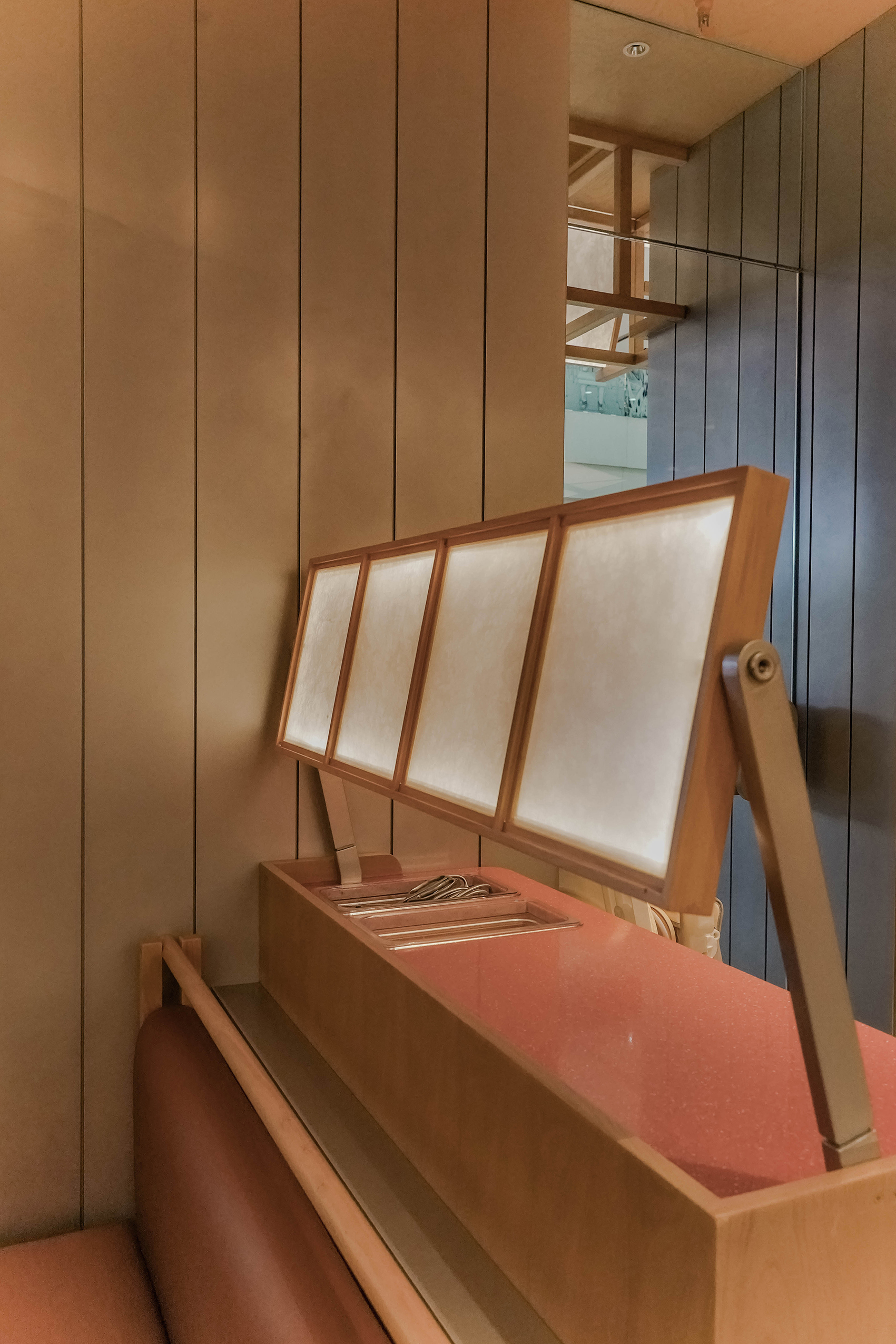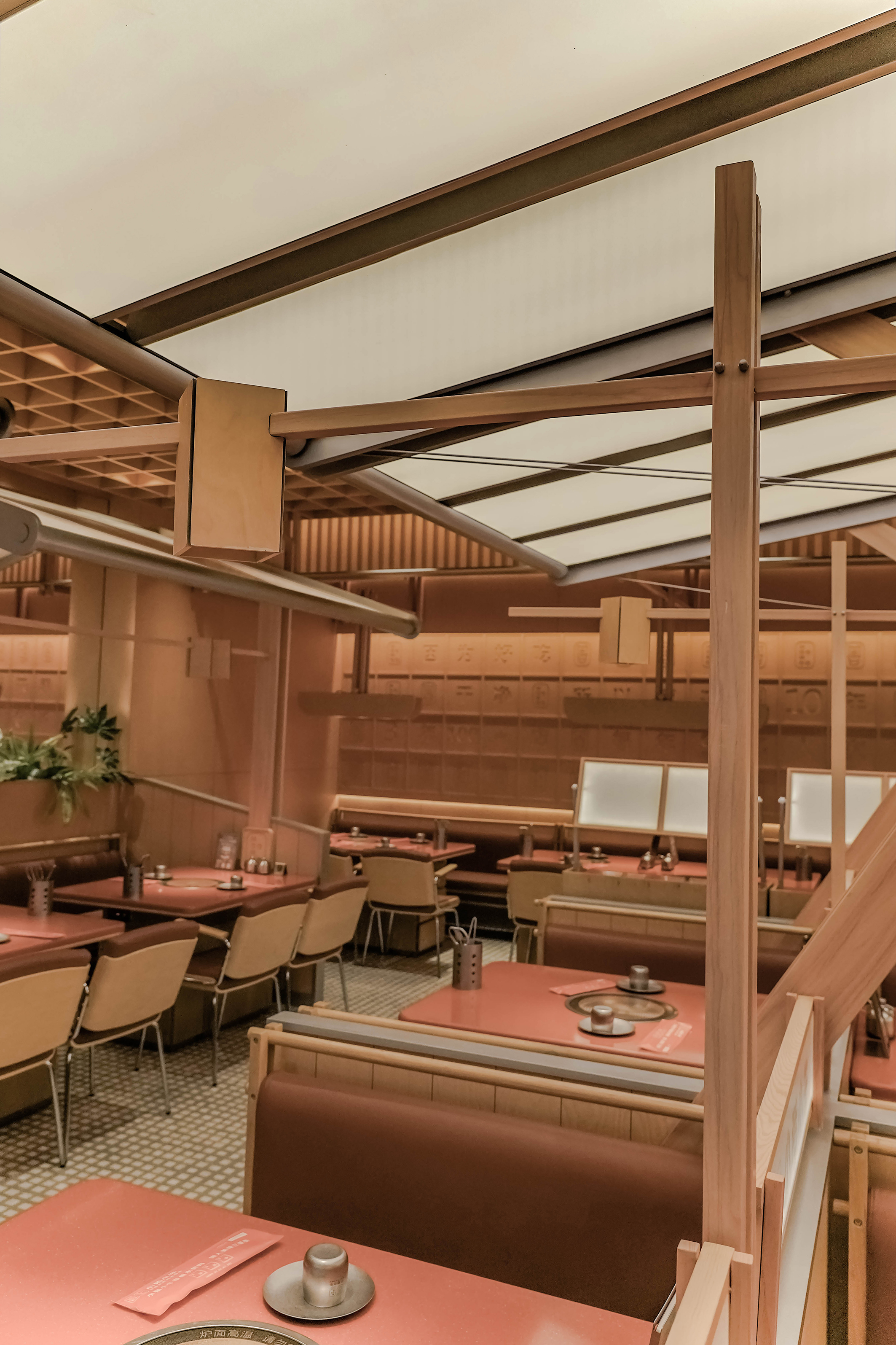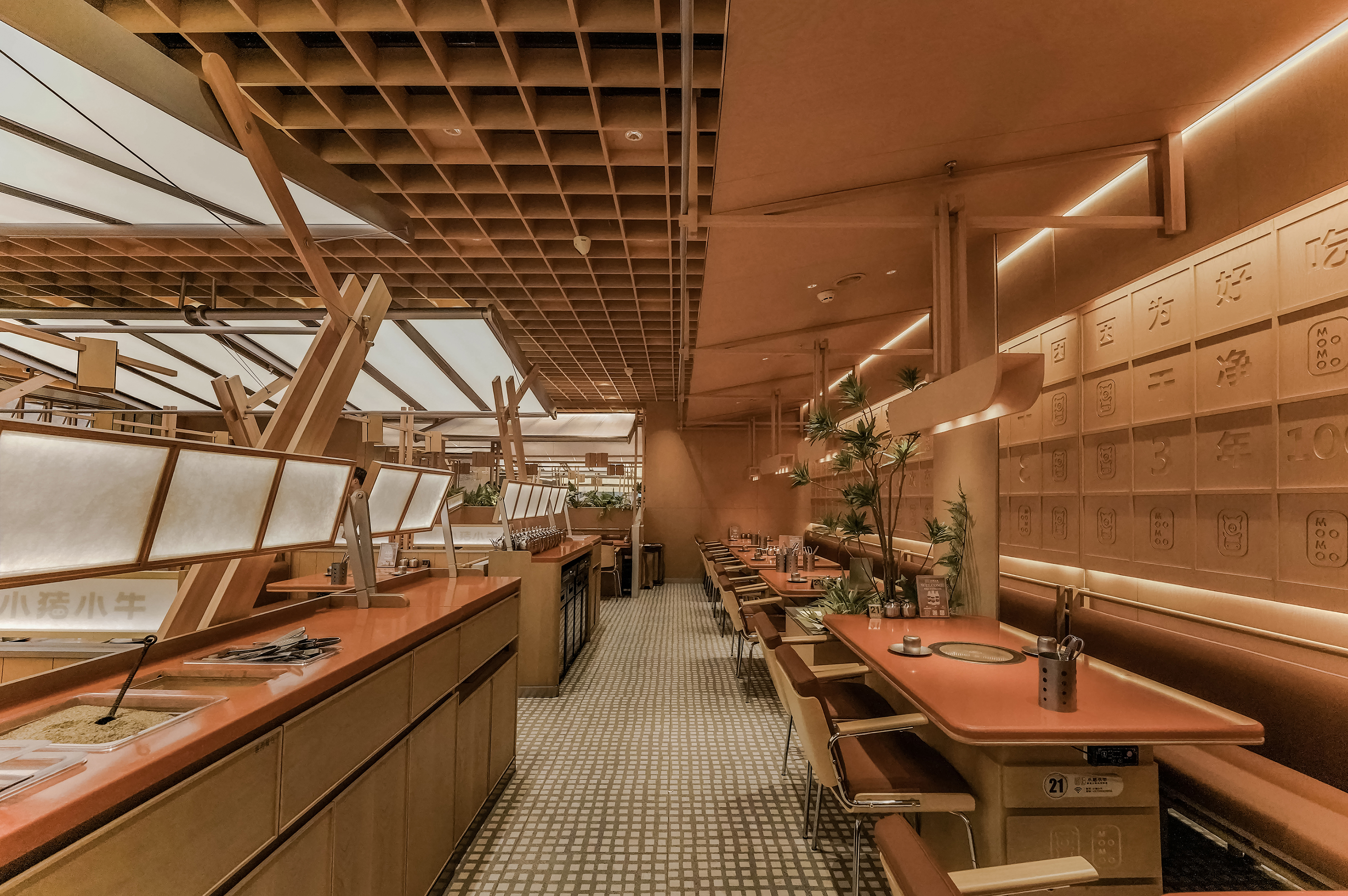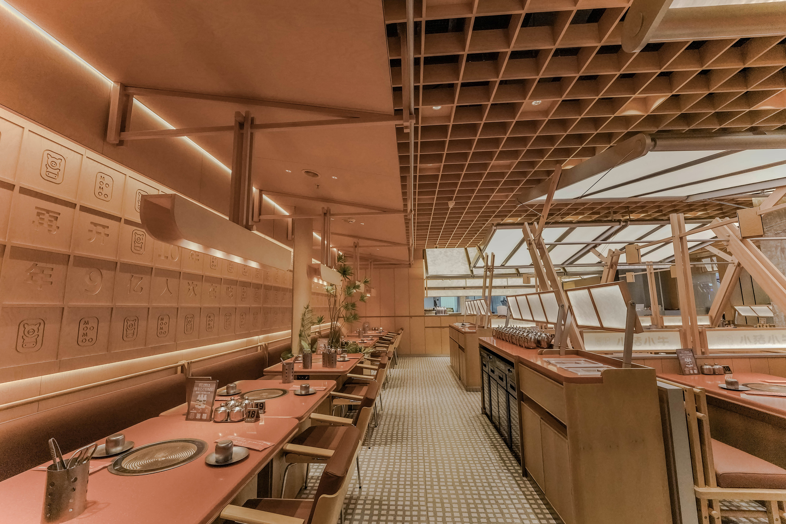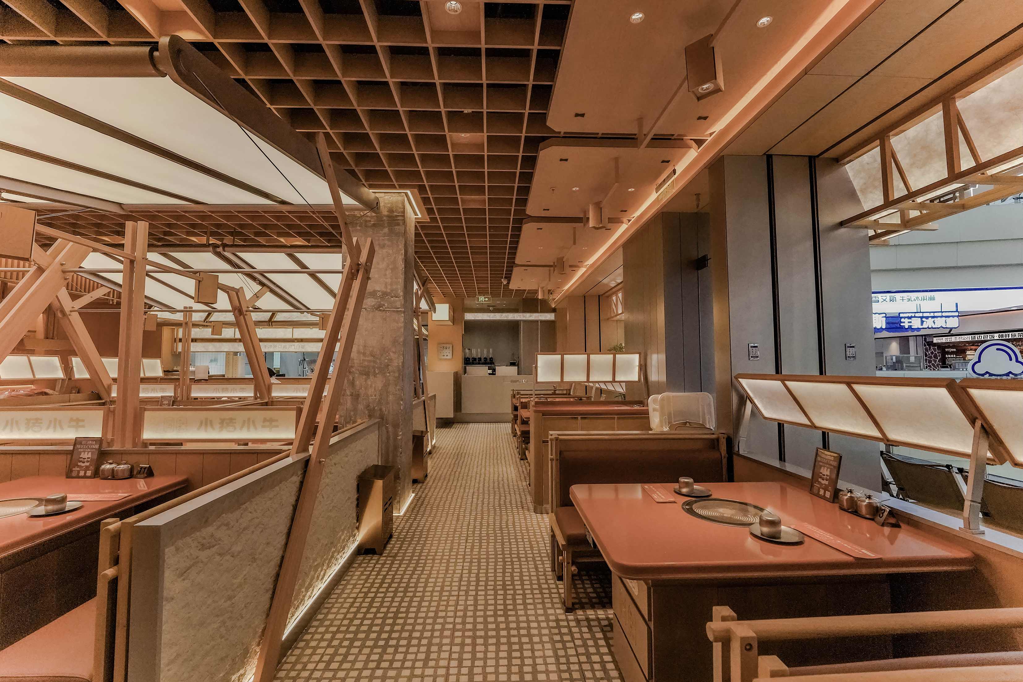 空间布局:天花采用木质格栅与模块化结构装置,通过几何秩序和暴露的交叉支架展现结构逻辑。搭配嵌入式灯光,强化层次与设计感,形成从地面到顶部的完整视觉体系