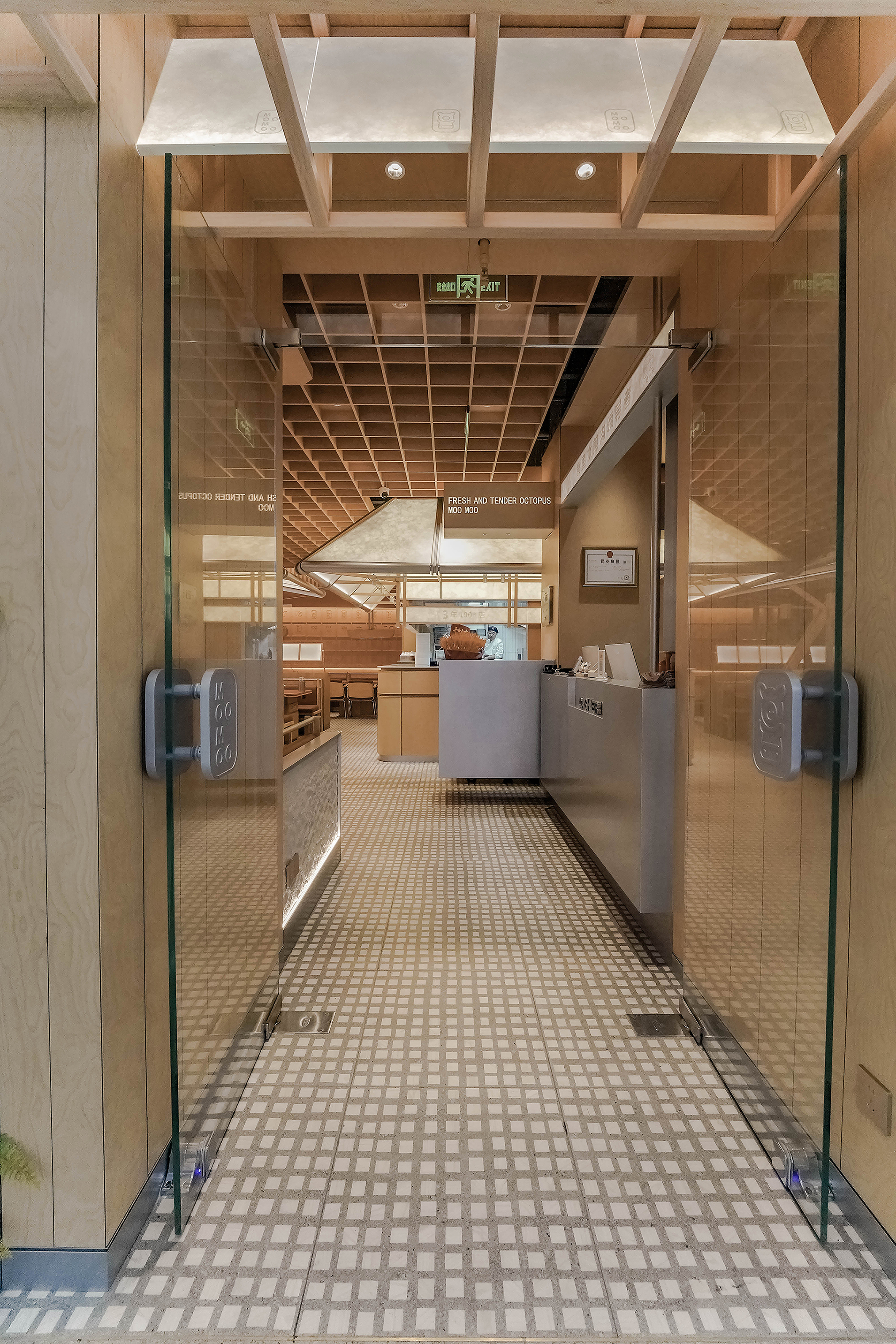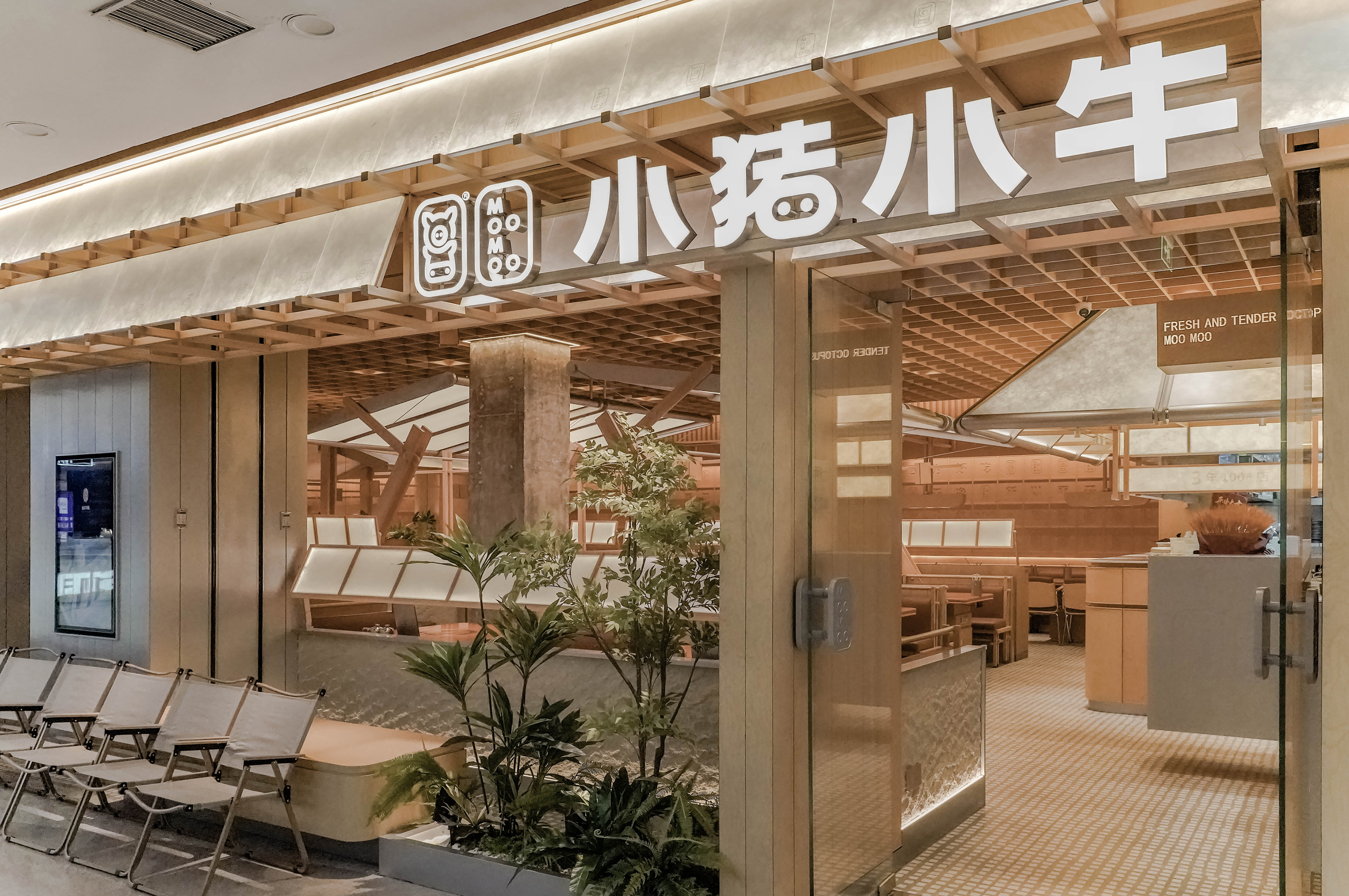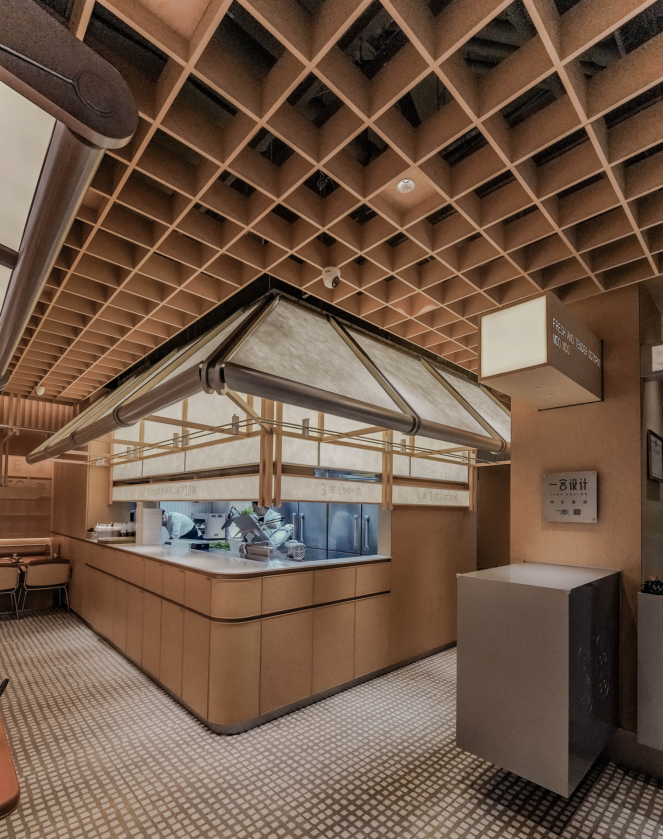 空间意境:采用模块化木质框架与半透肌理瓦片结构,将传统瓦片元素进行现代解构。模块化排列强化品牌识别,木质骨架支撑整体形态,品牌标识清晰呈现。轻盈的半透材质打破传统门头的厚重感,传递“传统元素现代演绎”的创新理念