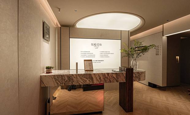 设计选材:墙面以原木板材拼接为主,嵌入品牌发展历程的文字模块结合品牌故事与解构主义的“重组”理念。肌理石材与原木形成质感对比,增强视觉层次与空间温馨感,让顾客直观感受品牌底蕴