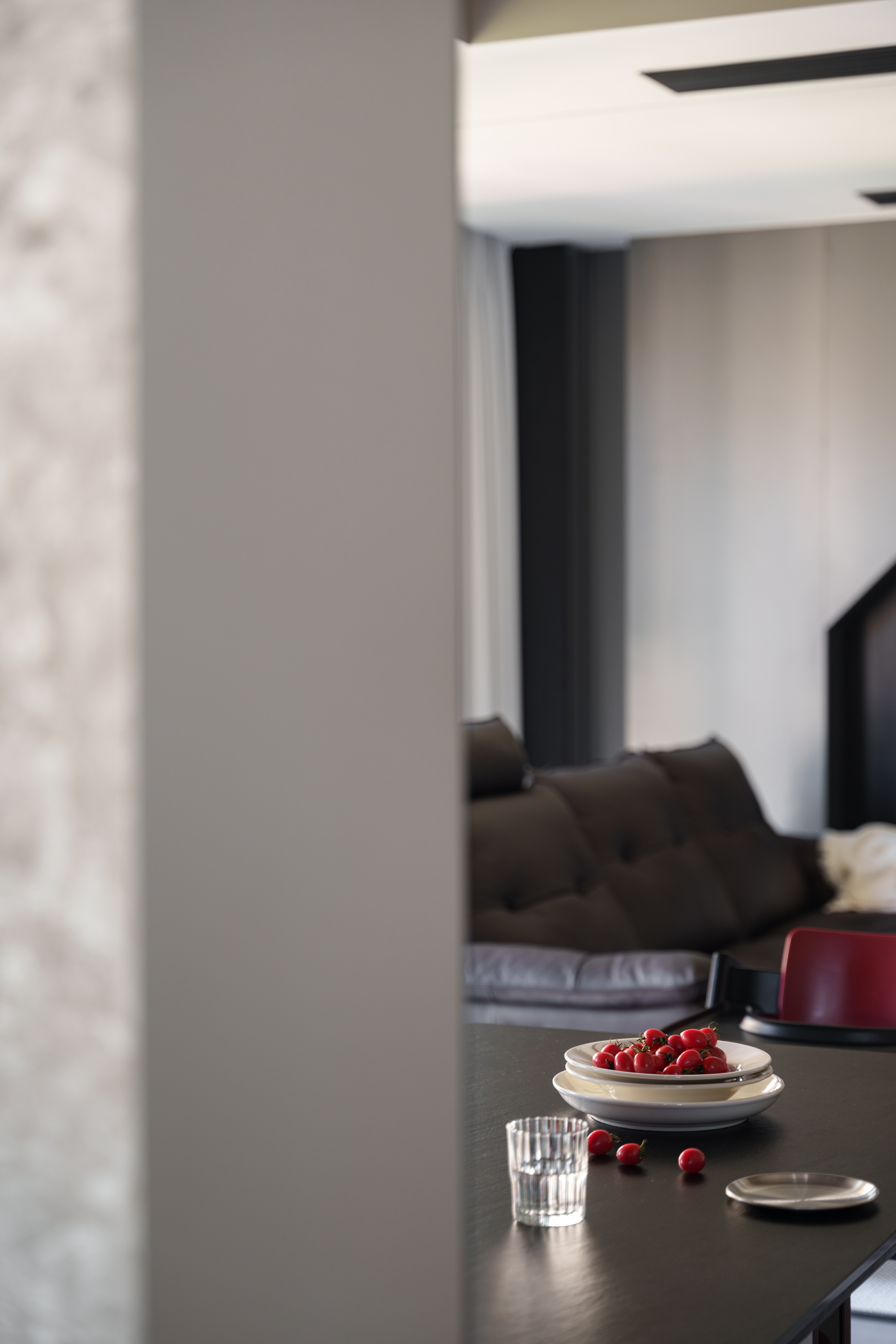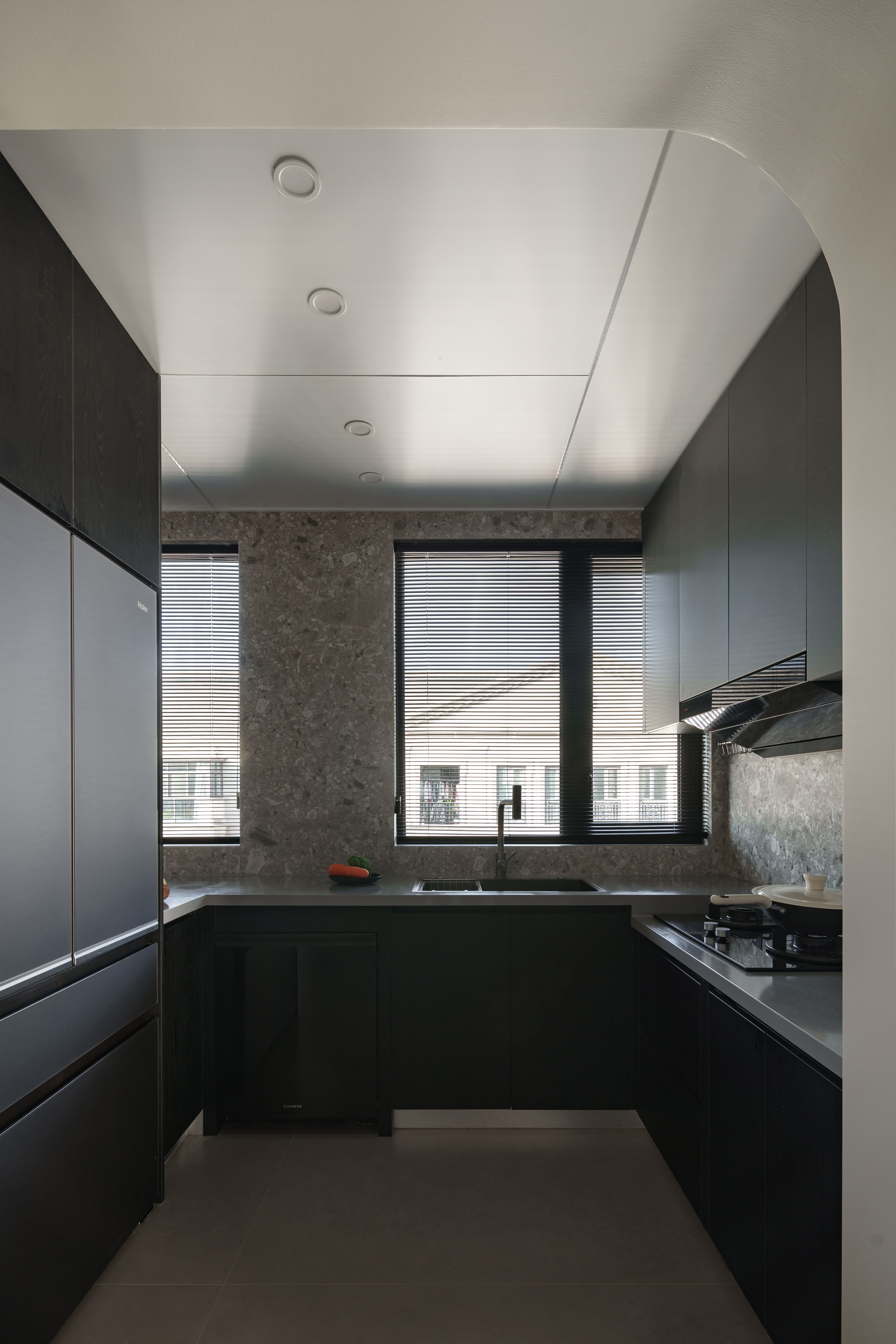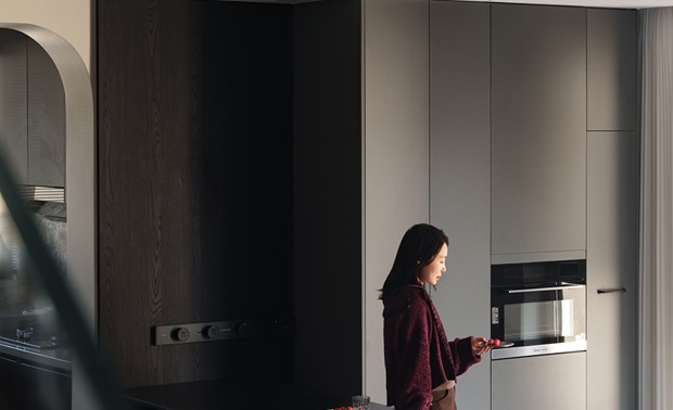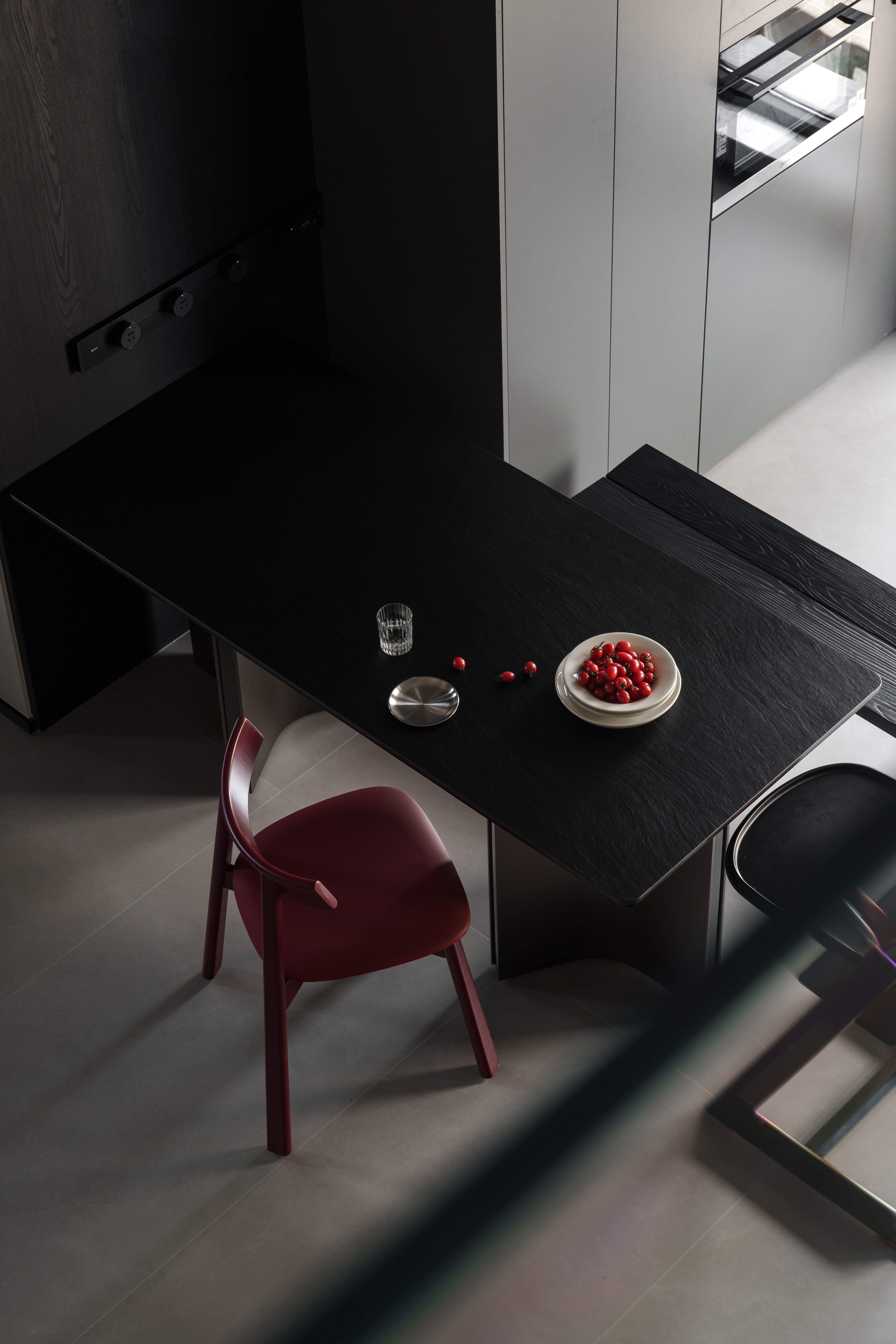 黑岩板的冷面上,圣女果坠成簇热烈的红 勃艮第椅的弧度,刚好接住漫进来的软光 厨房石纹墙滤过百叶的碎影 洞洞板的玩具摆件,是冷调里跳脱的孩子气 硬材质裹着软温度,暗空间盛着活烟火 这是空间与生活最松弛的咬合
