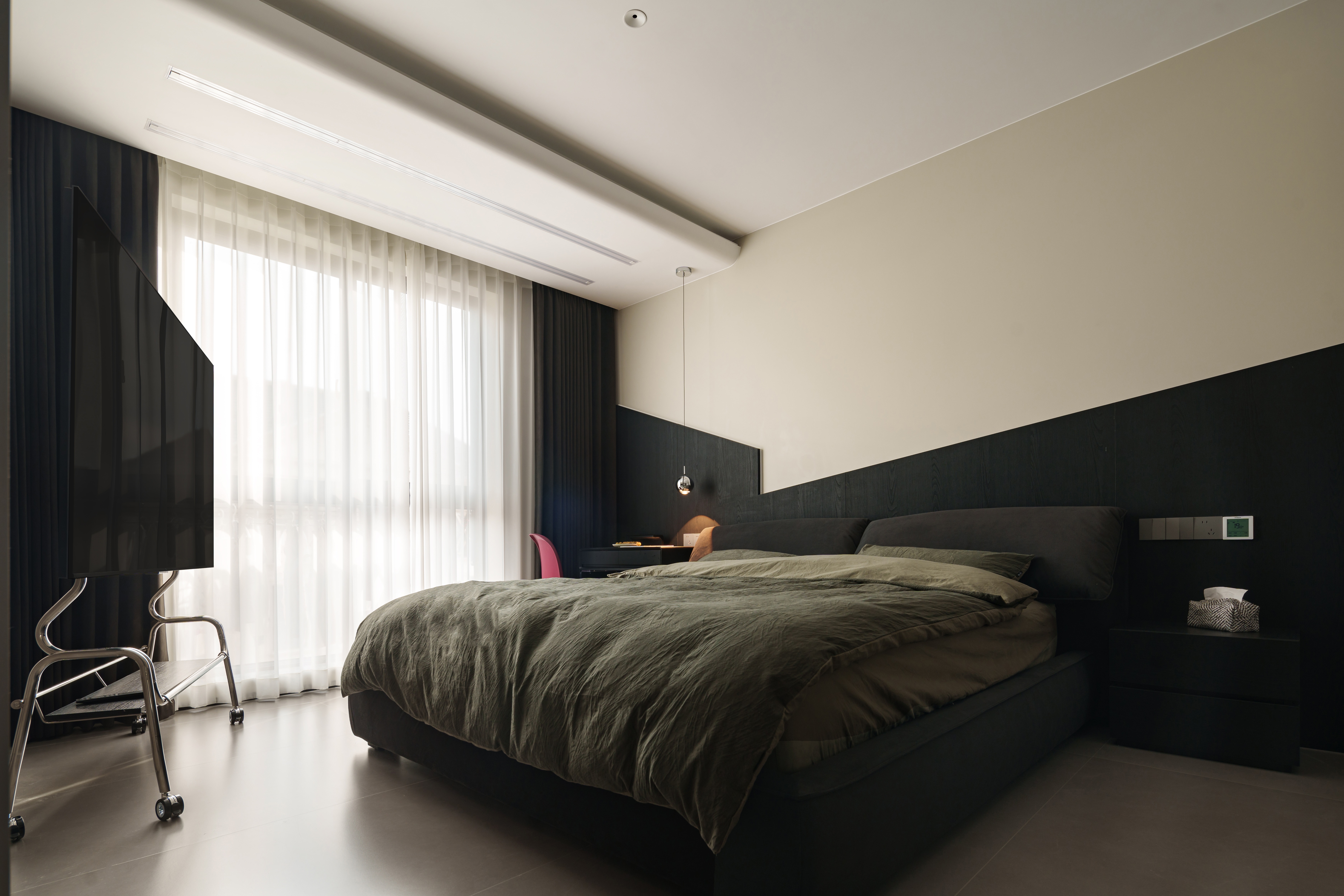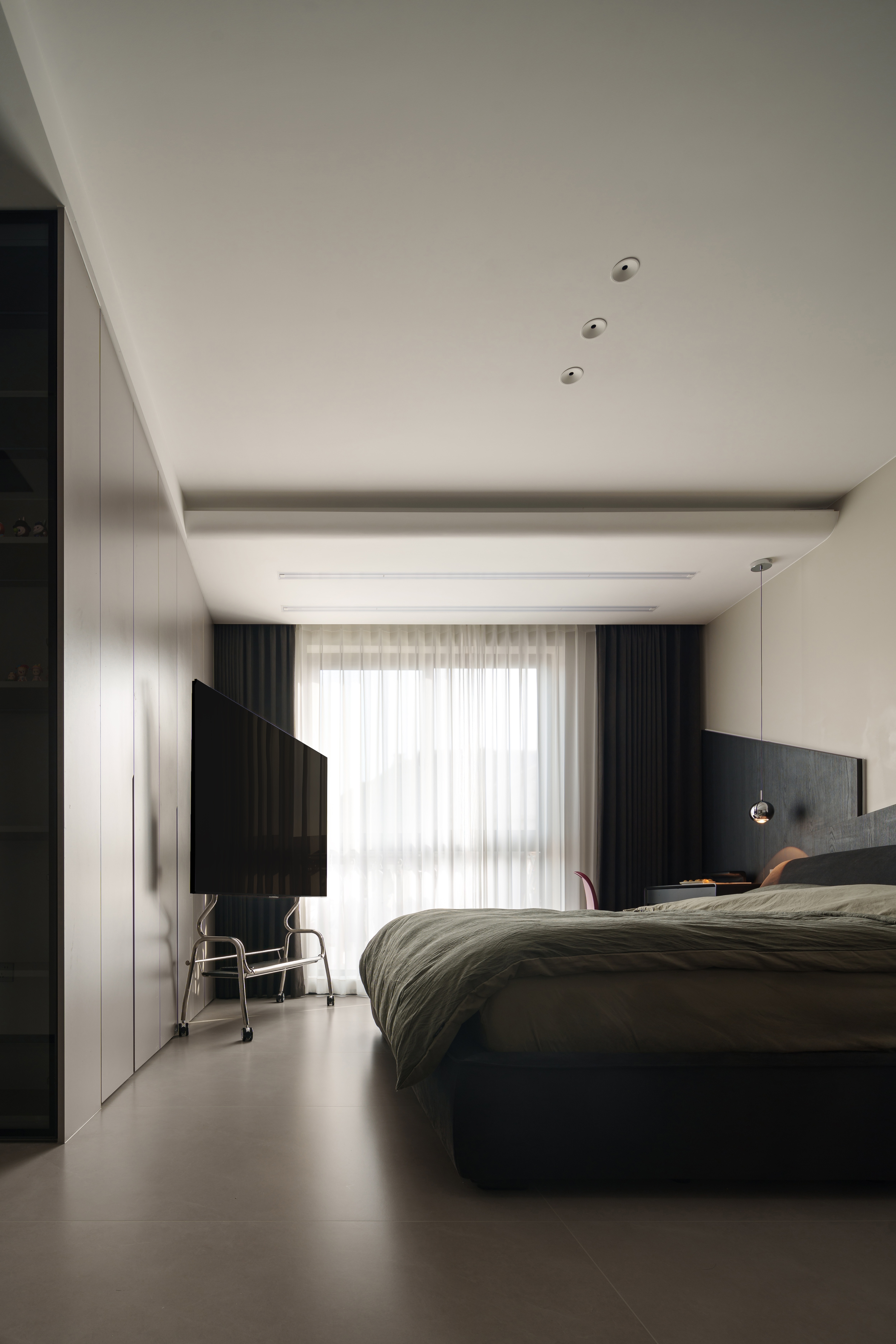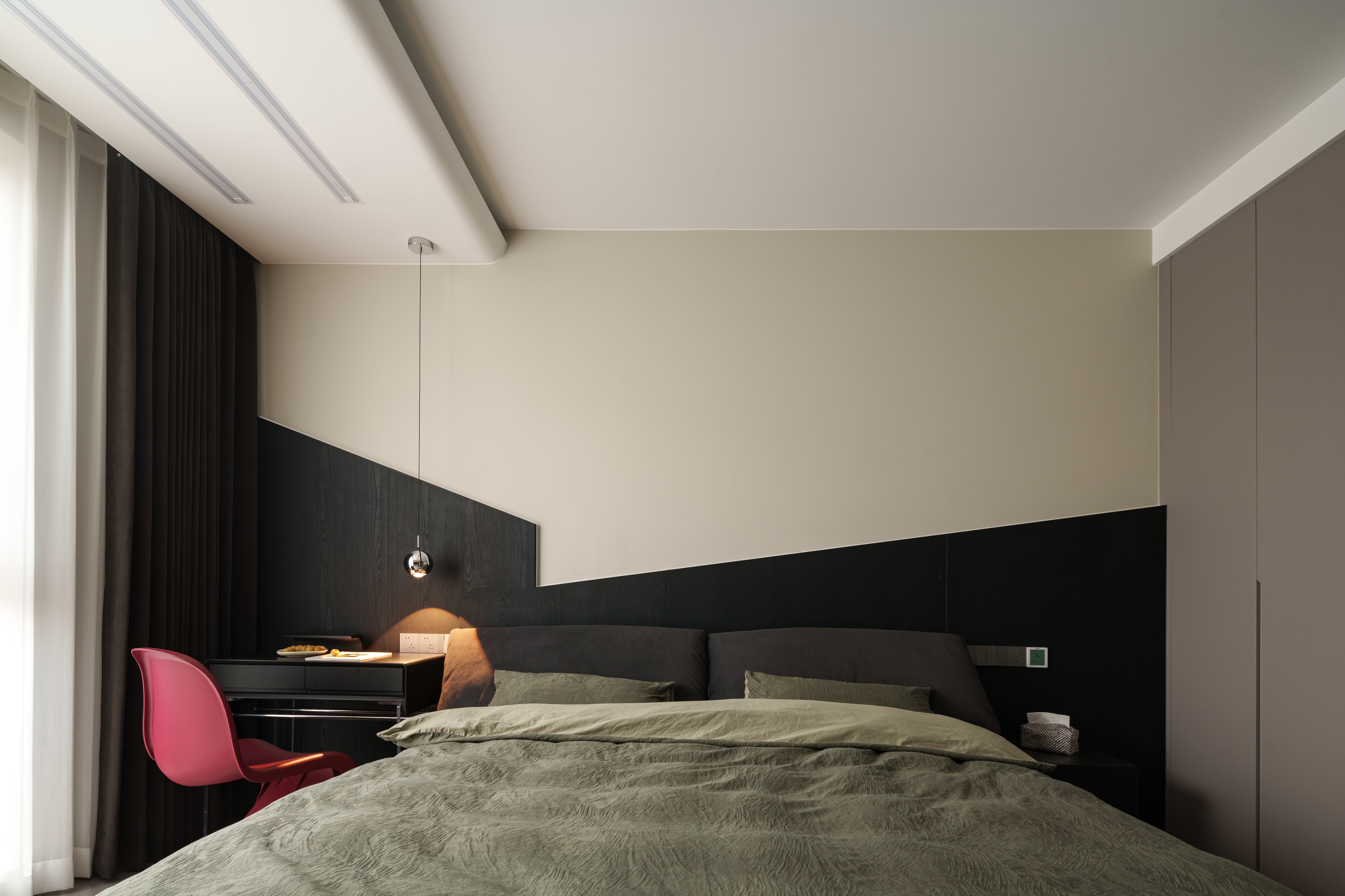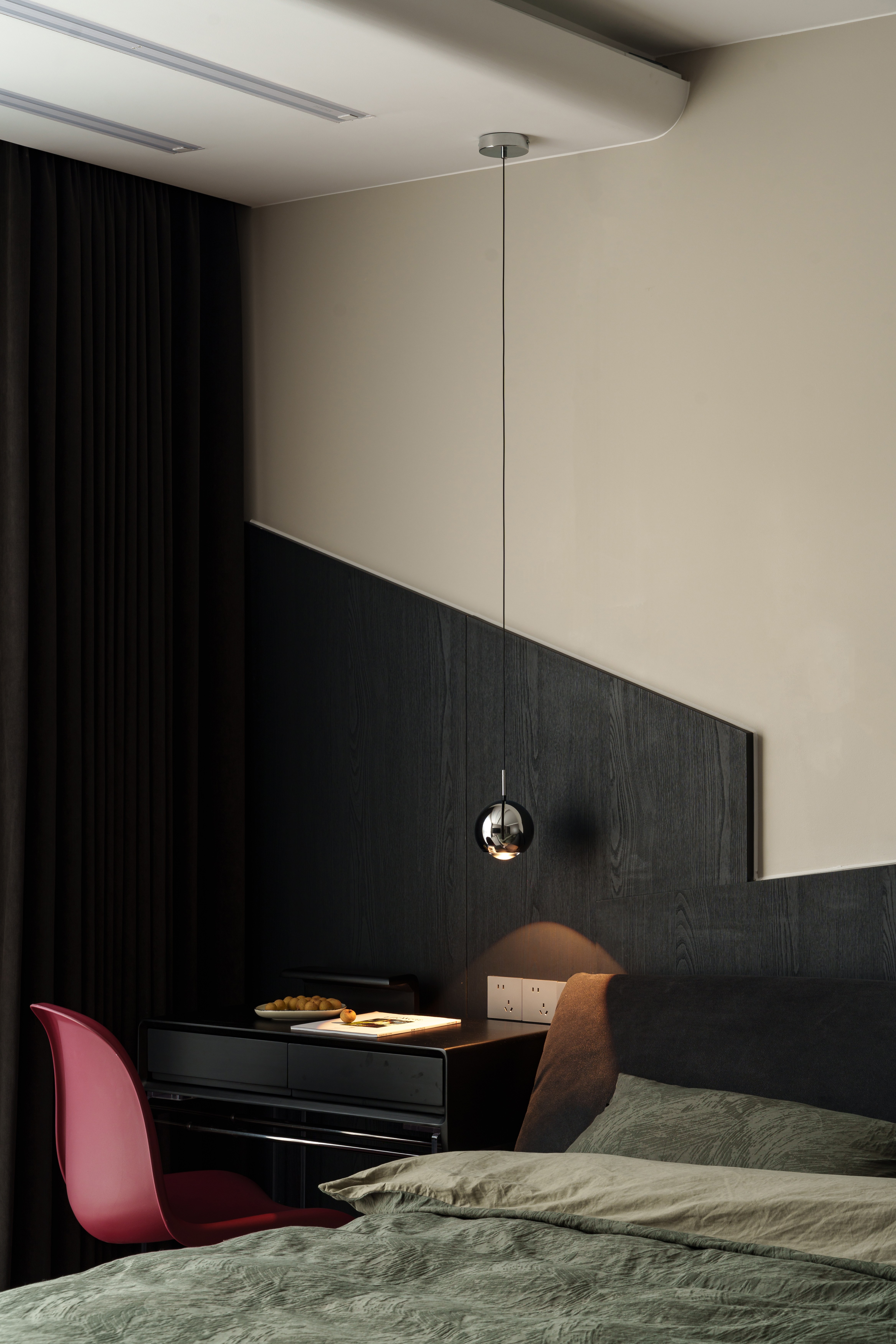 木饰面的温域里,杏色与漆黑静静分野 球形灯垂落光晕,恰似薄雾漫入绒枕 功能被细腻藏入平行 通顶衣柜化作墙体延续 移动电视架滑出半弧轨迹 床头书桌与壁面形成暗序共生 最悸动的是那抹玫红在氤氲场域划开一道甜痕 是克制语境里书写的浪漫诗行 冰冷材质裹着漫漫光晕,私密场域包含脉脉温情 这是空间与自我最紧密的交融