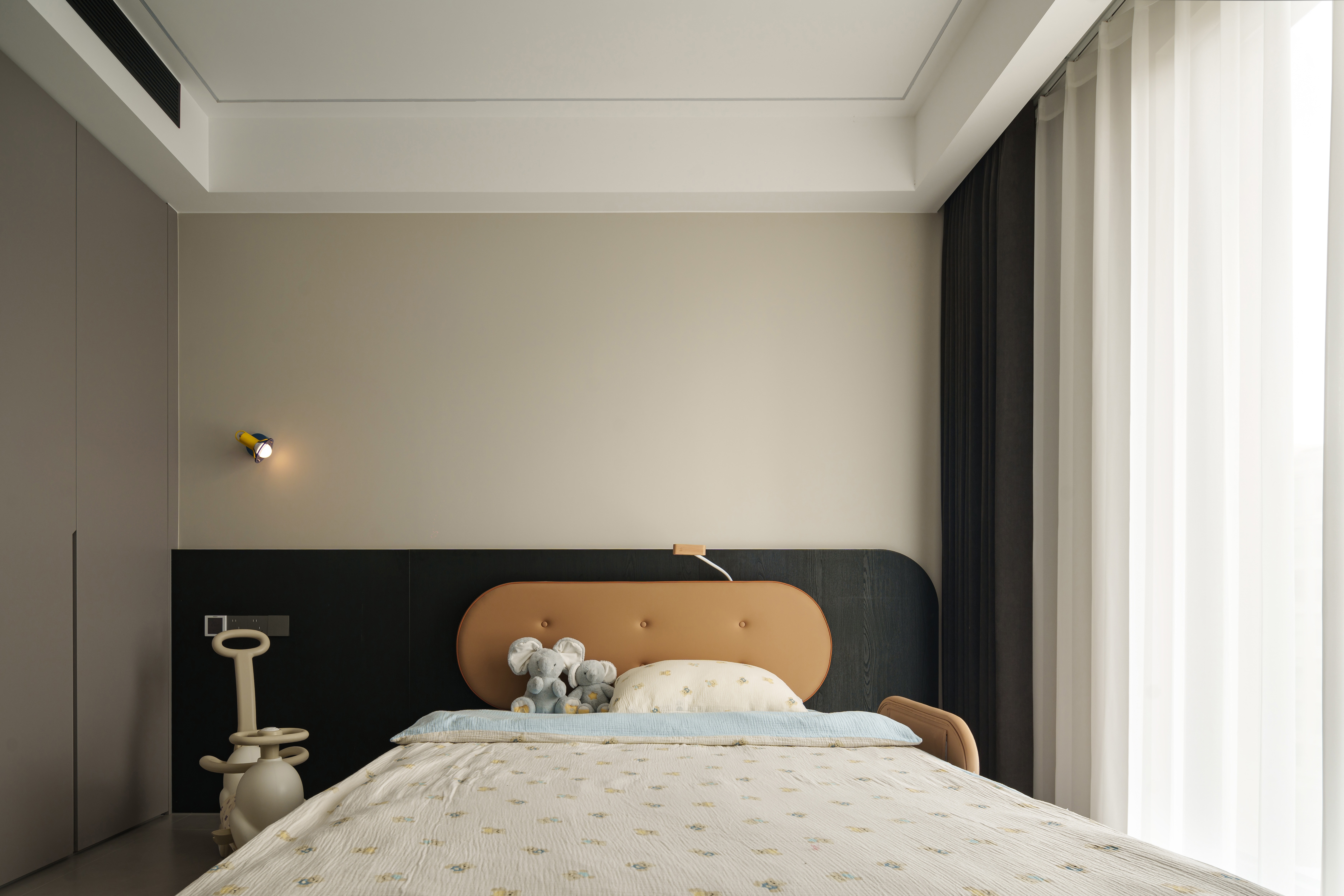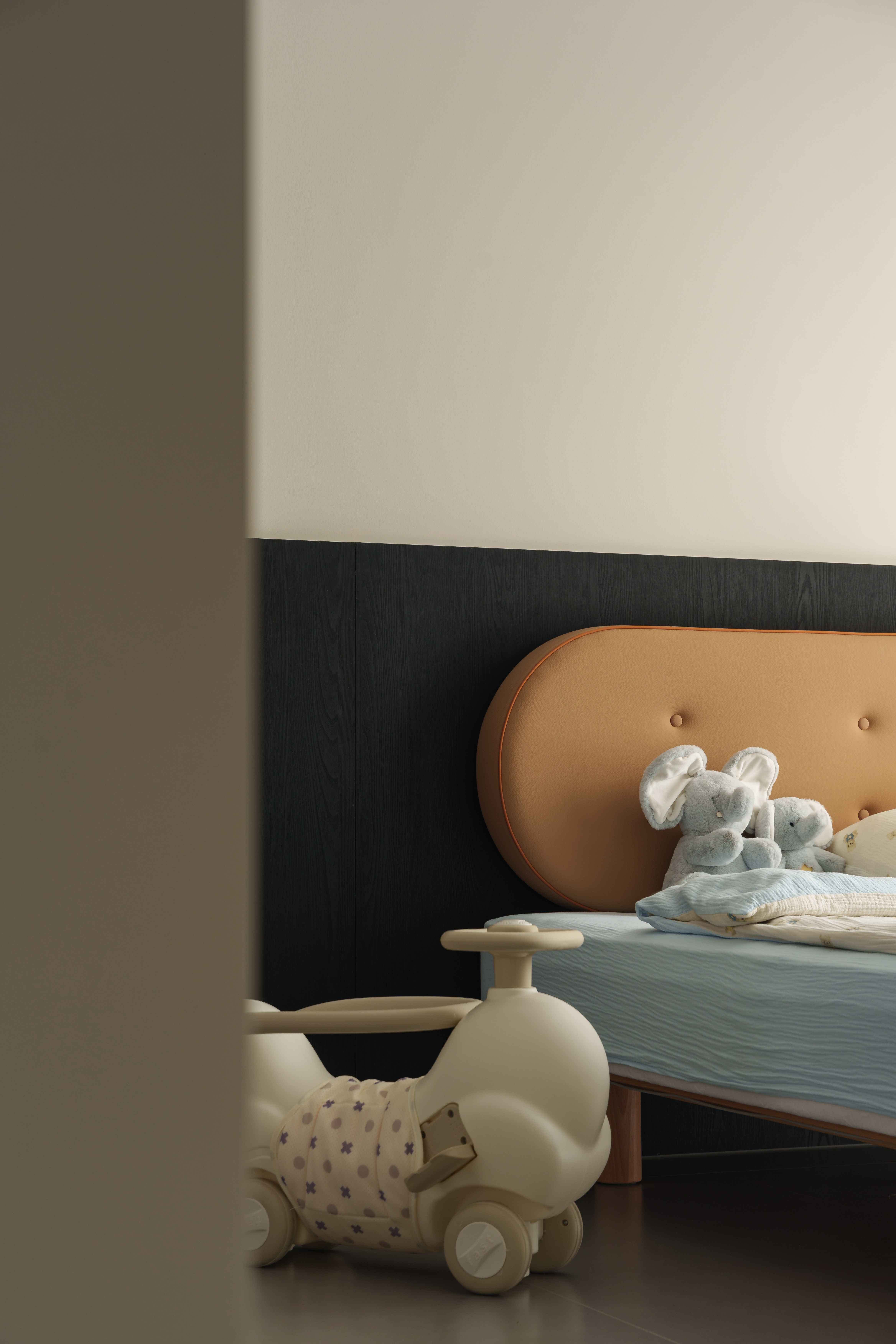 杏灰调基底中,云朵床屏陷落成蓬松的拥抱 圆润床栏的弧度,稳稳圈起梦境的岛屿 小夜灯浮起暖黄色的光晕 游戏毯上的布偶剧场,是月光下安睡的童话 柔边界守护着酣甜,微角落滋养着幻想 这是成人的周全与孩子的宇宙最温柔的盟约