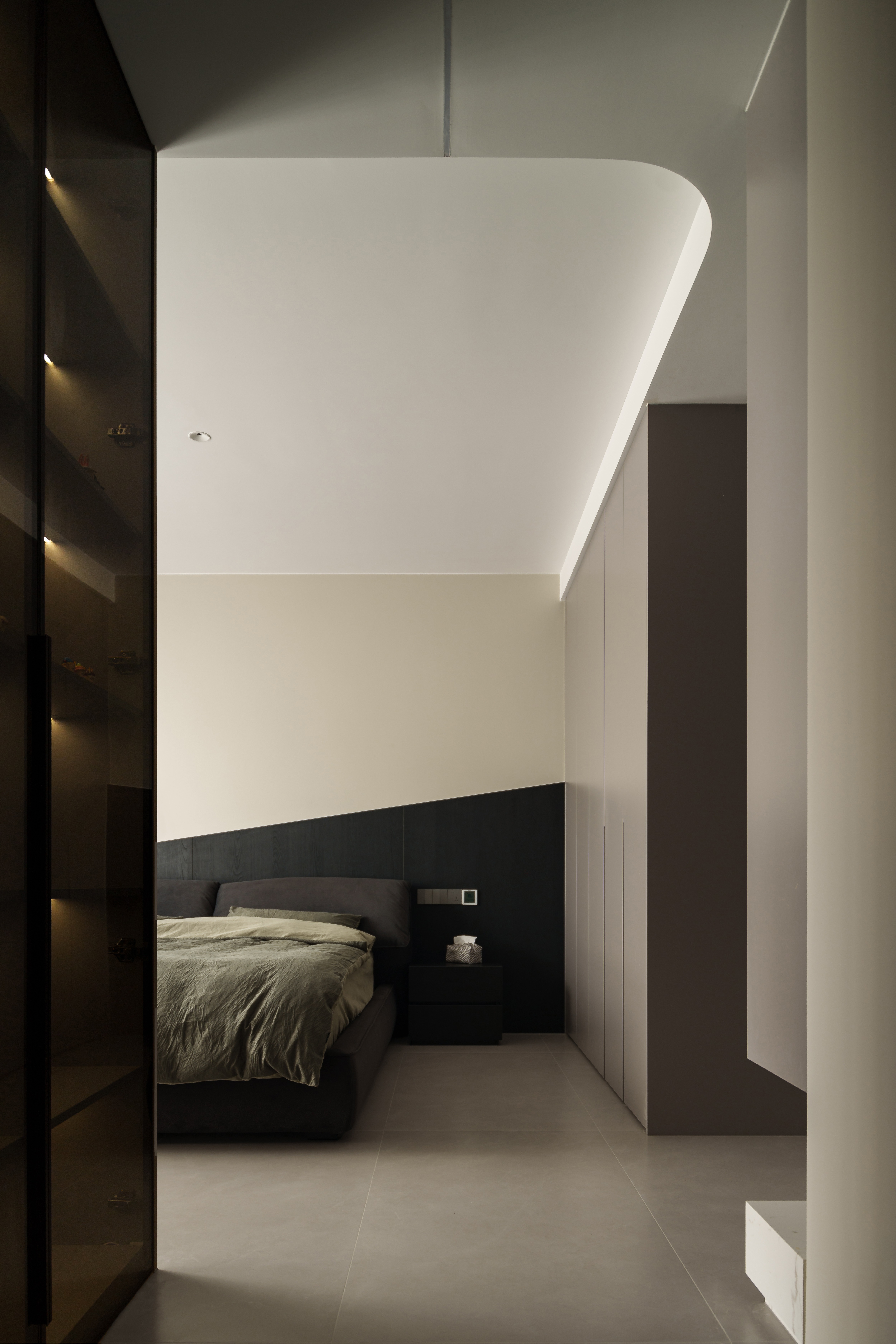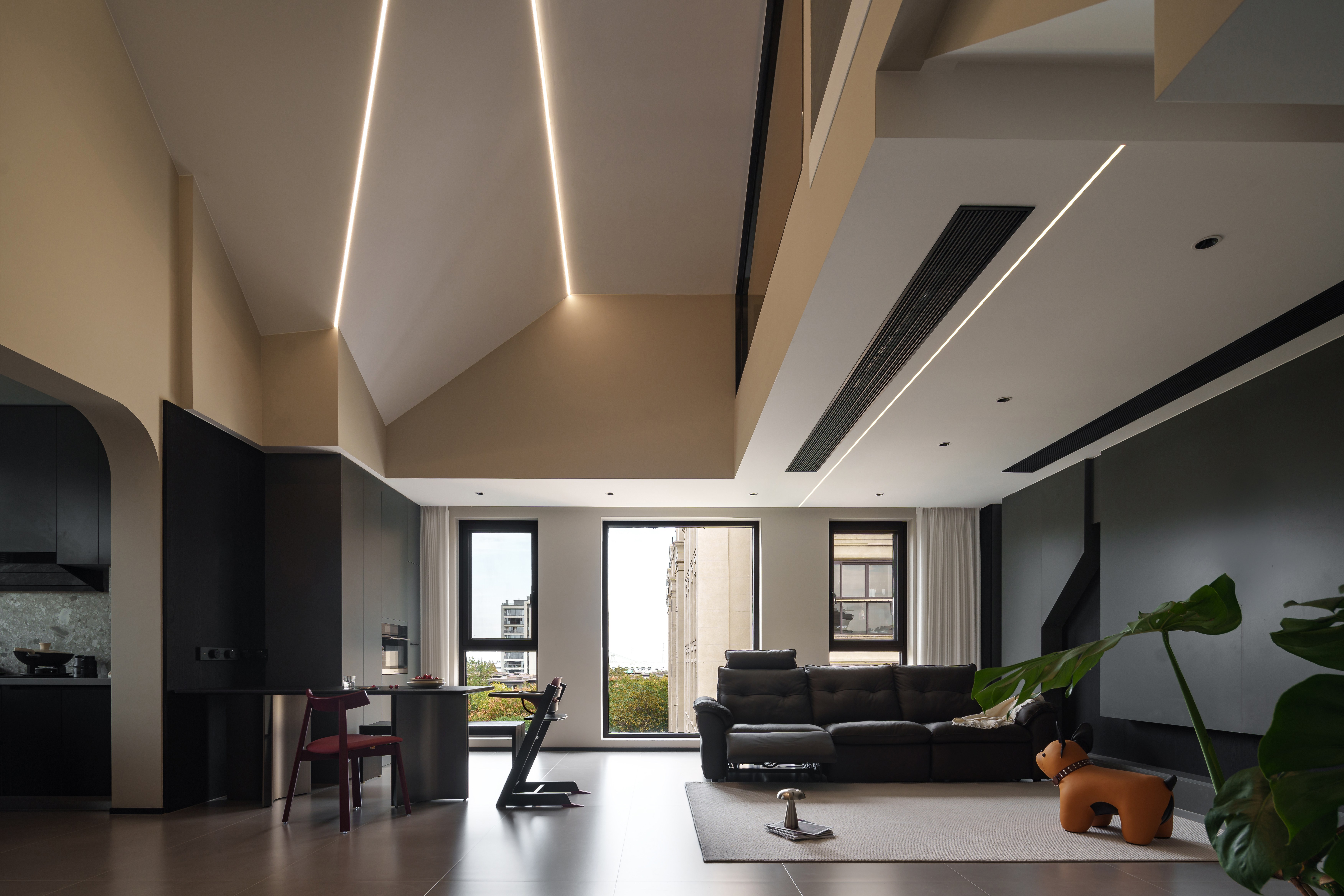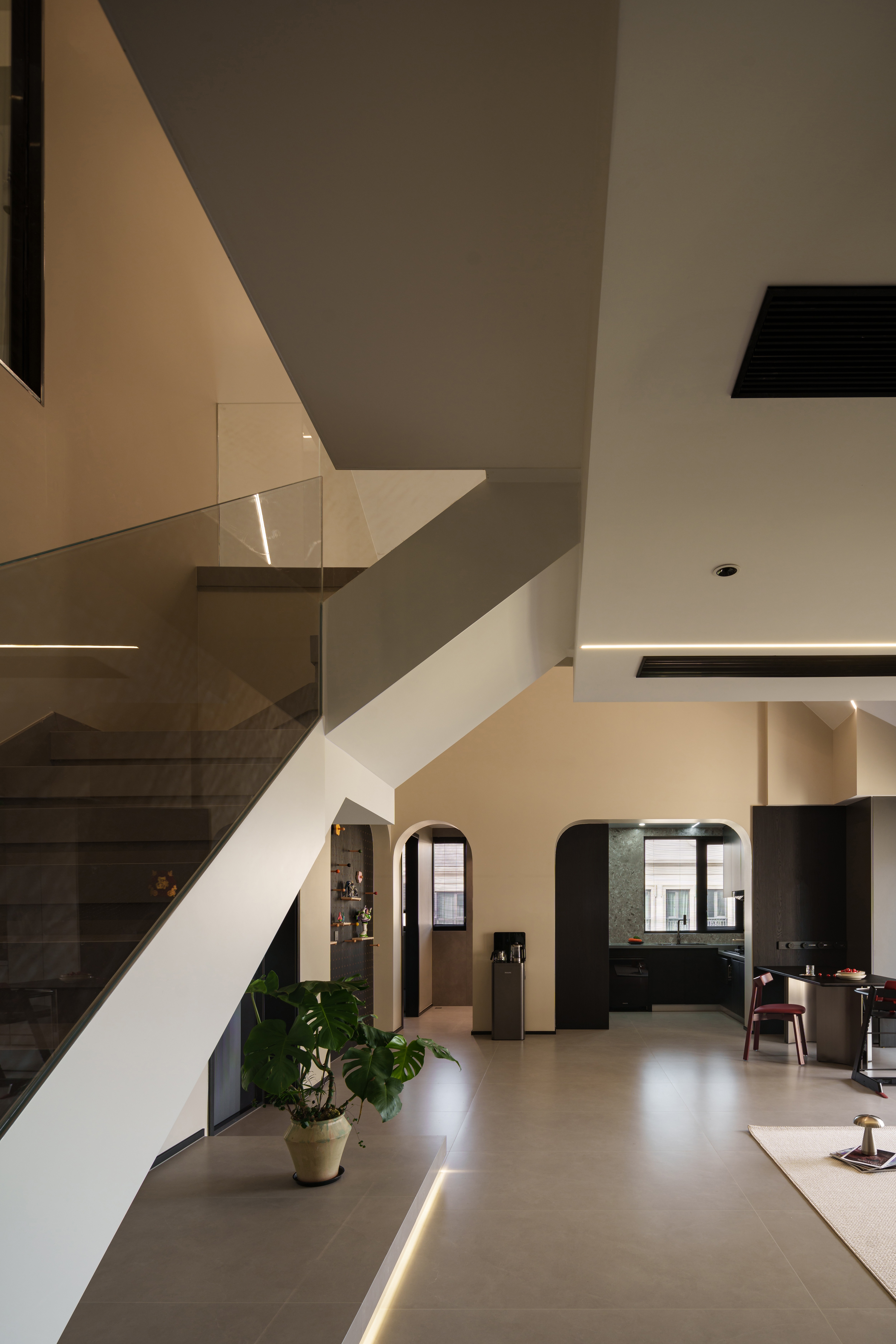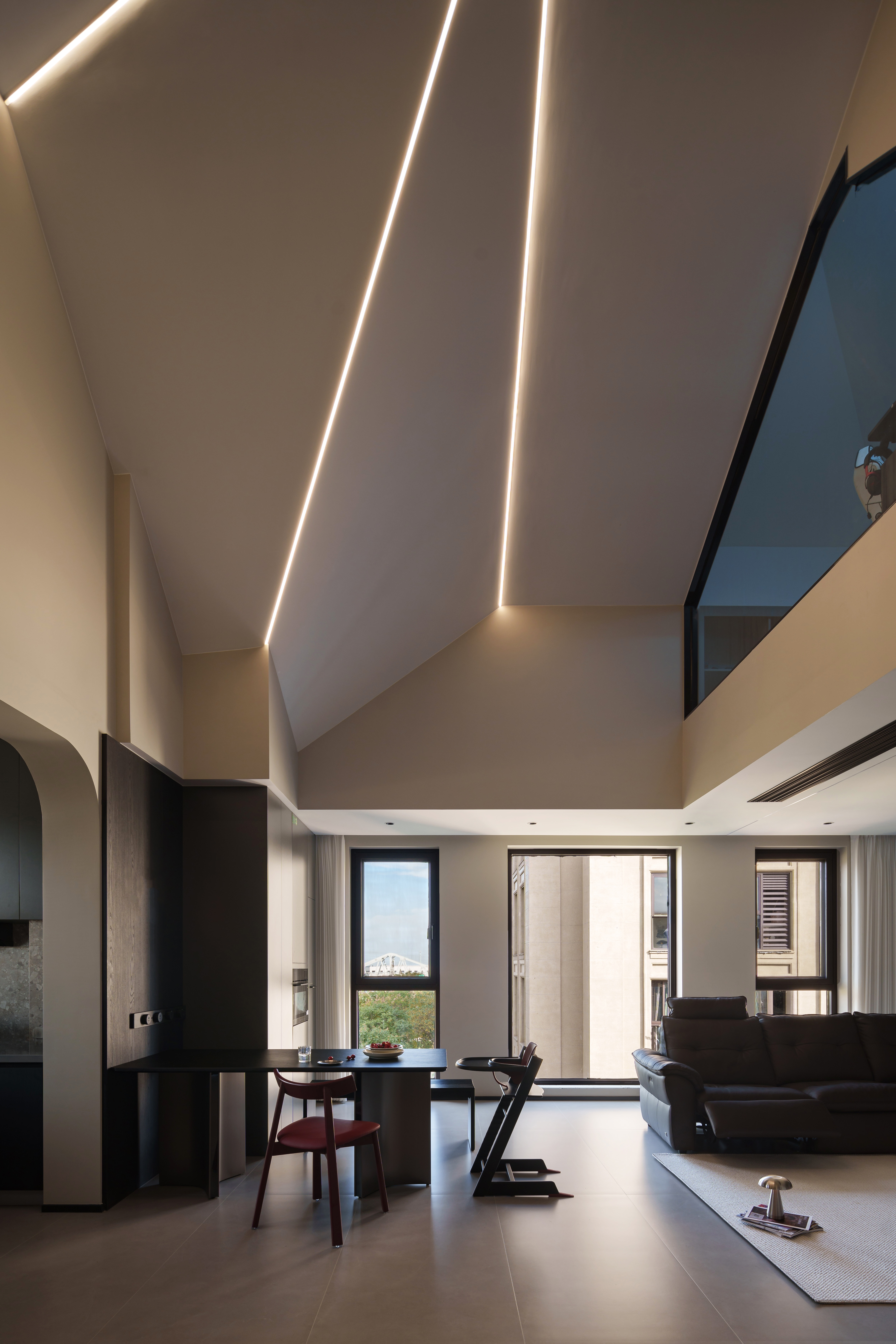 挑高斜顶的冷界里,光轨浮成一道温弧 弧形拱洞的曲线,悄然托住倾泻的暮色 悬浮光带切开顶面的静 红色餐椅的跃动,是极简中绽开的暖意 硬结构沁着柔形态,空境界酿出暖呼吸 这是空间与光线最诗意的交织