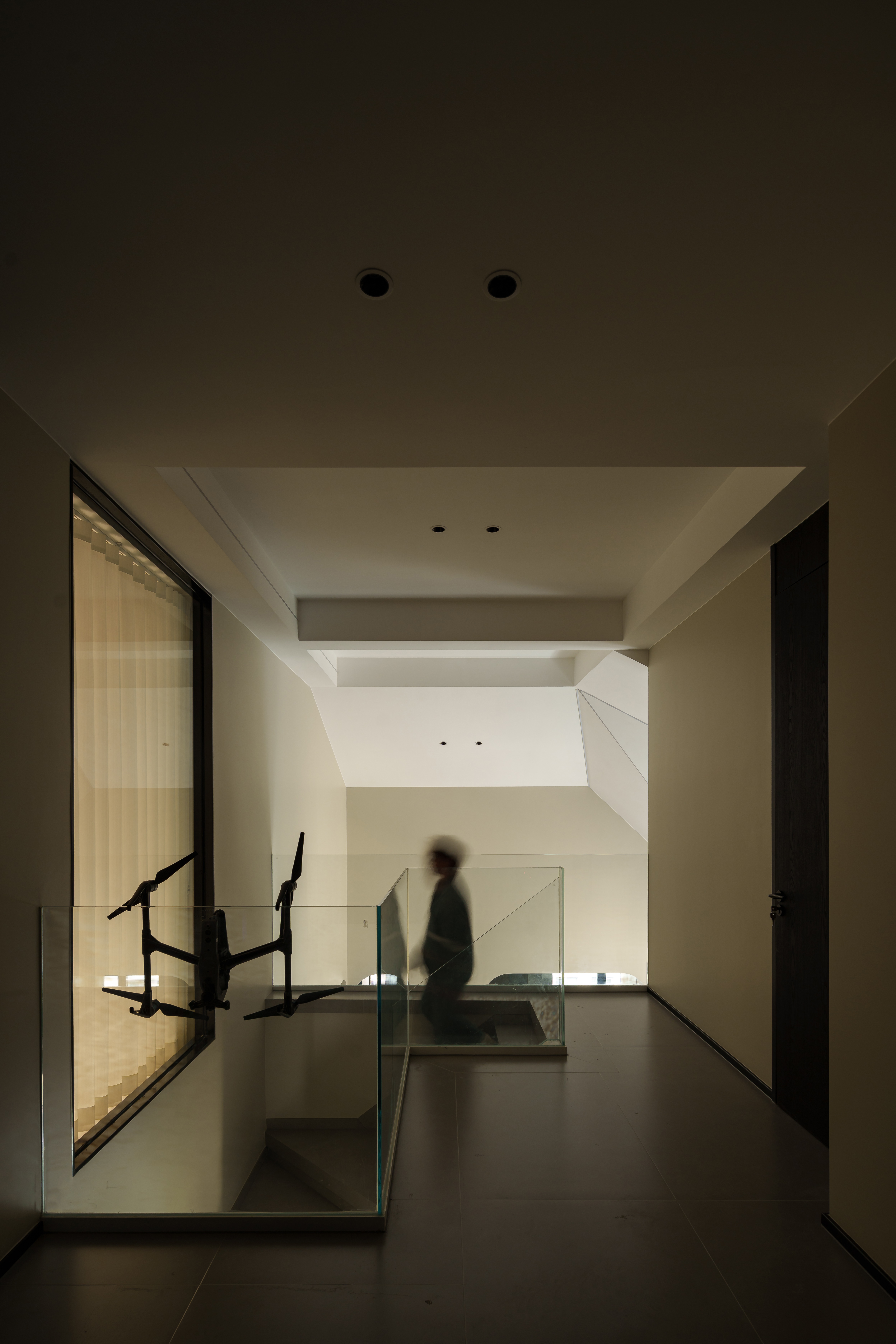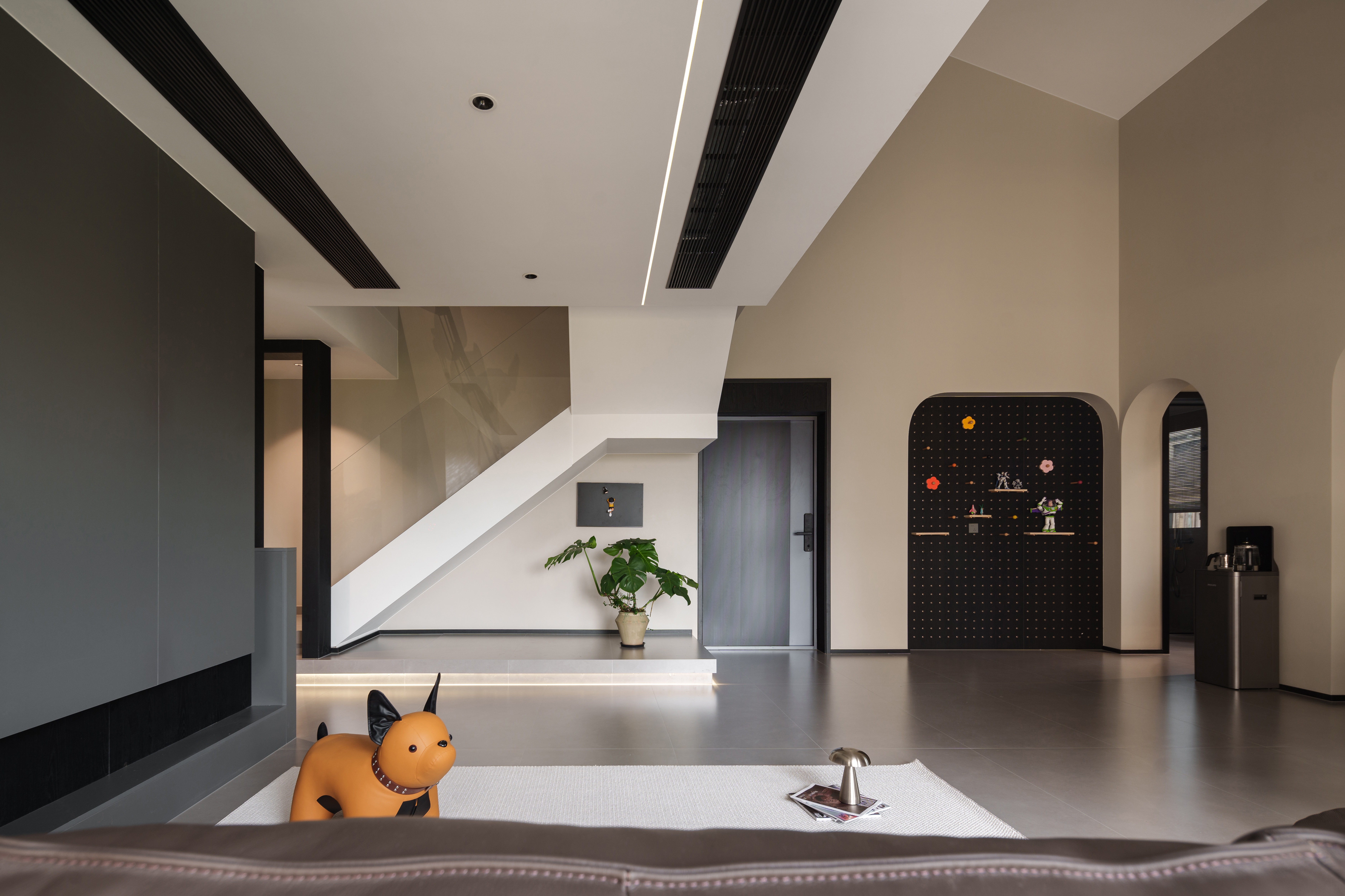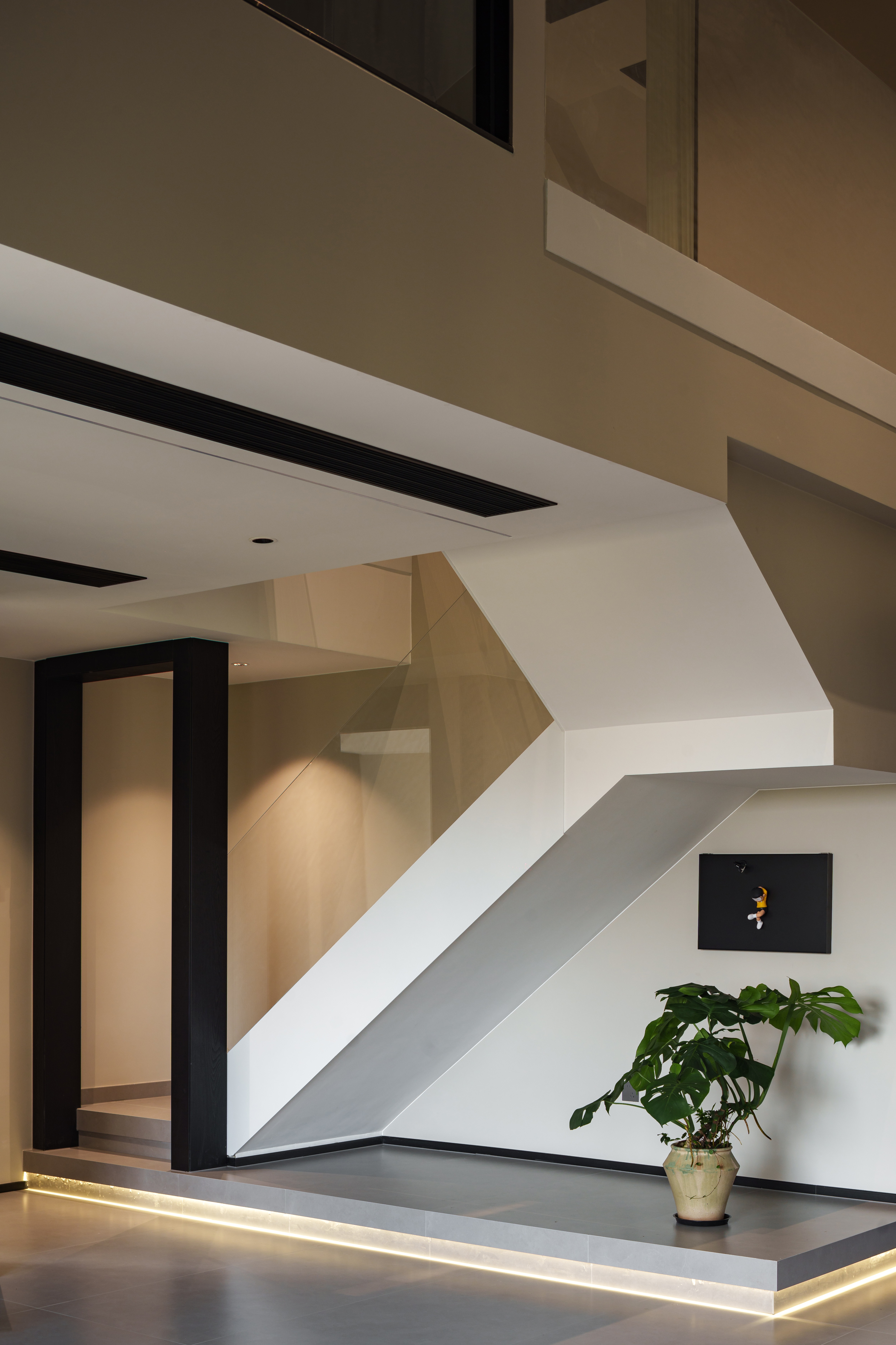 楼梯的折转面上,光带流淌成一道液态的银河 玻璃护栏的透薄,恰好托起向上生长的轻盈 入口侧畔立一道黑色框景 将阶梯裁成几何画幅,是理性维度里勾勒的秩序诗列 尖锐棱角衔着柔和光影,冷调域孵着暖生机 这是空间与日常最自在的共生