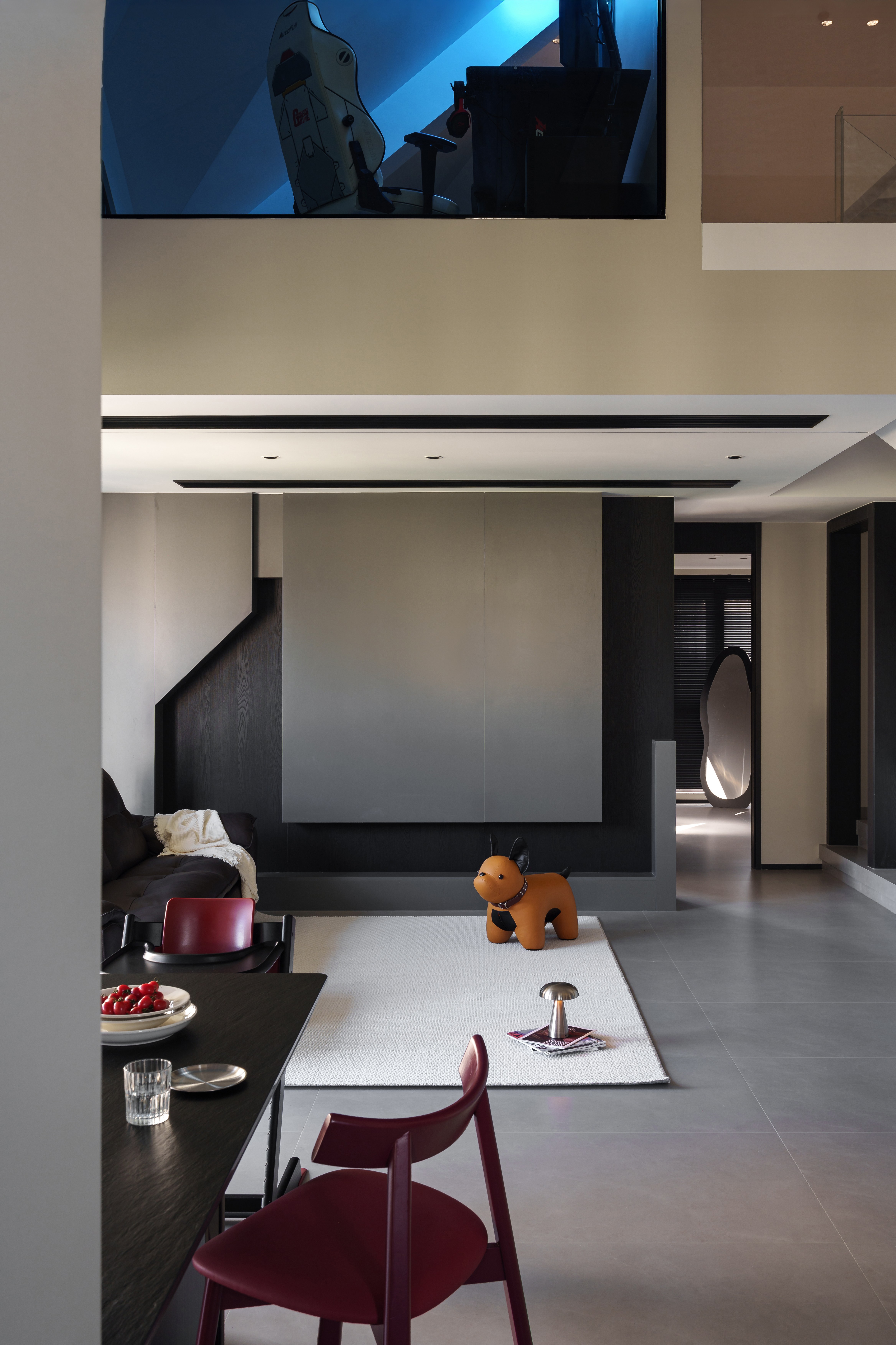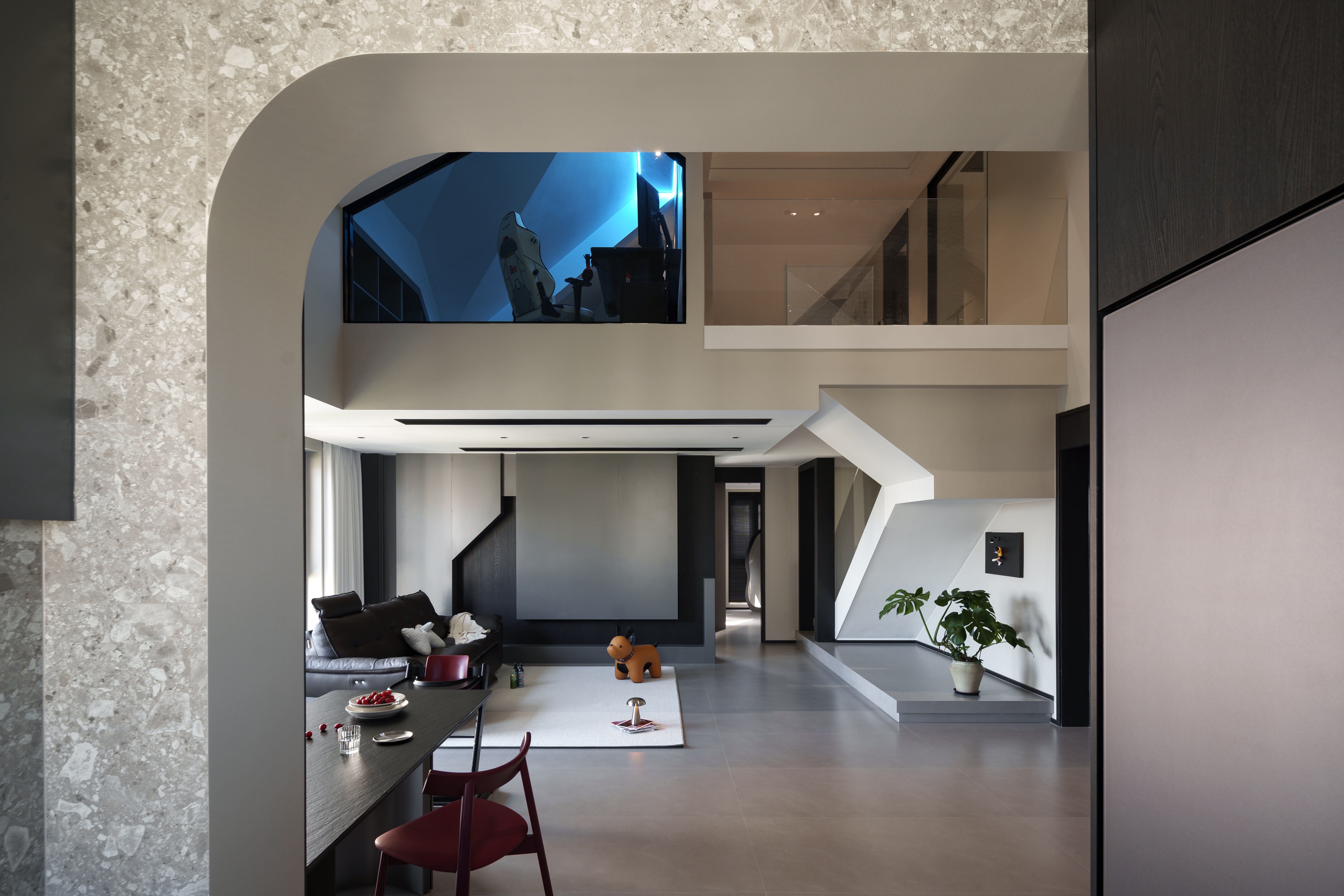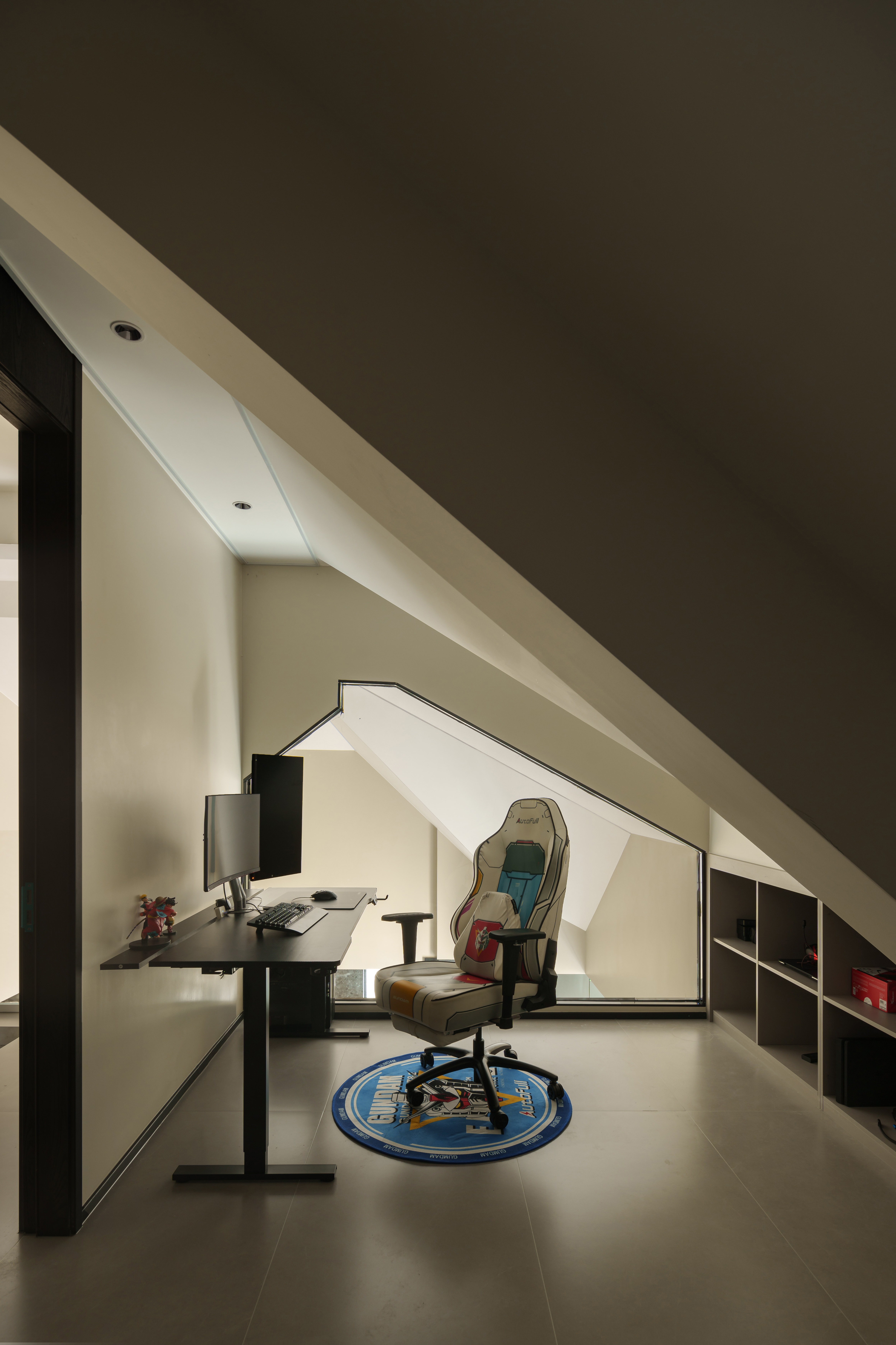 斜顶阁楼的锐角处,悬浮屏浮成一道冷冽的界 电竞椅的利落曲面,恰好承接了天窗漫入的软曦 黑色骨架框出几何窗格 将室内光影裁成明暗的秩序 为净白立面添一道克制的风景 本质结构带着微微妥协,异形场域孵化功能 这是空间与使用体验最契合的鸣奏