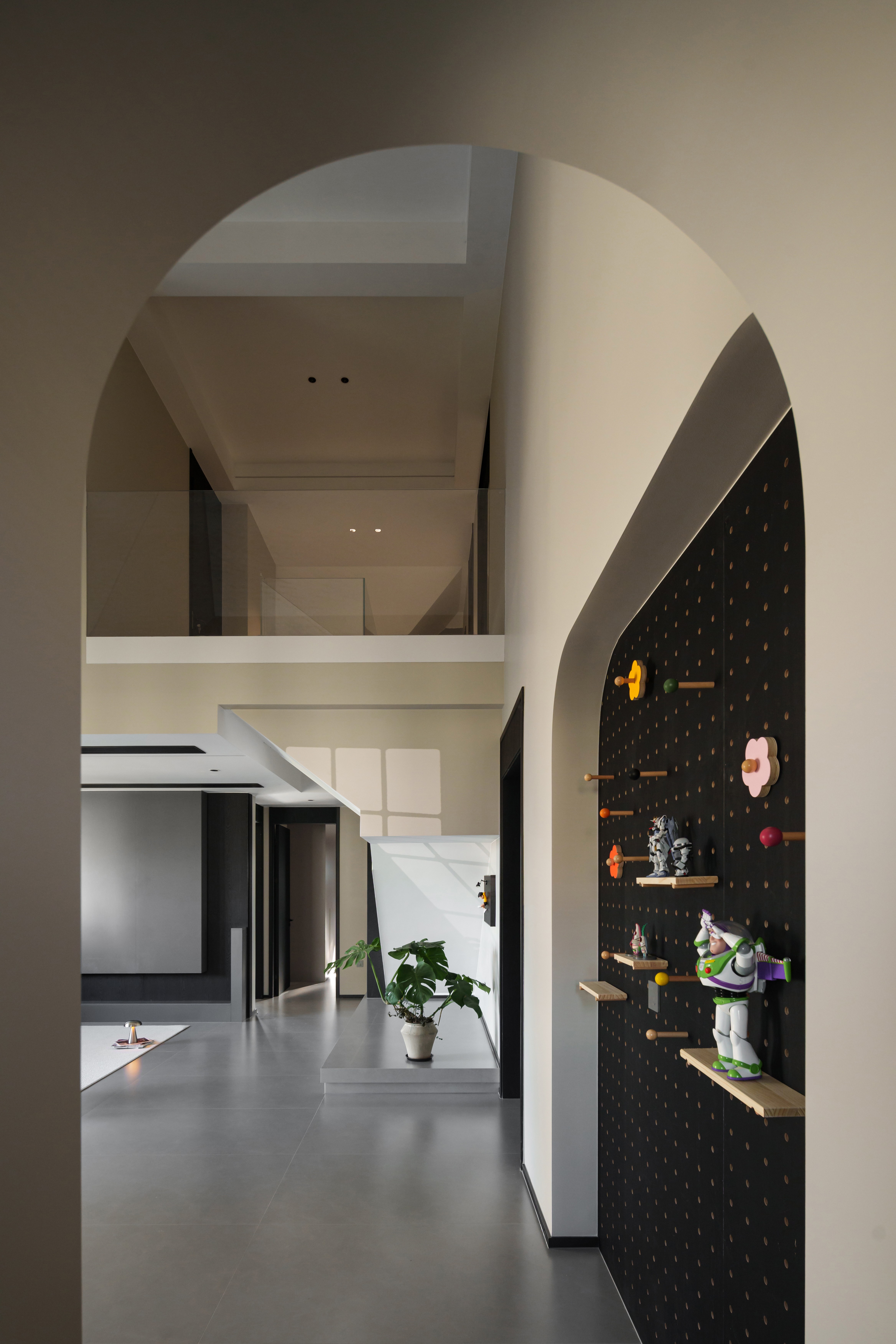 空间布局:巧用斜顶、拱洞、阶梯框景,功能隐于秩序,实现空间多维层次与通透感。