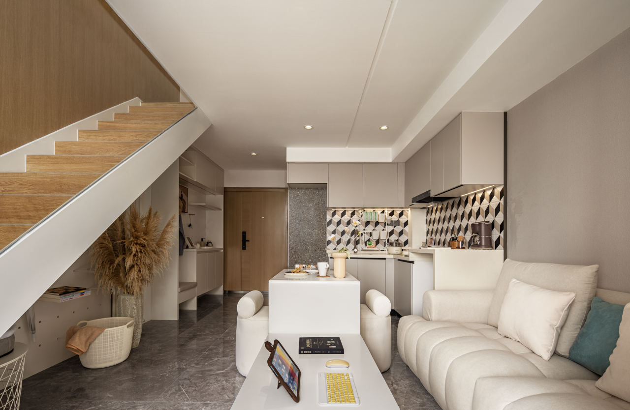 空间布局:客厅的设计非常注重简约和实用性,简洁清爽的家具摆放,功能齐全,强调充足的自然光线和明亮的色彩。