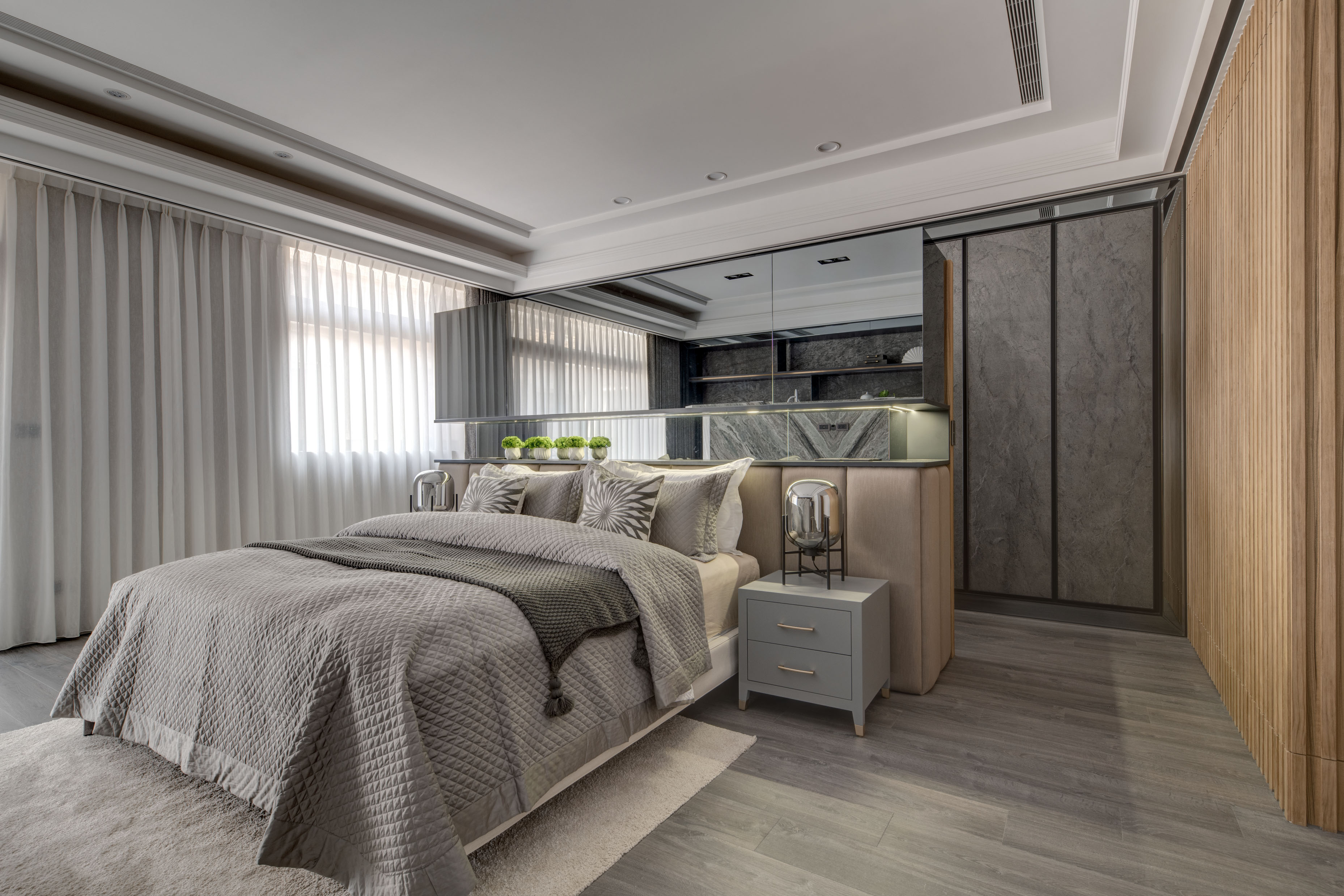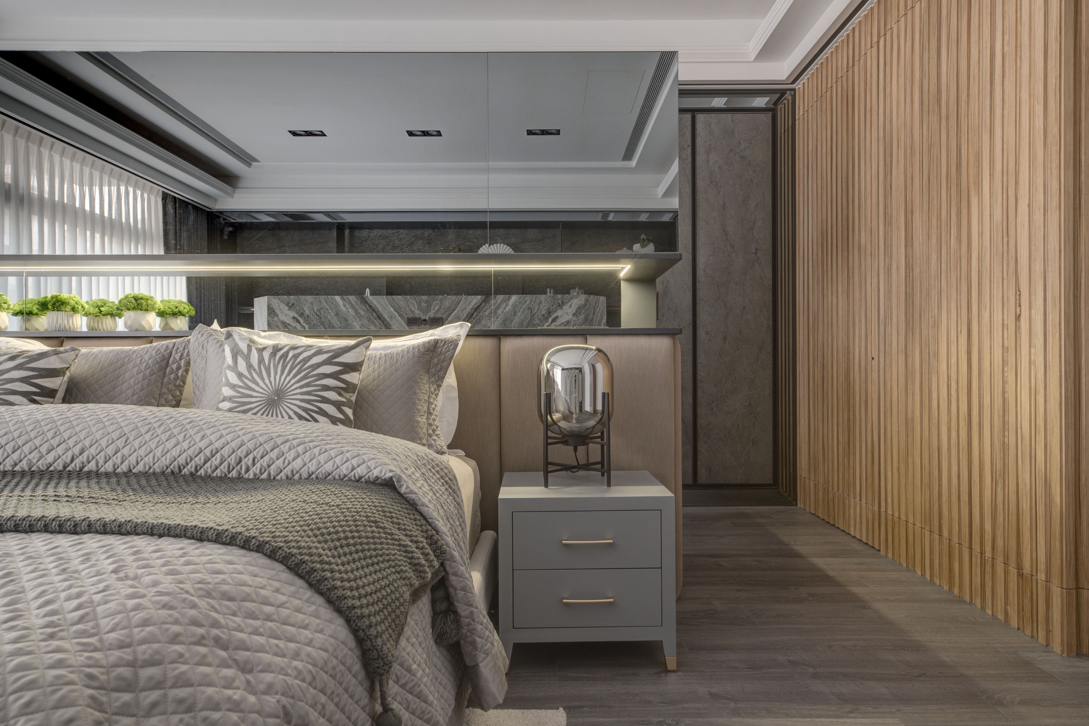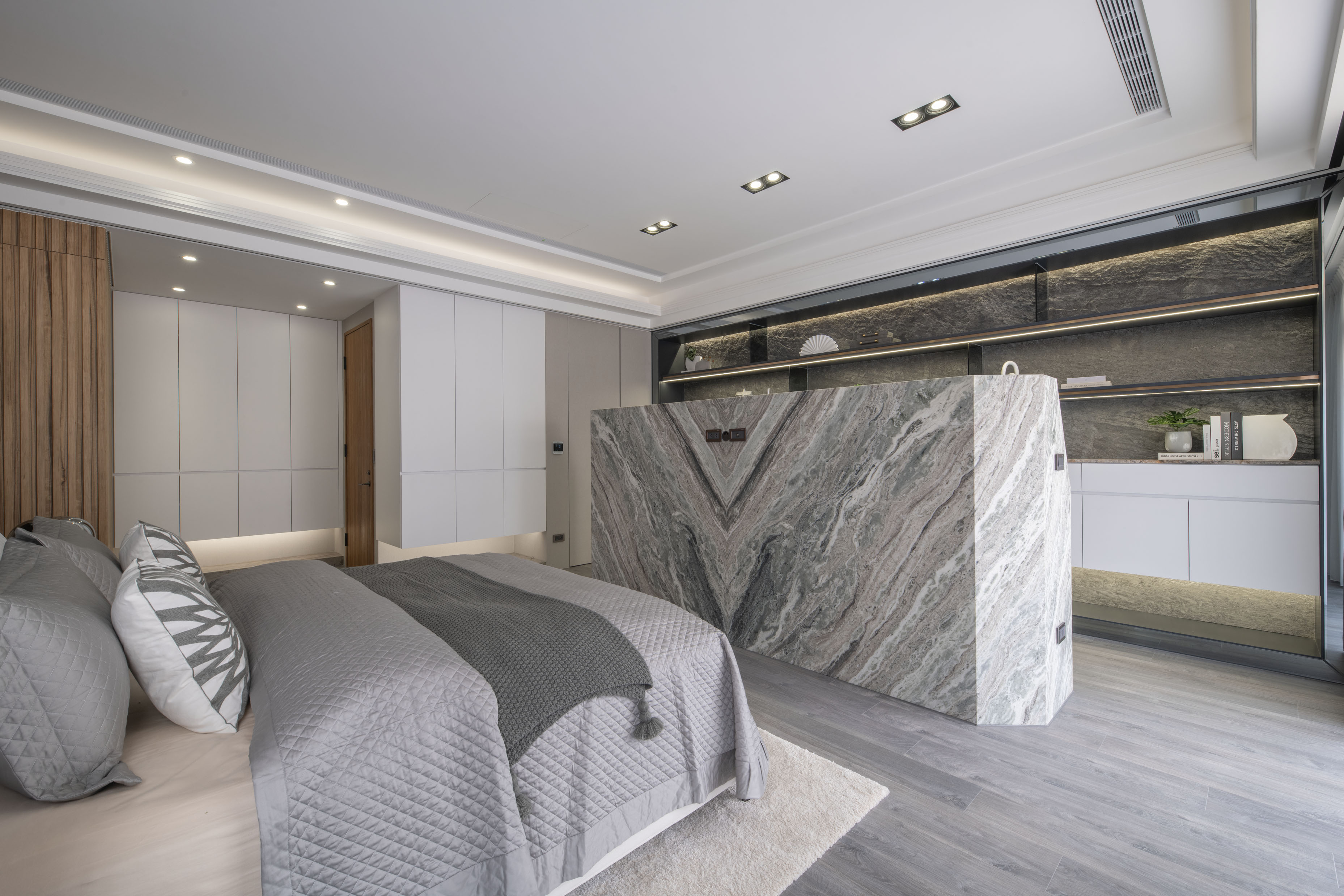 空间布局:空間佈局的創新集中在「開放但清晰分區」與「多機能量體整合」。餐、客廳以家具、矮牆及背景牆語彙自然定義區域,保持開放視野又無互相干擾;圓形餐桌被置於空間中心,搭配雕塑感吊燈,形成全宅動線的核心。主臥採用結合床頭背板、收納、展示與隔間功能的量體,使更衣區與睡眠區既界定又連續,打破傳統厚實隔牆,拓展視覺深度並提升空間彈性。
